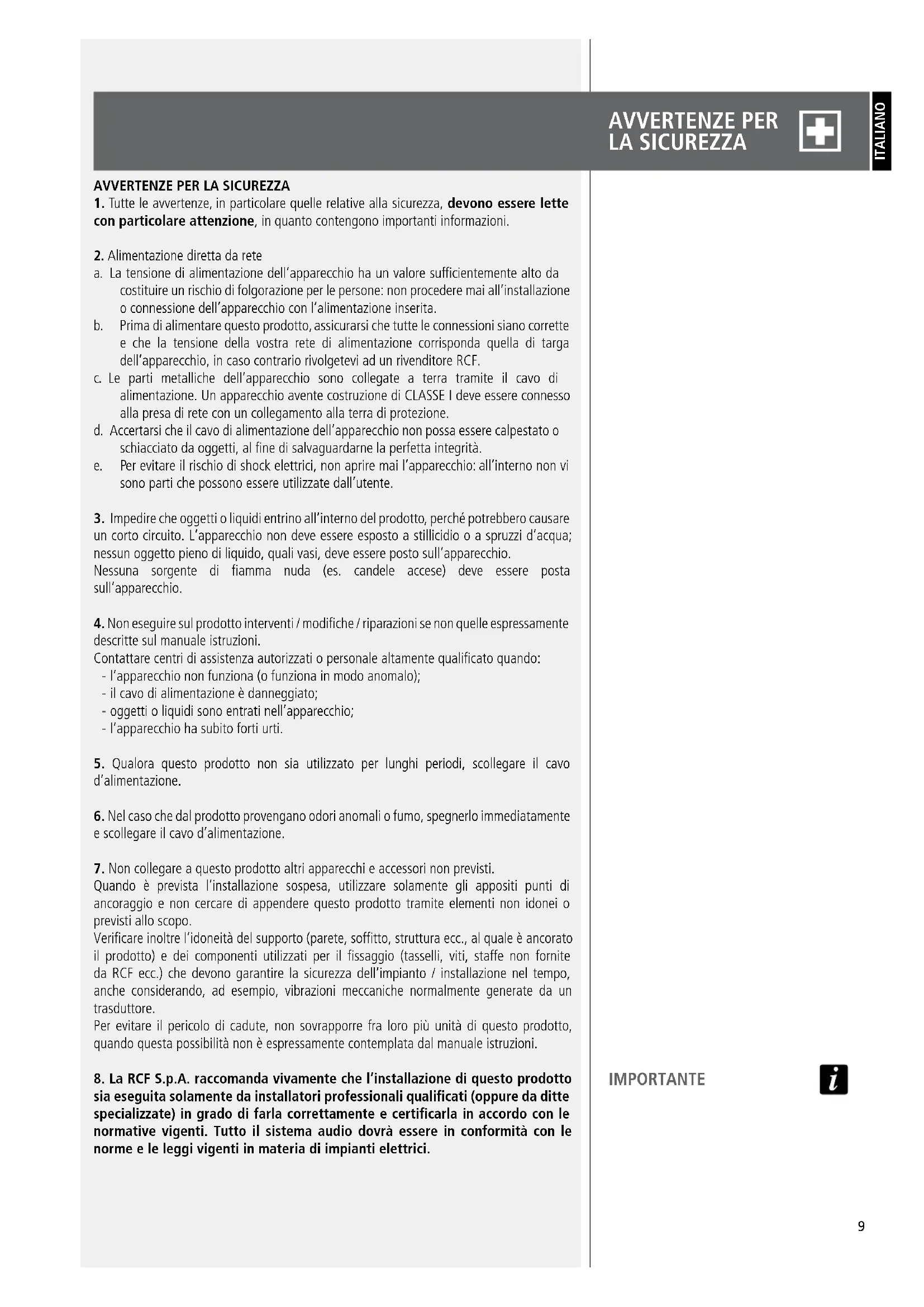 8. La RCF S.p.A. raccomanda vivamente che l’installazione di questo prodotto