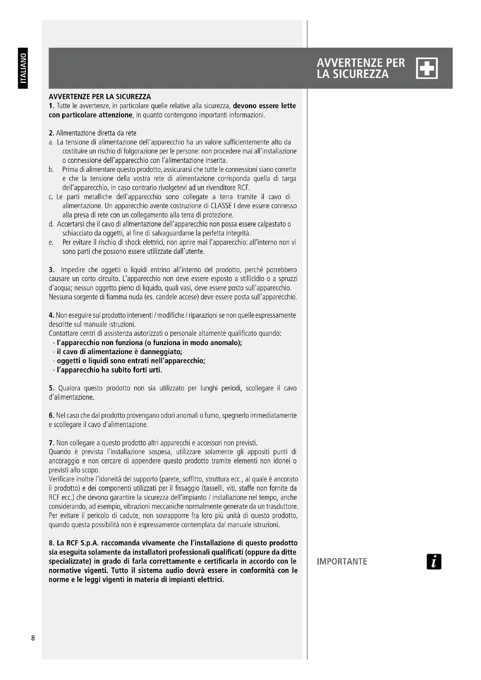 8. La RCF S.p.A. raccomanda vivamente che l’installazione di questo prodotto
