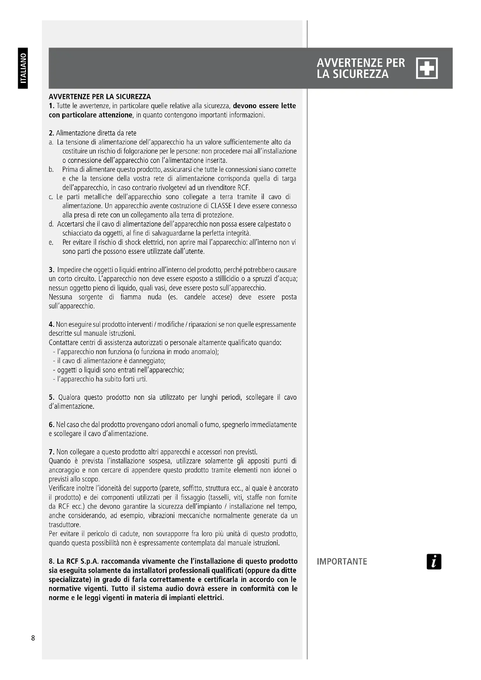 8. La RCF S.p.A. raccomanda vivamente che l’installazione di questo prodotto