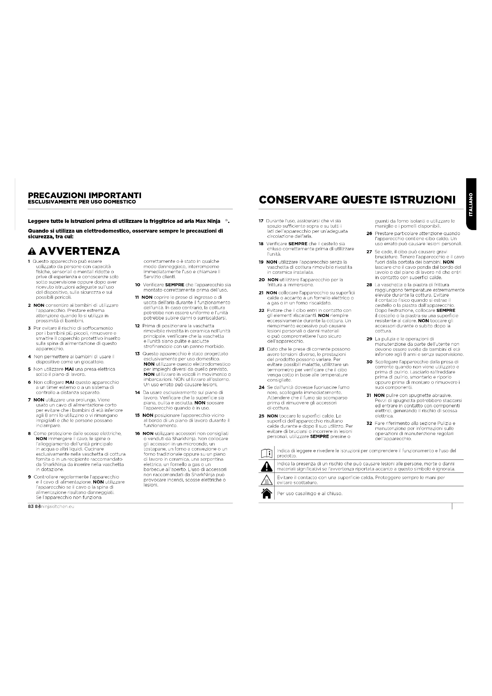 Quando si utilizza un elettrodomestico, osservare sempre le precauzioni di sicurezza, tra cui: AVVERTENZA 1 Questo apparecchio può essere utilizzato da persone con capacità fisiche, sensoriali o mentali ridotte o prive di esperienza e conoscenze solo sotto supervisione oppure dopo aver ricevuto istruzioni adeguate sull’uso del dispositivo, sulla sicurezza e sui possibili pericoli. 2 NON consentire ai bambini di utilizzare l’apparecchio. Prestare estrema attenzione quando lo si utilizza in prossimità di bambini. 3 Per evitare il rischio di soocamento per i bambini più piccoli, rimuovere e smaltire il coperchio protettivo inserito sulla spina di alimentazione di questo apparecchio. 4 Non permettere ai bambini di usare il dispositivo come un giocattolo. 5 Non utilizzare MAI una presa elettrica sotto il piano di lavoro. 6 Non collegare MAI questo apparecchio a un timer esterno o a un sistema di controllo a distanza separato. 7 NON utilizzare una prolunga. Viene usato un cavo di alimentazione corto per evitare che i bambini di età inferiore agli 8 anni lo utilizzino o vi rimangano impigliati e che le persone possano inciampare. 8 Come protezione dalle scosse elettriche, NON immergere il cavo, le spine o l’alloggiamento dell’unità principale in acqua o altri liquidi. Cucinare esclusivamente nella vaschetta di cottura fornita o in un recipiente raccomandato da SharkNinja da inserire nella vaschetta in dotazione. 9 Controllare regolarmente l’apparecchio e il cavo di alimentazione. NON utilizzare l’apparecchio se il cavo o la spina di alimentazione risultano danneggiati. Se l’apparecchio non funziona correttamente o è stato in qualche modo danneggiato, interromperne immediatamente l’uso e chiamare il Servizio clienti. 10 Verificare SEMPRE che l’apparecchio sia montato correttamente prima dell’uso. 11 NON coprire le prese di ingresso o di uscita dell’aria durante il funzionamento dell’unità. In caso contrario, la cottura potrebbe non essere uniforme e l’unità potrebbe subire danni o surriscaldarsi. 12 Prima di posizionare la vaschetta rimovibile rivestita in ceramica nell’unità principale, verificare che la vaschetta e l’unità siano pulite e asciutte strofinandole con un panno morbido. 13 Questo apparecchio è stato progettato esclusivamente per uso domestico. NON utilizzare questo elettrodomestico per impieghi diversi da quello previsto. NON utilizzare in veicoli in movimento o imbarcazioni. NON utilizzare all’esterno. Un uso errato può causare lesioni. 14 Da usare esclusivamente sul piano di lavoro. Verificare che la superficie sia piana, pulita e asciutta. NON sposare l’apparecchio quando è in uso. 15 NON posizionare l’apparecchio vicino al bordo di un piano di lavoro durante il funzionamento. 16 NON utilizzare accessori non consigliati o venduti da SharkNinja. Non collocare gli accessori in un microonde, un tostapane, un forno a convezione o un forno tradizionale oppure su un piano di lavoro in ceramica, una serpentina elettrica, un fornello a gas o un barbecue all’aperto. L’uso di accessori non raccomandati da SharkNinja può provocare incendi, scosse elettriche o lesioni. 17 Durante l’uso, assicurarsi che vi sia spazio suciente sopra e su tutti i lati dell’apparecchio per un’adeguata circolazione dell’aria. 18 Verificare SEMPRE che il cestello sia chiuso correttamente prima di utilizzare l’unità. 19 NON utilizzare l’apparecchio senza la vaschetta di cottura rimovibile rivestita in ceramica installata. 20 NON utilizzare l’apparecchio per la frittura a immersione. 21 NON collocare l’apparecchio su superfici calde o accanto a un fornello elettrico o a gas o in un forno riscaldato. 22 Evitare che il cibo entri in contatto con gli elementi riscaldanti. NON riempire eccessivamente durante la cottura. Un riempimento eccessivo può causare lesioni personali o danni materiali o può compromettere l’uso sicuro dell’apparecchio. 23 Dato che le prese di corrente possono avere tensioni diverse, le prestazioni del prodotto possono variare. Per evitare possibili malattie, utilizzare un termometro per verificare che il cibo venga cotto in base alle temperature consigliate. 24 Se dall’unità dovesse fuoriuscire fumo nero, scollegarla immediatamente. Attendere che il fumo sia scomparso prima di rimuovere gli accessori di cottura. 25 NON toccare le superfici calde. Le superfici dell’apparecchio risultano calde durante e dopo il suo utilizzo. Per evitare di bruciarsi o incorrere in lesioni personali, utilizzare SEMPRE presine o guanti da forno isolanti e utilizzare le maniglie e i pomelli disponibili. 26 Prestare particolare attenzione quando l’apparecchio contiene cibo caldo. Un uso errato può causare lesioni personali. 27 Se cade, il cibo può causare gravi bruciature. Tenere l’apparecchio e il cavo fuori dalla portata dei bambini. NON lasciare che il cavo penda dal bordo del tavolo o dal piano di lavoro né che entri in contatto con superfici calde. 28 La vaschetta e la piastra di frittura raggiungono temperature estremamente elevate durante la cottura. Evitare il contatto fisico quando si estrae il cestello o la piastra dall’apparecchio. Dopo l’estrazione, collocare SEMPRE il cestello o la piastra su una superficie resistente al calore. NON toccare gli accessori durante o subito dopo la cottura. 29 La pulizia e le operazioni di manutenzione da parte dell’utente non devono essere svolte da bambini di età inferiore agli 8 anni e senza supervisione. 30 Scollegare l’apparecchio dalla presa di corrente quando non viene utilizzato e prima di pulirlo. Lasciarlo rareddare prima di pulirlo, smontarlo e riporlo oppure prima di montare o rimuovere i suoi componenti. 31 NON pulire con spugnette abrasive. Pezzi di spugnetta potrebbero staccarsi ed entrare in contatto con componenti elettrici, generando il rischio di scossa elettrica. 32 Fare riferimento alla sezione Pulizia e manutenzione per informazioni sulle operazioni di manu