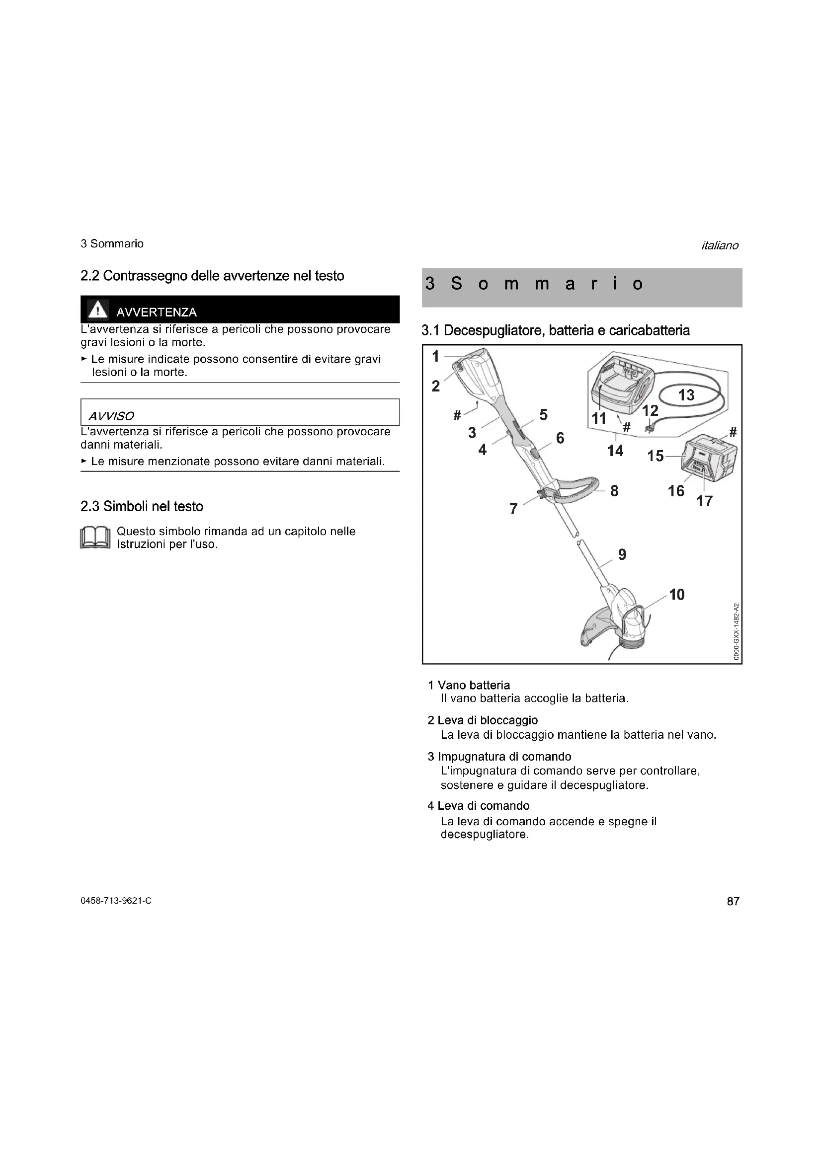1 Vano batteriaIl vano batteria accoglie la batteria.2 Leva di bloccaggioLa leva di bloccaggio mantiene la batteria nel vano.3 Impugnatura di comandoL'impugnatura di comando serve per controllare, sostenere e guidare il decespugliatore.4 Leva di comandoLa leva di comando accende e spegne il decespugliatore.Questo simbolo rimanda ad un capitolo nelle Istruzioni per l'uso. 3Sommario