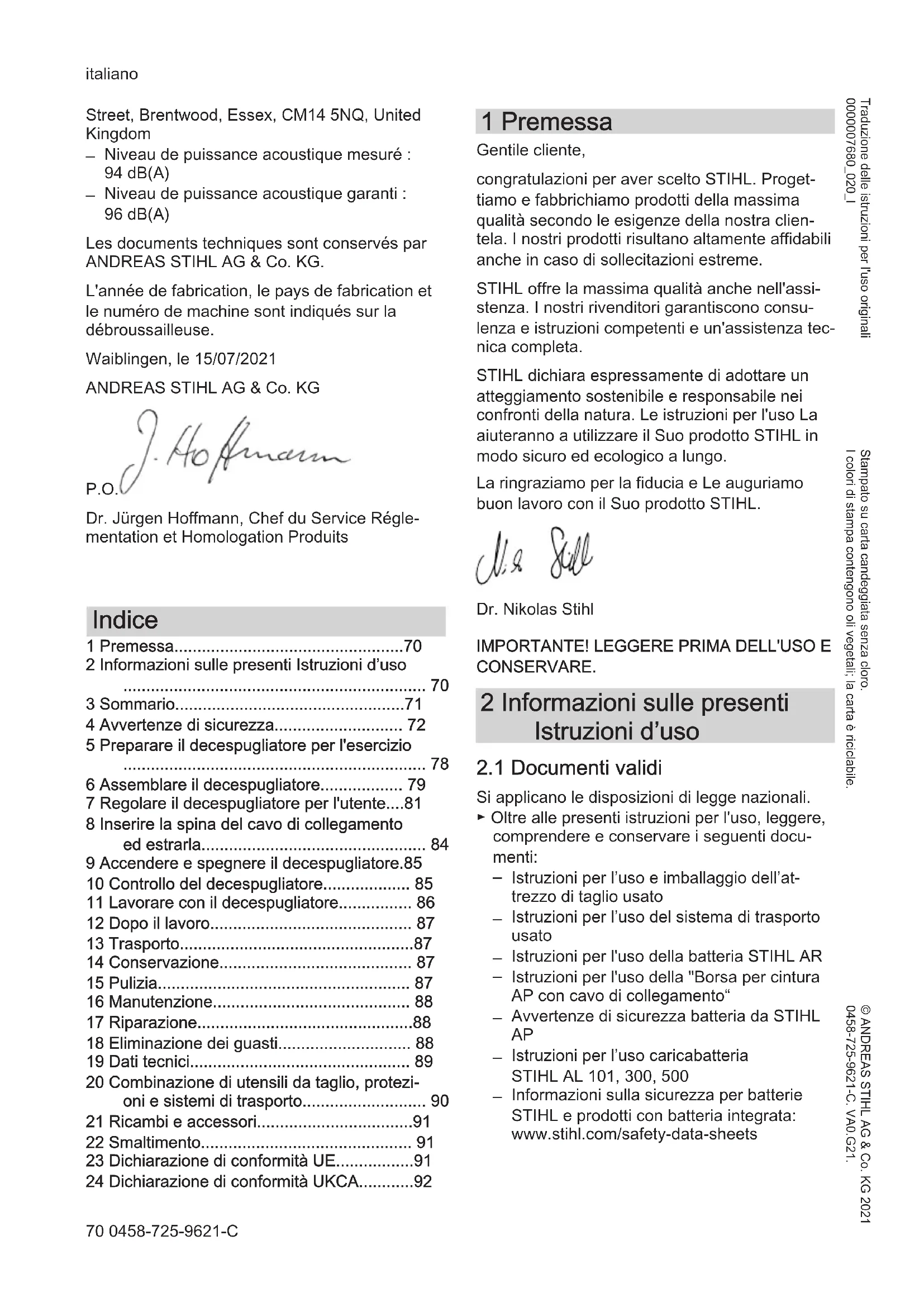 - 24 Dichiarazione di conformità UKCA 1 Premessa Gentile cliente, congratulazioni per aver scelto STIHL. Proget‐ tiamo e fabbrichiamo prodotti della massima qualità secondo le esigenze della nostra clien‐ tela. I nostri prodotti risultano altamente affidabili anche in caso di sollecitazioni estreme. STIHL offre la massima qualità anche nell'assi‐ stenza. I nostri rivenditori garantiscono consu‐ lenza e istruzioni competenti e un'assistenza tec‐ nica completa. STIHL dichiara espressamente di adottare un atteggiamento sostenibile e responsabile nei confronti della natura. Le istruzioni per l'uso La aiuteranno a utilizzare il Suo prodotto STIHL in modo sicuro ed ecologico a lungo. La ringraziamo per la fiducia e Le auguriamo buon lavoro con il Suo prodotto STIHL. Dr. Nikolas Stihl p. 92