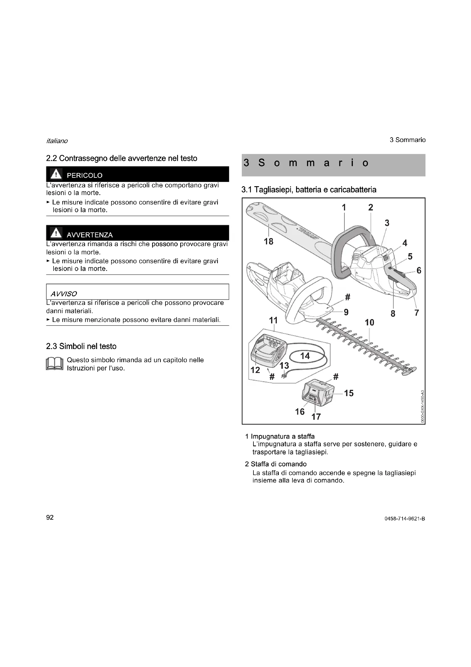 italiano 3 Sommario 3 Vano batteria Il vano batteria accoglie la batteria. 4 Leva di bloccaggio La leva di bloccaggio mantiene la batteria nel vano. 5 Leva di arresto La leva di arresto sblocca la leva di comando insieme al blocco della leva di comando. 6 Blocco leva di comando Il blocco della leva di comando sblocca la leva di comando insieme alla leva di arresto. 7 Impugnatura di comando L'impugnatura di comando serve per controllare, sostenere e guidare la tagliasiepi. 8 Leva di comando La leva di comando accende e spegne la tagliasiepi insieme alla staffa di comando. 9 Scudo di riparo mano Lo scudo di riparo mano protegge la mano dell’utente sull’impugnatura a staffa dal contatto con le lame 10 Lame Le lame tagliano il materiale. 11 Caricabatteria Il caricabatteria carica la batteria. 12 LED Il LED indica lo stato del caricabatteria. 13 Spina di rete La spina di rete collega il cavo di collegamento ad una presa. 14 Cavo di collegamento Il cavo di collegamento unisce il caricabatteria alla spina di rete. 15 Batteria La batteria alimenta di energia la tagliasiepi. 16 LED I LED indicano lo stato di carica della batteria e le anomalie. 17 Pulsante Il pulsante attiva i LED sulla batteria. 18 Riparo per lama Il riparo per lama protegge dal contatto con le lame. # Targhetta dati tecnici con numero di matricola