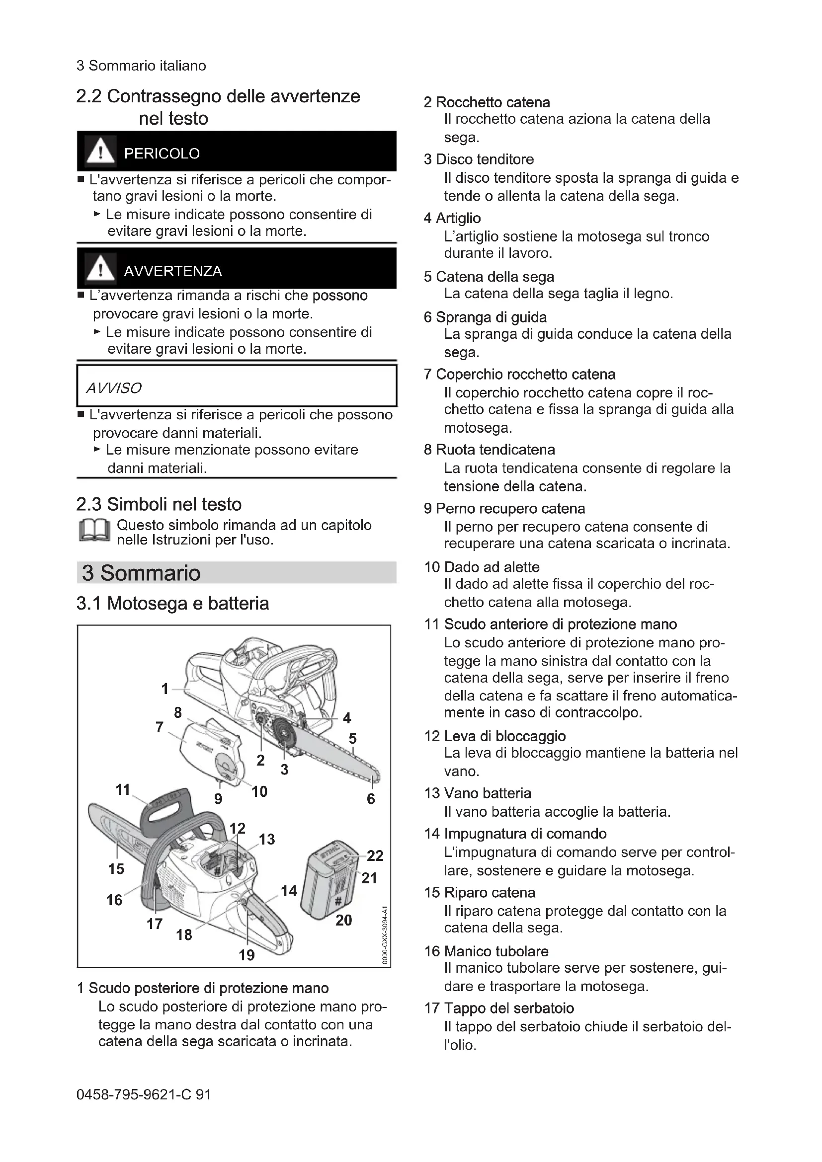 0000-GXX-3094-A1 1 Scudo posteriore di protezione mano Lo scudo posteriore di protezione mano pro‐ tegge la mano destra dal contatto con una catena della sega scaricata o incrinata. 2 Rocchetto catena Il rocchetto catena aziona la catena della sega. 3 Disco tenditore Il disco tenditore sposta la spranga di guida e tende o allenta la catena della sega. 4 Artiglio L’artiglio sostiene la motosega sul tronco durante il lavoro. 5 Catena della sega La catena della sega taglia il legno. 6 Spranga di guida La spranga di guida conduce la catena della sega. 7 Coperchio rocchetto catena Il coperchio rocchetto catena copre il roc‐ chetto catena e fissa la spranga di guida alla motosega. 8 Ruota tendicatena La ruota tendicatena consente di regolare la tensione della catena. 9 Perno recupero catena Il perno per recupero catena consente di recuperare una catena scaricata o incrinata. 10 Dado ad alette Il dado ad alette fissa il coperchio del roc‐ chetto catena alla motosega. 11 Scudo anteriore di protezione mano Lo scudo anteriore di protezione mano pro‐ tegge la mano sinistra dal contatto con la catena della sega, serve per inserire il freno della catena e fa scattare il freno automatica‐ mente in caso di contraccolpo. 12 Leva di bloccaggio La leva di bloccaggio mantiene la batteria nel vano. 13 Vano batteria Il vano batteria accoglie la batteria. 14 Impugnatura di comando L'impugnatura di comando serve per control‐ lare, sostenere e guidare la motosega. 15 Riparo catena Il riparo catena protegge dal contatto con la catena della sega. 16 Manico tubolare Il manico tubolare serve per sostenere, gui‐ dare e trasportare la motosega. 17 Tappo del serbatoio Il tappo del serbatoio chiude il serbatoio del‐ l'olio. 3 Sommario italiano 0458-795-9621-C 9118 Pulsante d’arresto Il pulsante di arresto sblocca la leva di comando. 19 Leva di comando La leva di comando accende e spegne la motosega. 20 Batteria La batteria alimenta di energia la motosega. 21 LED I LED indicano lo stato di carica della batteria e le anomalie. 22 Pulsante Il pulsante attiva i LED sulla batteria. # Targhetta dati tecnici con numero di matricola