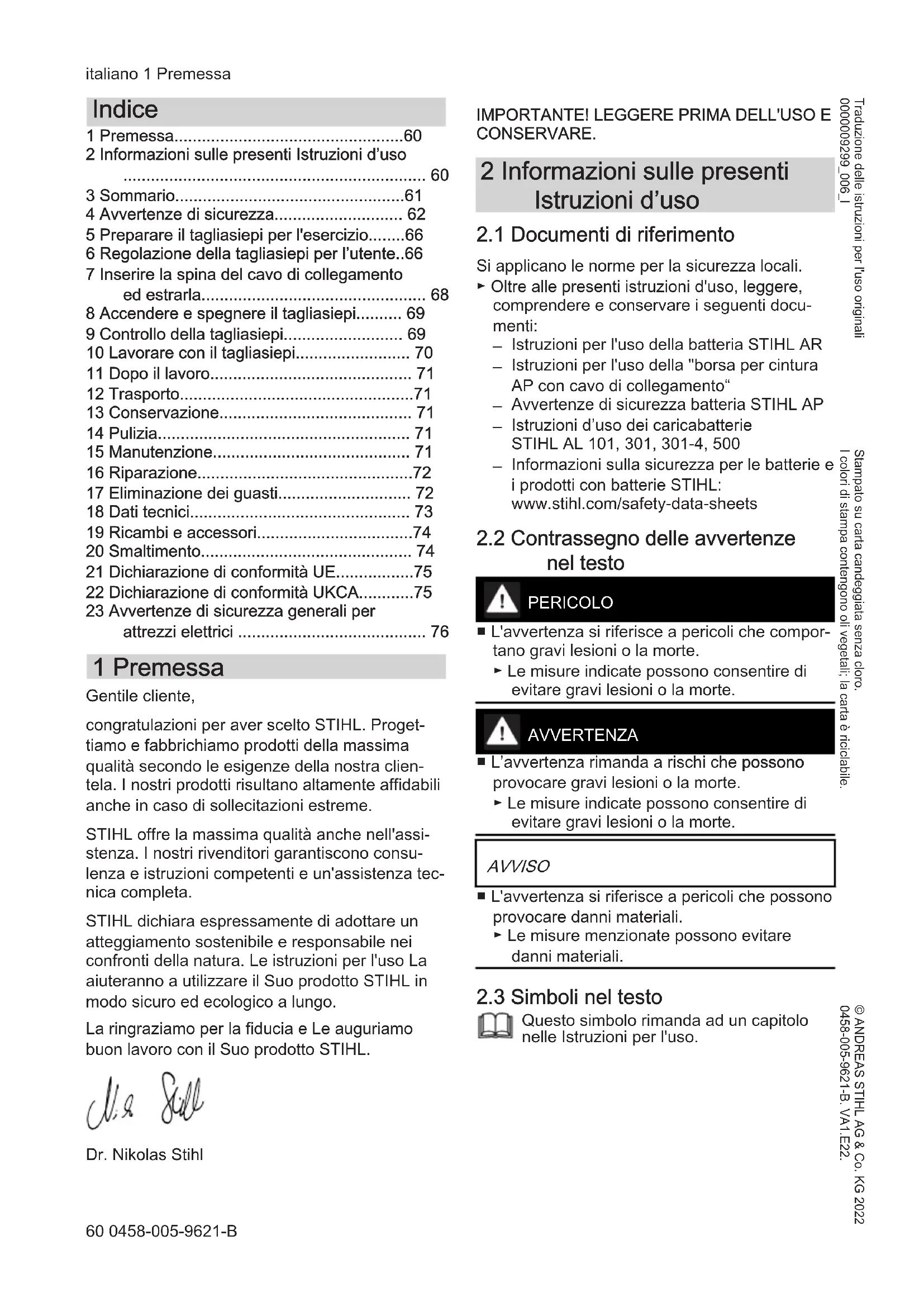 - 23 Avvertenze di sicurezza generali per attrezzi elettrici 1 Premessa Gentile cliente, congratulazioni per aver scelto STIHL. Proget‐ tiamo e fabbrichiamo prodotti della massima qualità secondo le esigenze della nostra clien‐ tela. I nostri prodotti risultano altamente affidabili anche in caso di sollecitazioni estreme. STIHL offre la massima qualità anche nell'assi‐ stenza. I nostri rivenditori garantiscono consu‐ lenza e istruzioni competenti e un'assistenza tec‐ nica completa. STIHL dichiara espressamente di adottare un atteggiamento sostenibile e responsabile nei confronti della natura. Le istruzioni per l'uso La aiuteranno a utilizzare il Suo prodotto STIHL in modo sicuro ed ecologico a lungo. La ringraziamo per la fiducia e Le auguriamo buon lavoro con il Suo prodotto STIHL. Dr. Nikolas Stihl p. 76
