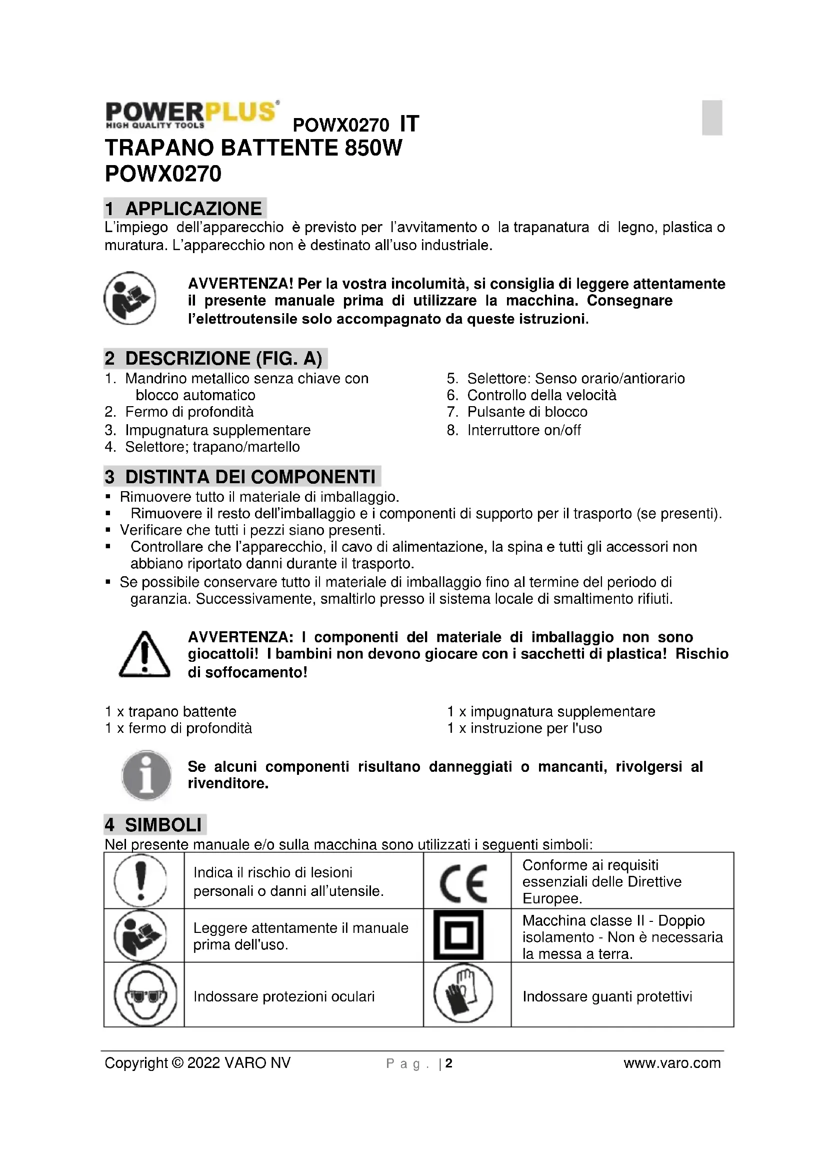 - Evitare la messa in funzione accidentale. Accertarsi che l’interruttore si trovi sulla posizione “off” prima di inserire la spina nella presa. Se durante il trasporto dell’apparecchio il dito poggia sull’interruttore, oppure se l’apparecchio viene collegato alla rete già in posizione di innesto, si possono causare incidenti.POWX0270 IT Copyright © 2022 VARO NV P a g . | 4 www.varo.com