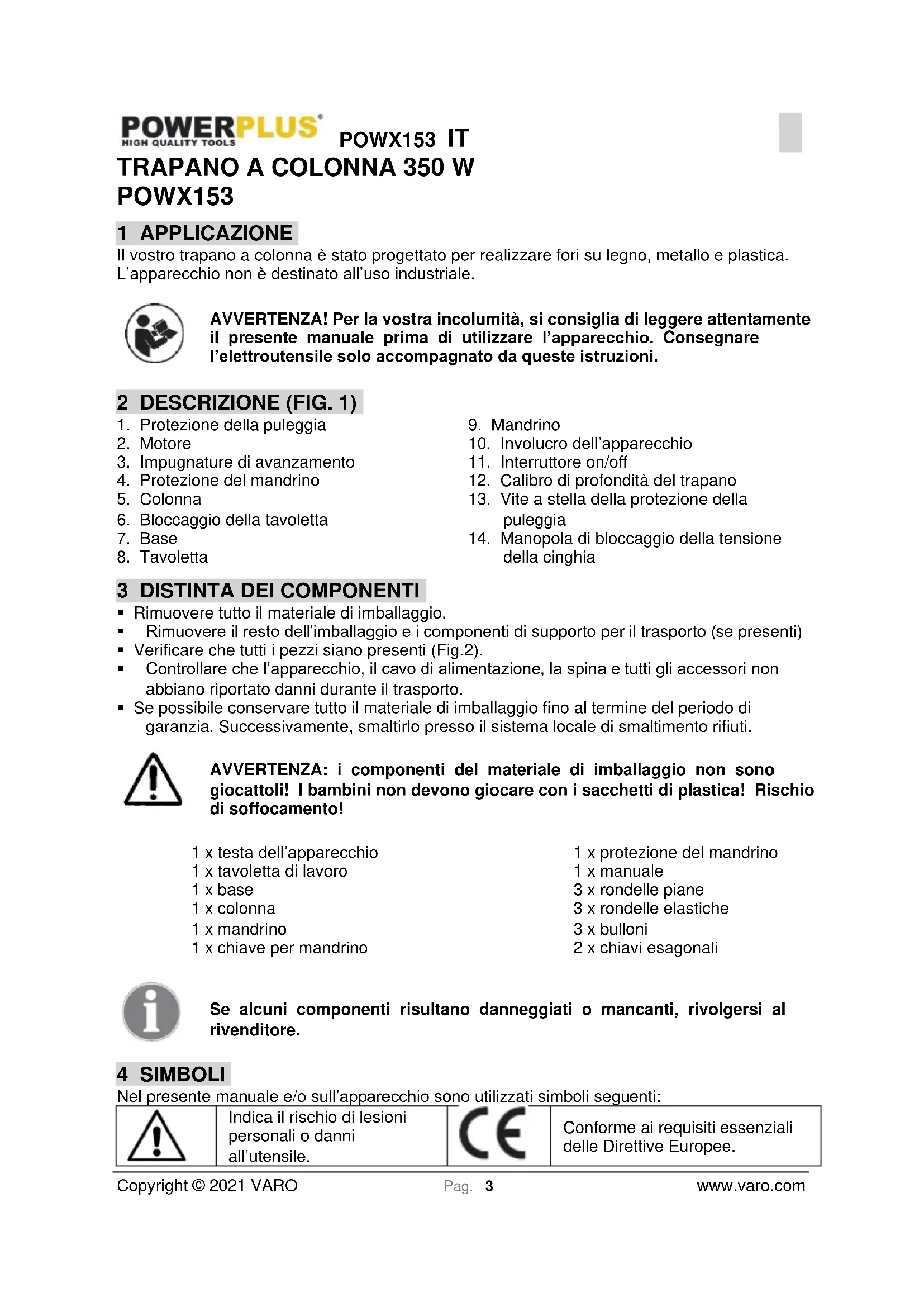 Con la presente, VARO N.V. –Vic. Van Rompuy N.V.- Joseph Van Instraat 9 – B2500 Lier, Belgio, dichiara che Descrizione dell’apparecchio: Trapano a colonna 350 W Marchio: POWERplus Numero articolo: POWX153 è conforme ai requisiti essenziali e alle altre disposizioni pertinenti stabilite dalle Direttive Europee in base all’applicazione delle norme europee armonizzate. Qualsiasi modifica effettuata sul prodotto rende nulla questa dichiarazione. Direttive europee (inclusi eventuali emendamenti fino alla data della firma): 2011/65/EU 2006/42/EC 2014/30/EU Norme europee armonizzate (inclusi eventuali emendamenti fino alla data della firma): EN62841-1 : 2015 EN62841-3-13 : 2017 EN55014-1 : 2017 EN55014-2 : 2015 EN61000-3-2 : 2014 EN61000-3-3 : 2013 Depositario della documentazione tecnica: Philippe Vankerkhove, VARO – Vic. Van Rompuy N.V. Il sottoscritto agisce in nome e per conto del CEO della società, Philippe Vankerkhove Regulatory Affairs – Compliance Manager 21/01/2021, Lier - BelgiumPOWX153 PT Copyright © 2021 VARO P á g i n a | 1 www.varo.com 1 APLICAÇÃO ..................................................................................... 3