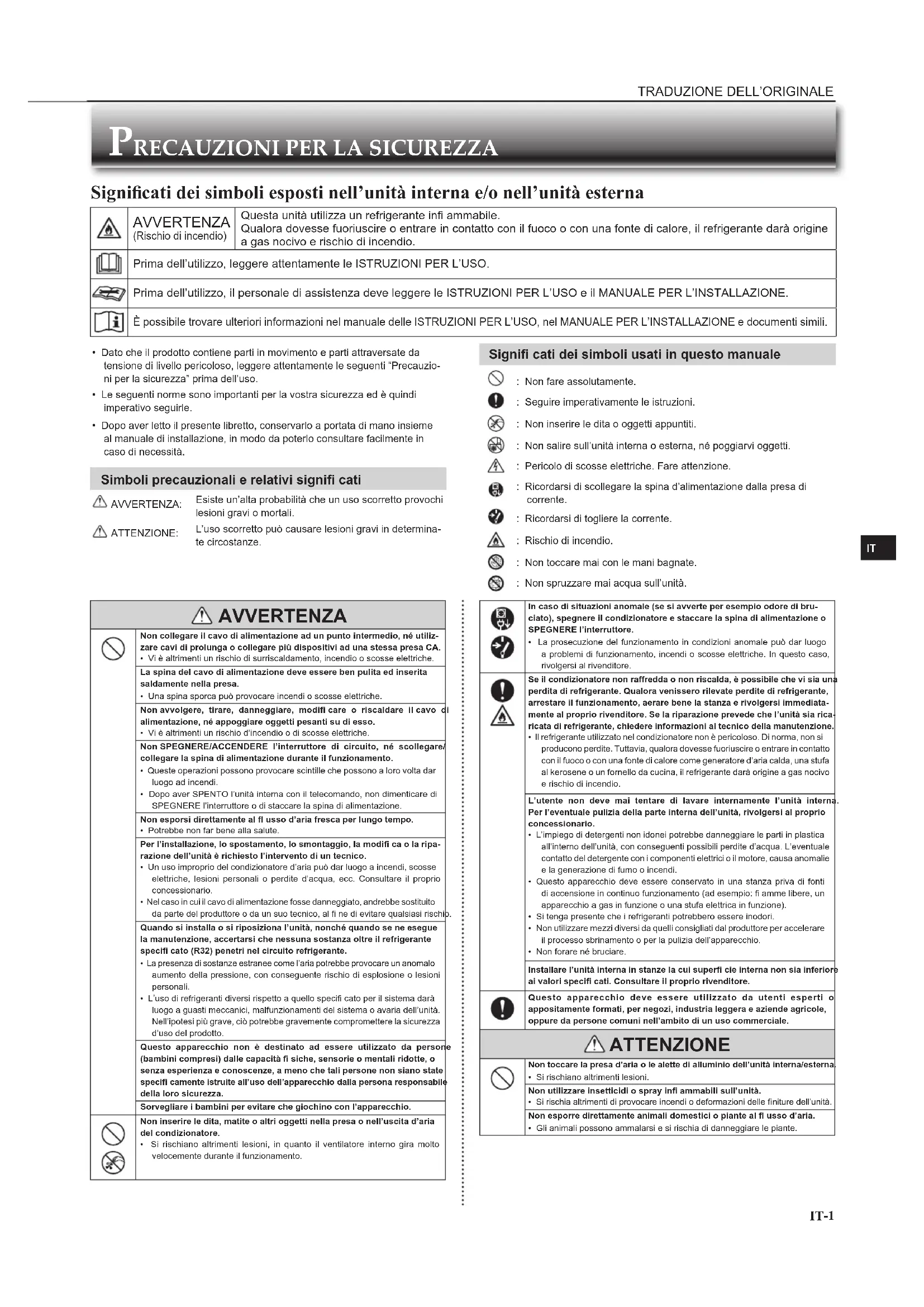 AVVERTENZA Non collegare il cavo di alimentazione ad un punto intermedio, né utiliz-zare cavi di prolunga o collegare più dispositivi ad una stessa presa CA.• Vi è altrimenti un rischio di surriscaldamento, incendio o scosse elettriche.La spina del cavo di alimentazione deve essere ben pulita ed inserita saldamente nella presa.• Una spina sporca può provocare incendi o scosse elettriche.Non avvolgere, tirare, danneggiare, modifi care o riscaldare il cavo di alimentazione, né appoggiare oggetti pesanti su di esso.• Vi è altrimenti un rischio d’incendio o di scosse elettriche.Non SPEGNERE/ACCENDERE l’interruttore di circuito, né scollegare/collegare la spina di alimentazione durante il funzionamento.• Queste operazioni possono provocare scintille che possono a loro volta dar luogo ad incendi.• Dopo aver SPENTO l’unità interna con il telecomando, non dimenticare di SPEGNERE l’interruttore o di staccare la spina di alimentazione.Non esporsi direttamente al fl usso d’aria fresca per lungo tempo.• Potrebbe non far bene alla salute.Per l’installazione, lo spostamento, lo smontaggio, la modifi ca o la ripa-razione dell’unità è richiesto l’intervento di un tecnico.• Un uso improprio del condizionatore d’aria può dar luogo a incendi, scosse elettriche, lesioni personali o perdite d’acqua, ecc. Consultare il proprio concessionario.• Nel caso in cui il cavo di alimentazione fosse danneggiato, andrebbe sostituito da parte del produttore o da un suo tecnico, al fi ne di evitare qualsiasi rischio.Quando si installa o si riposiziona l’unità, nonché quando se ne esegue la manutenzione, accertarsi che nessuna sostanza oltre il refrigerante specifi cato (R32) penetri nel circuito refrigerante.• La presenza di sostanze estranee come l’aria potrebbe provocare un anomalo aumento della pressione, con conseguente rischio di esplosione o lesioni personali. • L’uso di refrigeranti diversi rispetto a quello specifi cato per il sistema darà luogo a guasti meccanici, malfunzionamenti del sistema o avaria dell’unità. Nell’ipotesi più grave, ciò potrebbe gravemente compromettere la sicurezza d’uso del prodotto.Questo apparecchio non è destinato ad essere utilizzato da persone (bambini compresi) dalle capacità fi siche, sensorie o mentali ridotte, o senza esperienza e conoscenze, a meno che tali persone non siano state specifi camente istruite all’uso dell’apparecchio dalla persona responsabile della loro sicurezza.Sorvegliare i bambini per evitare che giochino con l’apparecchio. Non inserire le dita, matite o altri oggetti nella presa o nell’uscita d’aria del condizionatore.• Si rischiano altrimenti lesioni, in quanto il ventilatore interno gira molto velocemente durante il funzionamento. In caso di situazioni anomale (se si avverte per esempio odore di bru-ciato), spegnere il condizionatore e staccare la spina di alimentazione o SPEGNERE l’interruttore.• La prosecuzione del funzionamento in condizioni anomale può dar luogo a problemi di funzionamento, incendi o scosse elettriche. In questo caso, rivolgersi al rivenditore. Se il condizionatore non raffredda o non riscalda, è possibile che vi sia una perdita di refrigerante. Qualora venissero rilevate perdite di refrigerante, arrestare il funzionamento, aerare bene la stanza e rivolgersi immediata-mente al proprio rivenditore. Se la riparazione prevede che l’unità sia rica-ricata di refrigerante, chiedere informazioni al tecnico della manutenzione.• Il refrigerante utilizzato nel condizionatore non è pericoloso. Di norma, non si producono perdite. Tuttavia, qualora dovesse fuoriuscire o entrare in contatto con il fuoco o con una fonte di calore come generatore d’aria calda, una stufa al kerosene o un fornello da cucina, il refrigerante darà origine a gas nocivo e rischio di incendio.L’utente non deve mai tentare di lavare internamente l’unità interna. Per l’eventuale pulizia della parte interna dell’unità, rivolgersi al proprio concessionario.• L’impiego di detergenti non idonei potrebbe danneggiare le parti in plastica all’interno dell’unità, con conseguenti possibili perdite d’acqua. L’eventuale contatto del detergente con i componenti elettrici o il motore, causa anomalie e la generazione di fumo o incendi.• Questo apparecchio deve essere conservato in una stanza priva di fonti di accensione in continuo funzionamento (ad esempio: fi amme libere, un apparecchio a gas in funzione o una stufa elettrica in funzione).• Si tenga presente che i refrigeranti potrebbero essere inodori.• Non utilizzare mezzi diversi da quelli consigliati dal produttore per accelerare il processo sbrinamento o per la pulizia dell’apparecchio.• Non forare né bruciare.Installare l’unità interna in stanze la cui superfi cie interna non sia inferiore ai valori specifi cati. Consultare il proprio rivenditore.Questo apparecchio deve essere utilizzato da utenti esperti o appositamente formati, per negozi, industria leggera e aziende agricole, oppure da persone comuni nell’ambito di un uso commerciale. ATTENZIONE Non toccare la presa d’aria o le alette di alluminio dell’unità interna/esterna.• Si rischiano altrimenti lesioni.Non utilizzare insetticidi o spray infi ammabili sull’unità.• Si rischia altrimenti di provocare incendi o deformazioni delle fi niture dell’unità.Non esporre direttamente animali domestici o piante al fl usso d’aria.• Gli animali possono ammalarsi e si rischia di danneggiare le piante. Signifi cati dei simboli esposti nell’unità interna e/o nell’unità esterna AVVERTENZA (Rischio di incendio)Questa unità utilizza un refrigerante infi ammabile.Qualora dovesse fuoriuscire o entrare in contatto con il fuoco o con una fonte di calore, il refrigerante darà origine a gas nocivo e rischio di incendio.Prima dell’utilizzo, leggere attentamente le ISTRUZIONI PER L’USO.Prima dell’utilizzo, il personale di assistenza deve leg