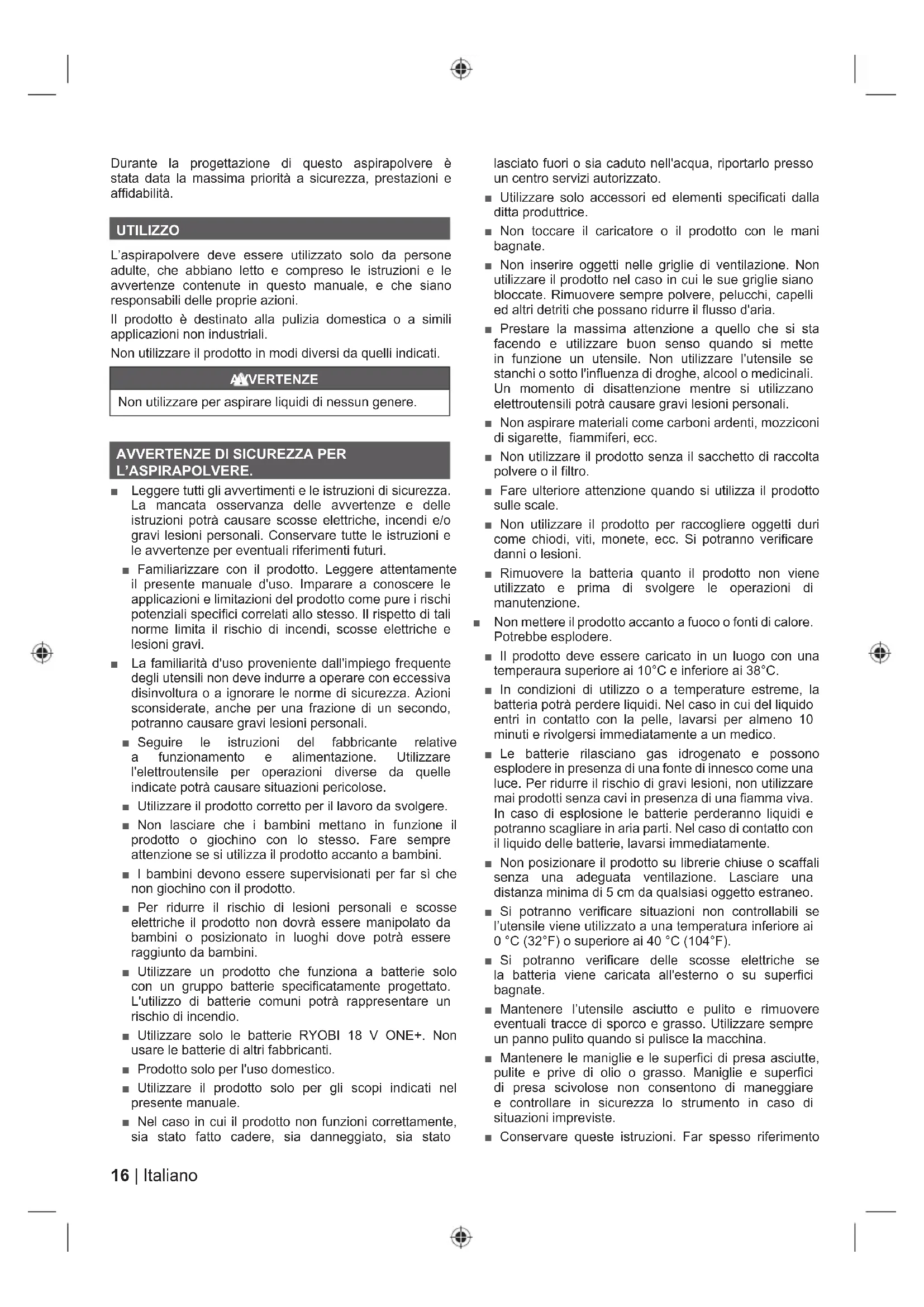L’ASPIRAPOLVERE. ■ Leggere tutti gli avvertimenti e le istruzioni di sicurezza. La mancata osservanza delle avvertenze e delle istruzioni potrà causare scosse elettriche, incendi e/o gravi lesioni personali. Conservare tutte le istruzioni e le avvertenze per eventuali riferimenti futuri. ■ Familiarizzare con il prodotto. Leggere attentamente il presente manuale d'uso. Imparare a conoscere le applicazioni e limitazioni del prodotto come pure i rischi potenziali specifici correlati allo stesso. Il rispetto di tali norme limita il rischio di incendi, scosse elettriche e lesioni gravi. ■ La familiarità d'uso proveniente dall'impiego frequente degli utensili non deve indurre a operare con eccessiva disinvoltura o a ignorare le norme di sicurezza. Azioni sconsiderate, anche per una frazione di un secondo, potranno causare gravi lesioni personali. ■ Seguire le istruzioni del fabbricante relative a funzionamento e alimentazione. Utilizzare l'elettroutensile per operazioni diverse da quelle indicate potrà causare situazioni pericolose. ■ Utilizzare il prodotto corretto per il lavoro da svolgere. ■ Non lasciare che i bambini mettano in funzione il prodotto o giochino con lo stesso. Fare sempre attenzione se si utilizza il prodotto accanto a bambini. ■ I bambini devono essere supervisionati per far sì che non giochino con il prodotto. ■ Per ridurre il rischio di lesioni personali e scosse elettriche il prodotto non dovrà essere manipolato da bambini o posizionato in luoghi dove potrà essere raggiunto da bambini. ■ Utilizzare un prodotto che funziona a batterie solo con un gruppo batterie specificatamente progettato. L'utilizzo di batterie comuni potrà rappresentare un rischio di incendio. ■ Utilizzare solo le batterie RYOBI 18 V ONE+. Non usare le batterie di altri fabbricanti. ■ Prodotto solo per l'uso domestico. ■ Utilizzare il prodotto solo per gli scopi indicati nel presente manuale. ■ Nel caso in cui il prodotto non funzioni correttamente, sia stato fatto cadere, sia danneggiato, sia stato lasciato fuori o sia caduto nell'acqua, riportarlo presso un centro servizi autorizzato. ■ Utilizzare solo accessori ed elementi specificati dalla ditta produttrice. ■ Non toccare il caricatore o il prodotto con le mani bagnate. ■ Non inserire oggetti nelle griglie di ventilazione. Non utilizzare il prodotto nel caso in cui le sue griglie siano bloccate. Rimuovere sempre polvere, pelucchi, capelli ed altri detriti che possano ridurre il flusso d'aria. ■ Prestare la massima attenzione a quello che si sta facendo e utilizzare buon senso quando si mette in funzione un utensile. Non utilizzare l'utensile se stanchi o sotto l'influenza di droghe, alcool o medicinali. Un momento di disattenzione mentre si utilizzano elettroutensili potrà causare gravi lesioni personali. ■ Non aspirare materiali come carboni ardenti, mozziconi di sigarette, fiammiferi, ecc. ■ Non utilizzare il prodotto senza il sacchetto di raccolta polvere o il filtro. ■ Fare ulteriore attenzione quando si utilizza il prodotto sulle scale. ■ Non utilizzare il prodotto per raccogliere oggetti duri come chiodi, viti, monete, ecc. Si potranno verificare danni o lesioni. ■ Rimuovere la batteria quanto il prodotto non viene utilizzato e prima di svolgere le operazioni di manutenzione. ■ Non mettere il prodotto accanto a fuoco o fonti di calore. Potrebbe esplodere. ■ Il prodotto deve essere caricato in un luogo con una temperaura superiore ai 10°C e inferiore ai 38°C. ■ In condizioni di utilizzo o a temperature estreme, la batteria potrà perdere liquidi. Nel caso in cui del liquido entri in contatto con la pelle, lavarsi per almeno 10 minuti e rivolgersi immediatamente a un medico. ■ Le batterie rilasciano gas idrogenato e possono esplodere in presenza di una fonte di innesco come una luce. Per ridurre il rischio di gravi lesioni, non utilizzare mai prodotti senza cavi in presenza di una fiamma viva. In caso di esplosione le batterie perderanno liquidi e potranno scagliare in aria parti. Nel caso di contatto con il liquido delle batterie, lavarsi immediatamente. ■ Non posizionare il prodotto su librerie chiuse o scaffali senza una adeguata ventilazione. Lasciare una distanza minima di 5 cm da qualsiasi oggetto estraneo. ■ Si potranno verificare situazioni non controllabili se l’utensile viene utilizzato a una temperatura inferiore ai 0 °C (32°F) o superiore ai 40 °C (104°F). ■ Si potranno verificare delle scosse elettriche se la batteria viene caricata all'esterno o su superfici bagnate. ■ Mantenere l’utensile asciutto e pulito e rimuovere eventuali tracce di sporco e grasso. Utilizzare sempre un panno pulito quando si pulisce la macchina. ■ Mantenere le maniglie e le superfici di presa asciutte, pulite e prive di olio o grasso. Maniglie e superfici di presa scivolose non consentono di maneggiare e controllare in sicurezza lo strumento in caso di situazioni impreviste. ■ Conservare queste istruzioni. Far spesso riferimento17 Italiano |
