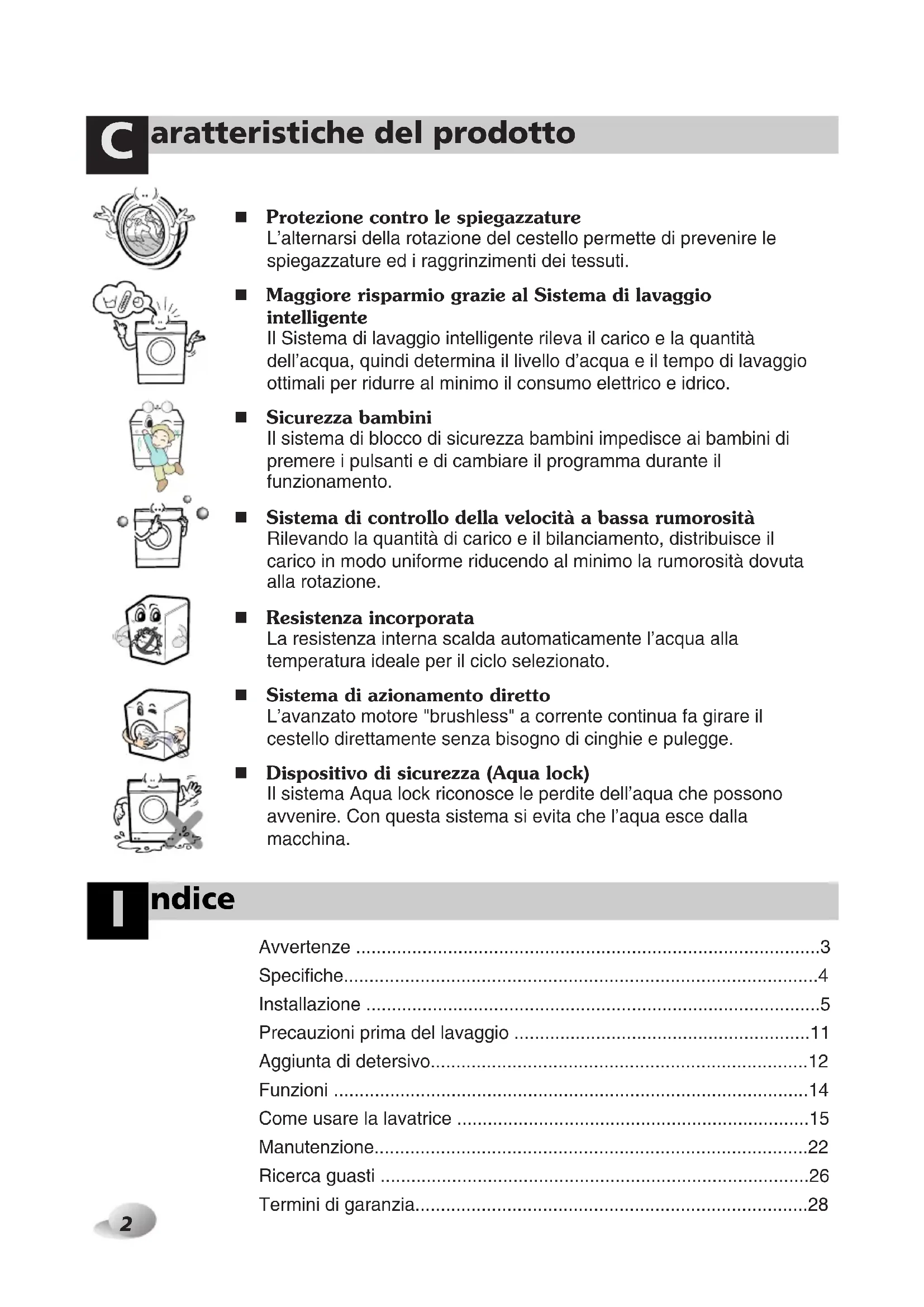 - Termini di garanzia Protezione contro le spiegazzature L’alternarsi della rotazione del cestello permette di prevenire le spiegazzature ed i raggrinzimenti dei tessuti. Maggiore risparmio grazie al Sistema di lavaggio intelligente Il Sistema di lavaggio intelligente rileva il carico e la quantità dell’acqua, quindi determina il livello d’acqua e il tempo di lavaggio ottimali per ridurre al minimo il consumo elettrico e idrico. Sicurezza bambini Il sistema di blocco di sicurezza bambini impedisce ai bambini di premere i pulsanti e di cambiare il programma durante il funzionamento. Sistema di controllo della velocità a bassa rumorosità Rilevando la quantità di carico e il bilanciamento, distribuisce il carico in modo uniforme riducendo al minimo la rumorosità dovuta alla rotazione. Resistenza incorporata La resistenza interna scalda automaticamente l’acqua alla temperatura ideale per il ciclo selezionato. Sistema di azionamento diretto L’avanzato motore "brushless" a corrente continua fa girare il cestello direttamente senza bisogno di cinghie e pulegge. Dispositivo di sicurezza (Aqua lock) Il sistema Aqua lock riconosce le perdite dell’aqua che possono avvenire. Con questa sistema si evita che l’aqua esce dalla macchina. 추가선택, 예약,vvertenze p. 28
