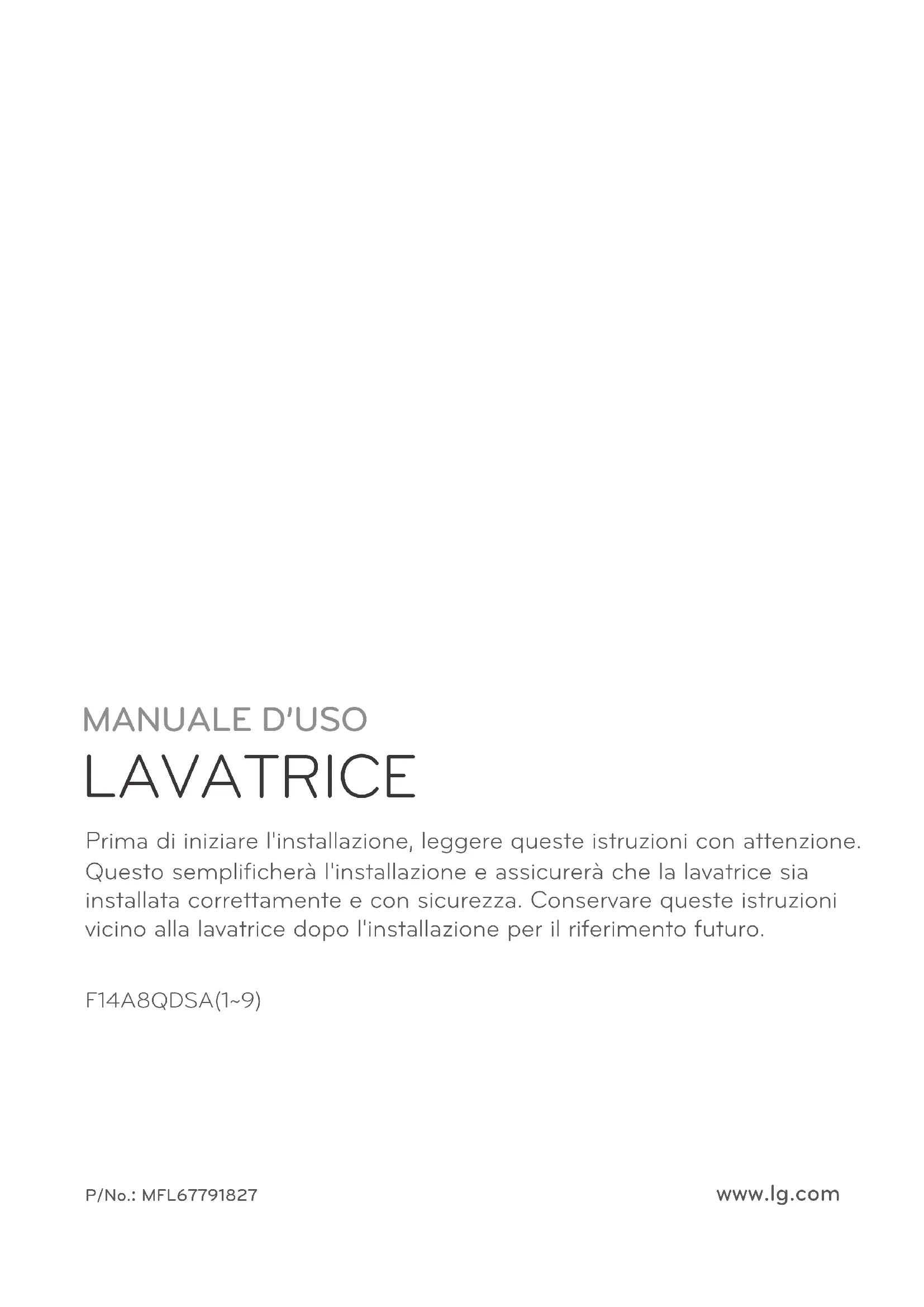 LAVATRICE F14A8QDSA(1~9) P/No.: MFL67791827 www.lg.com Prima di iniziare l'installazione, leggere queste istruzioni con attenzione. Questo semplificherà l'installazione e assicurerà che la lavatrice sia installata correttamente e con sicurezza. Conservare queste istruzioni vicino alla lavatrice dopo l'installazione per il riferimento futuro.Indice