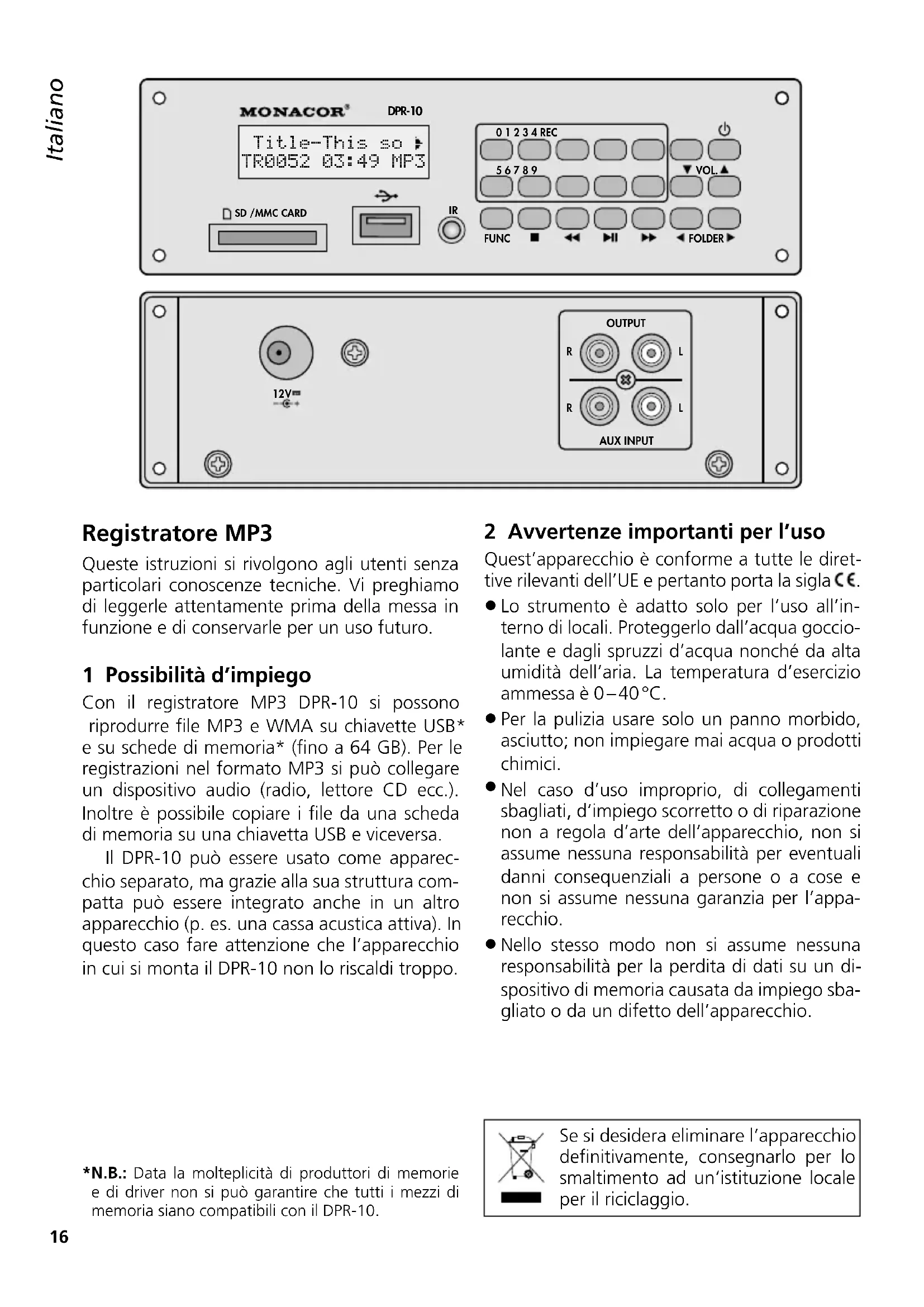 DPR-10 12V OUTPUTAUX INPUT R L R L Registratore MP3 Queste istruzioni si rivolgono agli utenti senza particolari conoscenze tecniche. Vi preghiamo di leggerle attentamente prima della messa in funzione e di conservarle per un uso futuro. 1 Possibilità d’impiego Con il registratore MP3 DPR-10 si possono riprodurre file MP3 e WMA su chiavette USB* e su schede di memoria* (fino a 64 GB). Per le registrazioni nel formato MP3 si può collegare un dispositivo audio (radio, lettore CD ecc.). Inoltre è possibile copiare i file da una scheda di memoria su una chiavetta USB e viceversa. Il DPR-10 può essere usato come apparec- chio separato, ma grazie alla sua struttura com- patta può essere integrato anche in un altro apparecchio (p. es. una cassa acustica attiva). In questo caso fare attenzione che l’apparecchio in cui si monta il DPR-10 non lo riscaldi troppo.