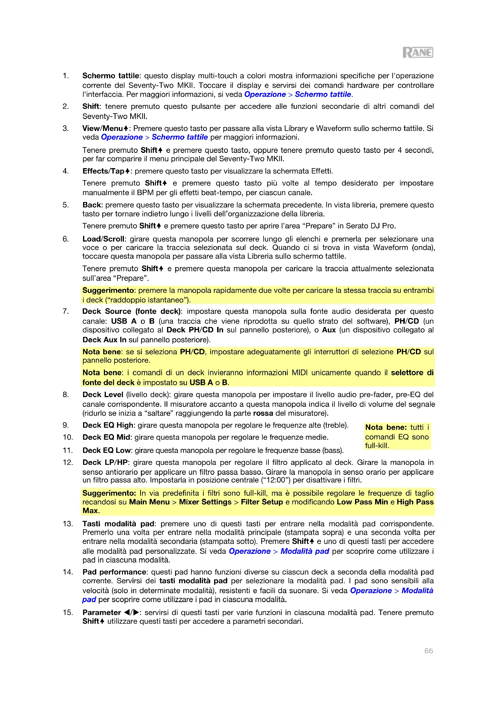 is de tension62 Guida per l'uso (Italiano) Introduzione Grazie per aver acquistato il Seventy-Two MKII. Noi di Rane DJ sappiamo che per te la musica è una cosa seria. Ecco perché progettiamo i nostri dispositivi con un unico obiettivo in mente: rendere le tue prestazioni le migliori possibili.