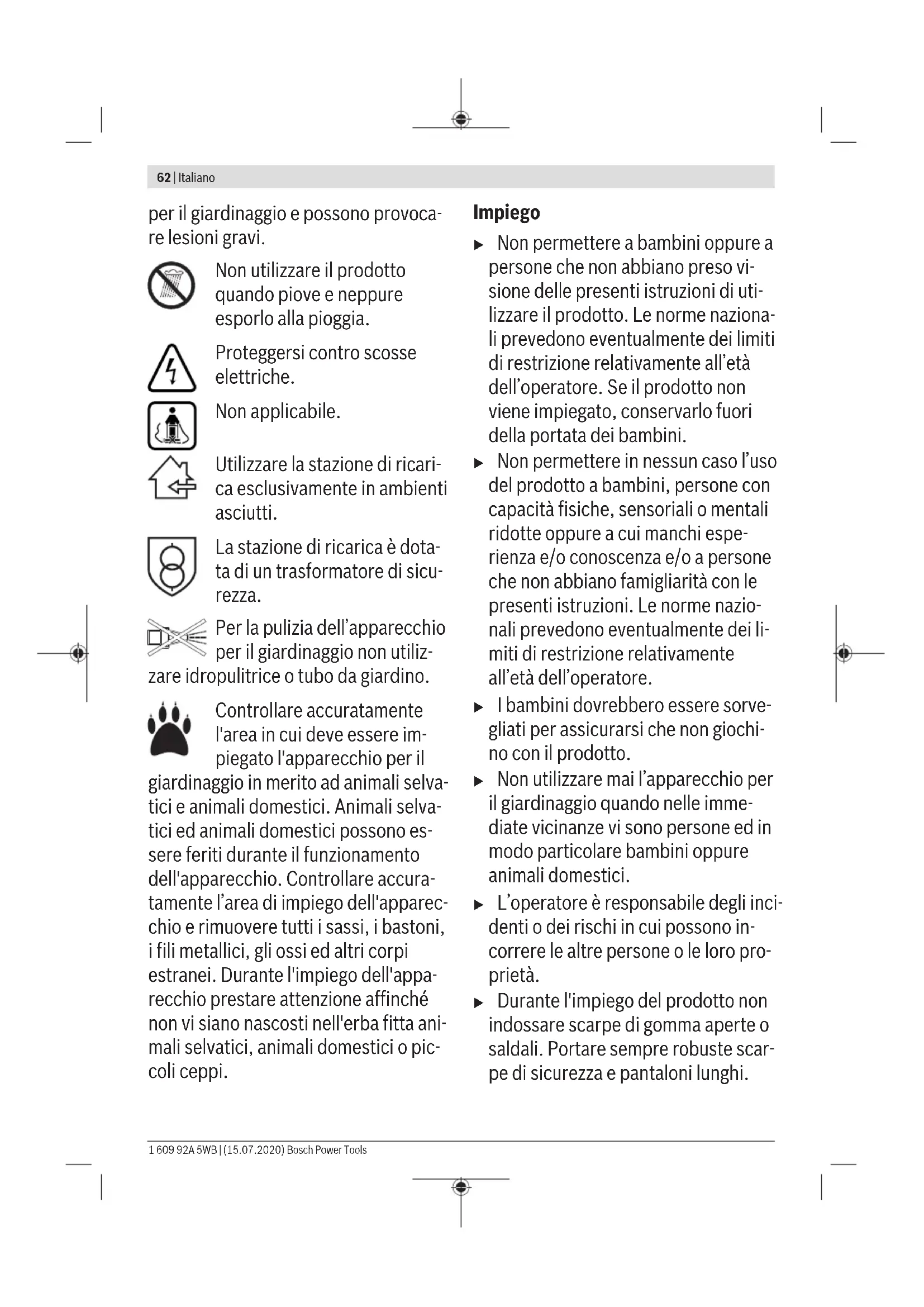 L’accessorio illustrato oppure descritto non è compreso nel volume di fornitura standard. L’accessorio completo è con- tenuto nel nostro programma accessori. Messa in funzione Per la Vostra sicurezza u Attenzione! Spegnere l’apparecchio per il giardinag- gio, rimuovere il ruttore del circuito elettrico e toglie- re la batteria ricaricabile prima di effettuare interven- ti di manutenzione o di pulizia. Lo stesso vale se il cavo dell’interruttore dovesse essere danneggiato, tagliato oppure aggrovigliato. u Le lame continuano a ruotare ancora per alcuni secon- di dopo lo spegnimento dell’apparecchio per il giardi- naggio. u Attenzione: Non toccare la lama di taglio rotante. Ricarica della batteria La batteria ricaricabile è dotata di un controllo della tempe- ratura che consente una ricarica esclusivamente nel campo di temperatura tra 0 °C e 35 °C. In questo modo viene otte- nuta un’elevata durata della batteria ricaricabile. Nota: La batteria ricaricabile viene fornita parzialmente cari- ca. Per garantire l’intera potenza della batteria ricaricabile, prima del primo impiego ricaricare completamente la batte- ria ricaricabile nella stazione di ricarica. La batteria ricaricabile agli ioni di litio può essere ricaricata in qualsiasi momento senza ridurne la durata. Un’interruzio- ne dell’operazione di ricarica non danneggia la batteria rica- ricabile. La batteria ricaricabile agli ioni di litio è protetta dalla "Elec- tronic Cell Protection (ECP)" contro lo scaricamento comple- to. In caso di batteria scarica, il prodotto viene spento trami- te un interruttore automatico: L’apparecchio per il giardinag- gio non funziona più. Dopo lo spegnimento automatico del prodotto non pre- mere ulteriormente l’interruttore di avvio/arresto. La batteria ricaricabile potrebbe subire dei danni. Attenersi alle indicazioni per lo smaltimento della batteria ri- caricabile. Inserimento/rimozione della batteria ricaricabile Nota: Se non vengono utilizzate batterie ricaricabili adatte possono verificarsi funzionamenti difettosi o è possibile il danneggiamento dell’apparecchio. Inserire la batteria carica. Assicurarsi che la batteria ricarica- bile sia inserita completamente. Per la rimozione della batteria ricaricabile dall’apparecchio premere il tasto di sbloccaggio batteria ricaricabile e togliere la batteria. Operazione di ricarica L’operazione di ricarica inizia non appena la spina di rete del- la stazione di ricarica viene inserita nella presa e la batteria ricaricabile viene inserita nella stazione di ricarica . Grazie all’intelligente procedimento di ricarica lo stato di ri- carica della batteria viene riconosciuto automaticamente e, in base alla temperatura della batteria e della tensione, viene selezionata la corrente di carica ottimale. In questo modo la batteria ricaricabile viene protetta e con- servandola nella stazione di ricarica rimane sempre comple- tamente carica. Significato degli elementi indicatori sulla stazione di ricarica (AL 3620 CV/AL 3640 CV/AL 36V-20) Operazione di ricarica rapida L'operazione di ricarica rapida viene segnalata dal lampeggio dell’indicatore di carica della batteria verde. Elemento indicatore sulla batteria ricaricabile: Durante l'ope- razione di ricarica i tre LED verdi sono illuminati uno dopo l’altro e si spengono brevemente. La batteria ricaricabile è completamente carica quando i tre LED verdi sono illuminati permanentemente. Circa 5minuti dopo che la batteria ricari- cabile è stata ricaricata completamente, i tre LED verdi si spengono di nuovo. Nota: L’operazione di ricarica rapida è possibile esclusiva- mente se la temperatura della batteria ricaricabile si trova nel campo di temperatura di carica ammissibile, vedi para- grafo "Dati tecnici". Batteria caricata La luce continua dell’indicatore LED verde se- gnala che la batteria è completamente carica. Inoltre, per la durata di ca. 2 secondi viene emesso un segnale acustico che segnala che la batteria è sta- ta ricaricata completamente. Una volta terminata l’operazione, la batteria ricaricabile può essere estratta ed è pronta per l’uso immediato. Se la batteria ricaricabile non è inserita, la luce continua dell’indicatore LED segnala che la spina di rete è inserita nel- la presa di corrente e che la stazione di ricarica è pronta per l’uso. 1 609 92A 5WB | (15.07.2020) Bosch Power ToolsItaliano | 71 Temperatura della batteria ricaricabile inferiore a 0°C oppure superiore a 45°C La luce continua dell’indicatore LED rosso se- gnala che la temperatura della batteria si trova al di fuori del campo di temperatura di carica ammissibile, vedi paragrafo "Dati tecnici". Non appena viene raggiunto il campo di temperatura ammissibile, la stazione di ricarica passa automaticamente alla ricarica rapida. Se la temperatura della batteria ricaricabile si trova al di fuo- ri del campo di temperatura di carica ammissibile, inseren- dola nella stazione di ricarica si accende il LED rosso della batteria ricaricabile. Operazione di ricarica impossibile Nel caso fosse presente un'altra anomalia dell’operazione di ricarica, la stessa viene se- gnalata tramite lampeggio dell’indicatore LED rosso. L’operazione di ricarica non può essere avviata e la ricarica della batteria non è possibile (vedi paragrafo "Individuazione dei guasti"). Istruzioni per la ricarica In caso di cicli di ricarica continui oppure in caso di operazio- ni di ricarica successivi senza interruzione, la stazione di ri- carica si può riscaldare. Questo fatto non è comunque preoc- cupante e non è indice di un difetto tecnico della stazione di ricarica stessa. Un tempo di funzionamento notevolmente ridotto dopo la ri- carica indica che la batteria ricaricabile è consumata e deve essere sostituita. Attenersi alle indicazioni per lo smaltimento. Raffreddamento della batteria ricaricabile (Active Air Cooling) Il sistema di ventilazione integrato nella stazione di ricarica controlla la temperatura 