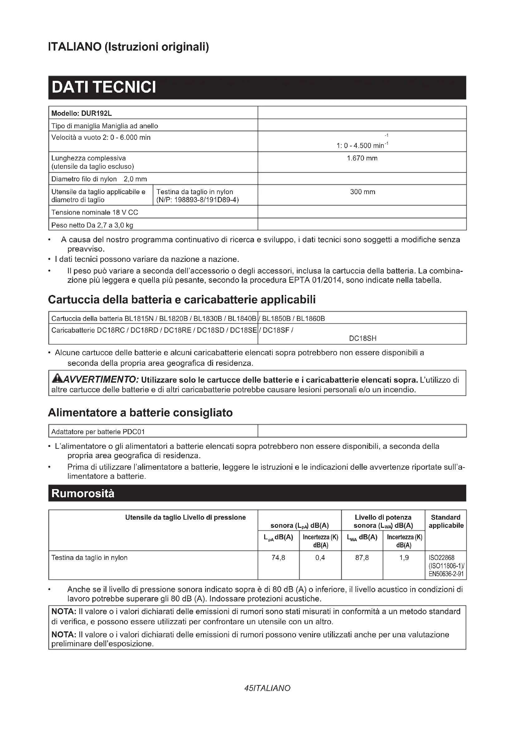 - Il peso può variare a seconda dell’accessorio o degli accessori, inclusa la cartuccia della batteria. La combina- zione più leggera e quella più pesante, secondo la procedura EPTA 01/2014, sono indicate nella tabella. Cartuccia della batteria e caricabatterie applicabili Cartuccia della batteria BL1815N / BL1820B / BL1830B / BL1840B / BL1850B / BL1860B Caricabatterie DC18RC / DC18RD / DC18RE / DC18SD / DC18SE / DC18SF / DC18SH