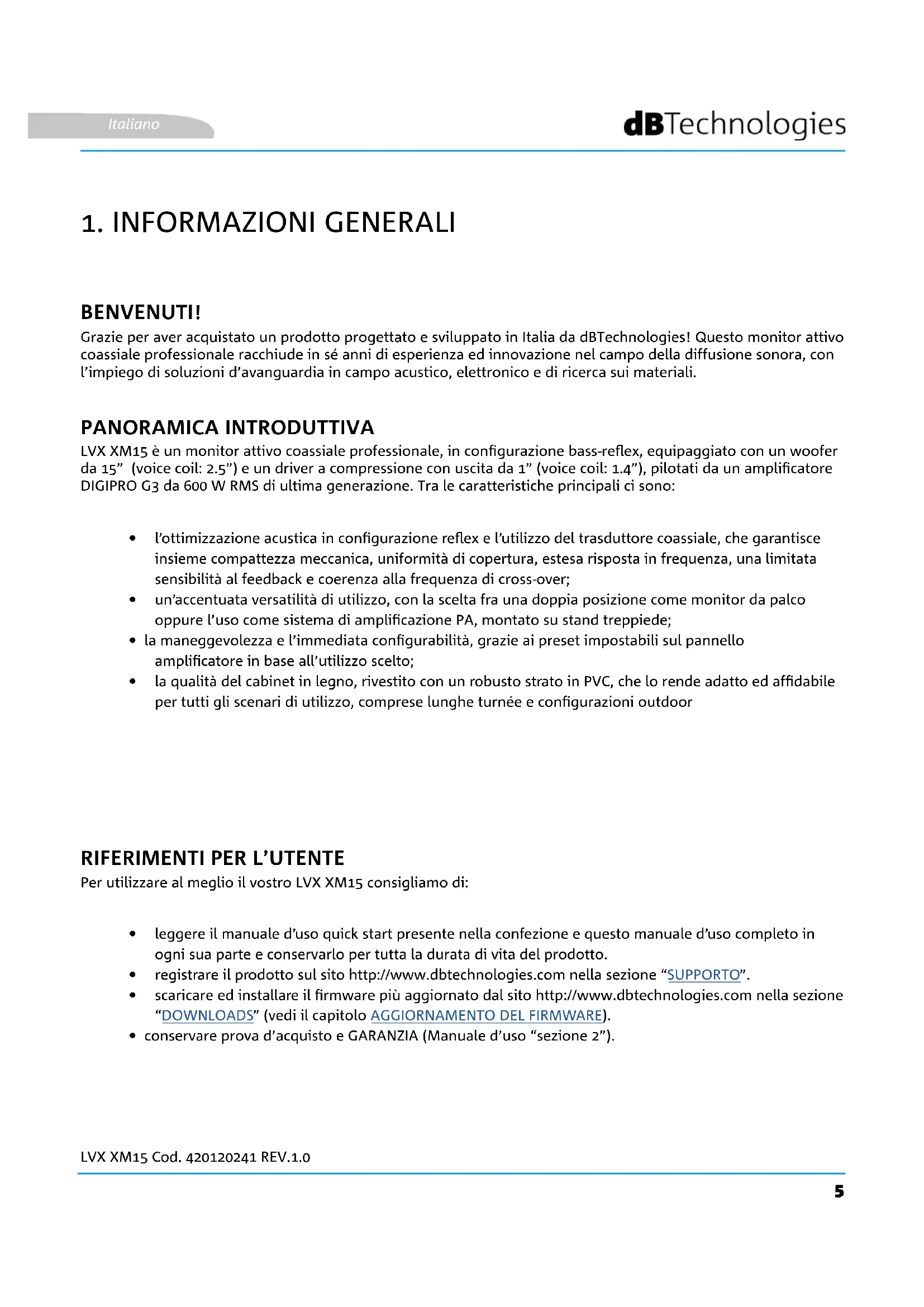 Grazie per aver acquistato un prodotto progettato e sviluppato in Italia da dBTechnologies! Questo monitor attivo coassiale professionale racchiude in sé anni di esperienza ed innovazione nel campo della diffusione sonora, con l’impiego di soluzioni d’avanguardia in campo acustico, elettronico e di ricerca sui materiali. LVX XM15 è un monitor attivo coassiale professionale, in congurazione bass-reex, equipaggiato con un woofer da 15” (voice coil: 2.5”) e un driver a compressione con uscita da 1” (voice coil: 1.4”), pilotati da un amplicatore DIGIPRO G3 da 600 W RMS di ultima generazione. Tra le caratteristiche principali ci sono: Per utilizzare al meglio il vostro LVX XM15 consigliamo di: