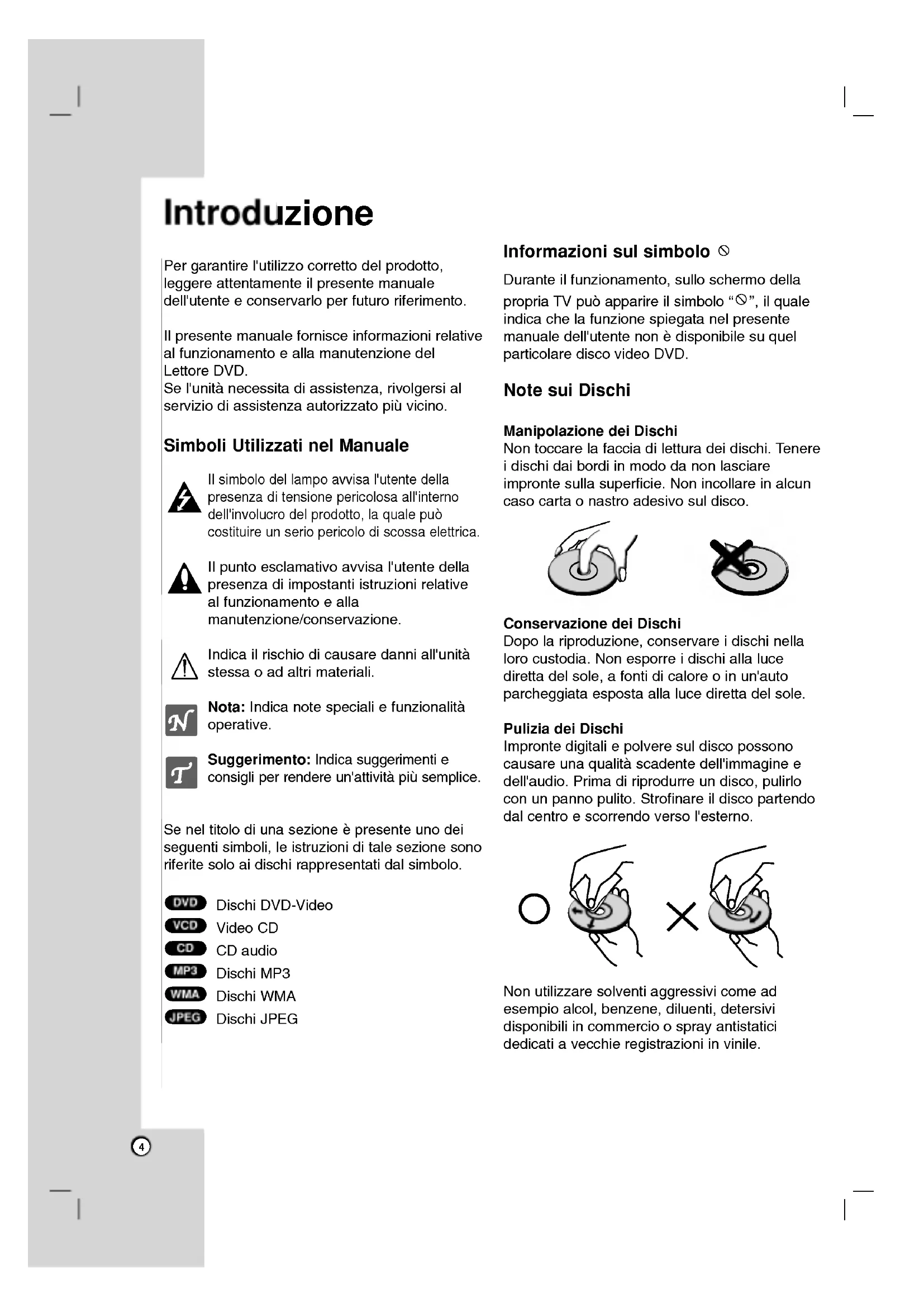 - Specifichetecniche Introduzione Per garantire l'utilizzocorrettodel prodotto, leggere attentamenteil presente manualedell'utenteeconservarloperfuturoriferimento.Il presente manualefornisceinformazionirelativealfunzionamentoeallamanutenzionedelLettoreDVD.Sel'unitanecessitadi assistenza, rivolgersi alserviziodiassistenzaautorizzato piu vicino. Simboli Utilizzati nel Manuale Ilsimbolodel lampo avvisal'utentedellapresenzaditensione pericolosa all'internodell'involucrodel prodotto, quale puo costituireunserio pericolo discossaelettrica.Il punto esclamativoavvisal'utentedellapresenzadi impostanti istruzionirelativealfunzionamentoeallamanutenzione/conservazione.Indicailrischiodicausaredanniall'unitastessaoadaltrimateriali.Nota:Indicanote speciali efunzionalita operative. Suggerimento: Indica suggerimenti consigli perrendereun'attivita piu semplice. Seneltitolodiunasezionee presente unodei seguenti simboli, leistruzioniditalesezionesonoriferitesoloaidischi rappresentati dalsimbolo.DischiDVD-VideoVideoCDCDaudioDischiMP3DischiWMADischiJPEG Informazioni sul simbolo Duranteil funzionamento, sulloschermodella propria puo apparire ilsimbolo p. 284