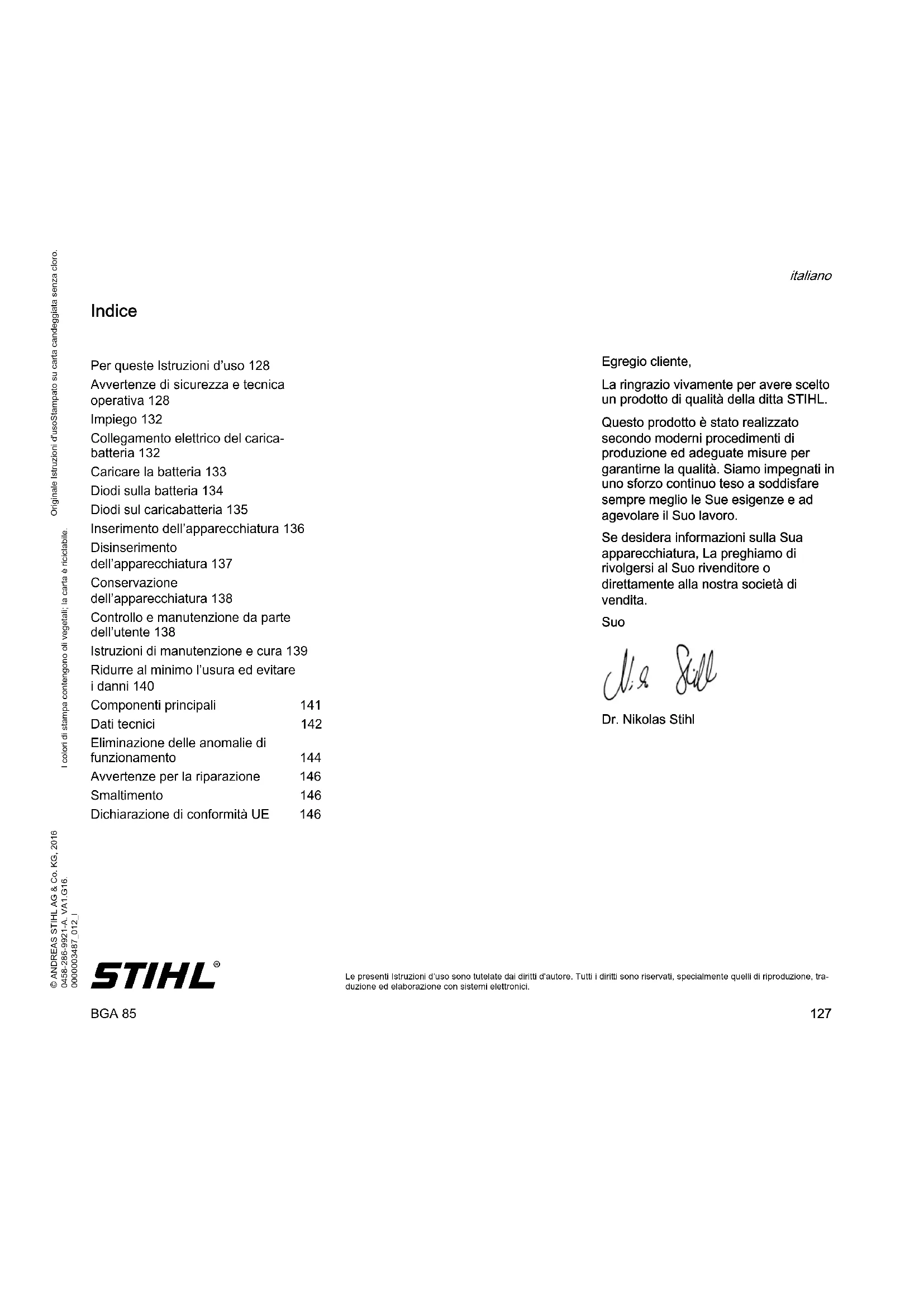 Le presenti Istruzioni d’uso sono tutelate dai diritti d'autore. Tutti i diritti sono riservati, specialmente quelli di riproduzione, tra- duzione ed elaborazione con sistemi elettronici. Indice Egregio cliente, La ringrazio vivamente per avere scelto un prodotto di qualità della ditta STIHL. Questo prodotto è stato realizzato secondo moderni procedimenti di produzione ed adeguate misure per garantirne la qualità. Siamo impegnati in uno sforzo continuo teso a soddisfare sempre meglio le Sue esigenze e ad agevolare il Suo lavoro. Se desidera informazioni sulla Sua apparecchiatura, La preghiamo di rivolgersi al Suo rivenditore o direttamente alla nostra società di vendita. Suo Dr. Nikolas Stihl Per queste Istruzioni d’uso 128 Avvertenze di sicurezza e tecnica operativa 128 Impiego 132 Collegamento elettrico del carica- batteria 132 Caricare la batteria 133 Diodi sulla batteria 134 Diodi sul caricabatteria 135 Inserimento dell’apparecchiatura 136 Disinserimento dell’apparecchiatura 137 Conservazione dell’apparecchiatura 138 Controllo e manutenzione da parte dell’utente 138 Istruzioni di manutenzione e cura 139 Ridurre al minimo l’usura ed evitare i danni 140 Componenti principali 141 Dati tecnici 142 Eliminazione delle anomalie di funzionamento 144 Avvertenze per la riparazione 146 Smaltimento 146 Dichiarazione di conformità UE 146BGA 85 italiano
