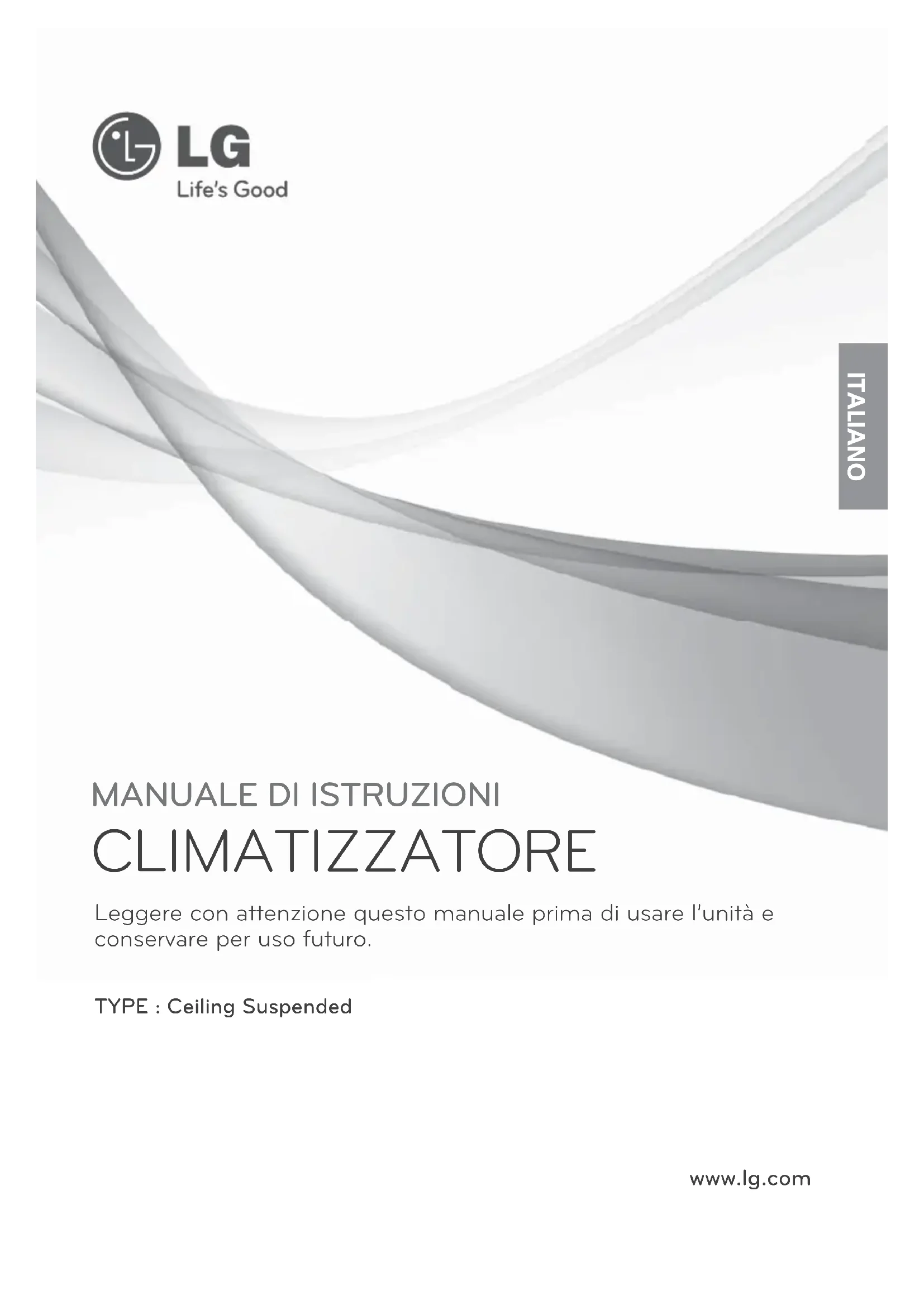 CLIMATIZZATORE Leggere con attenzione questo manuale prima di usare l’unità e conservare per uso futuro. TYPE : Ceiling Suspended ITALIANOSuspendido del techo Manuale di Istruzioni SOMMARIO 2 Unità Interna