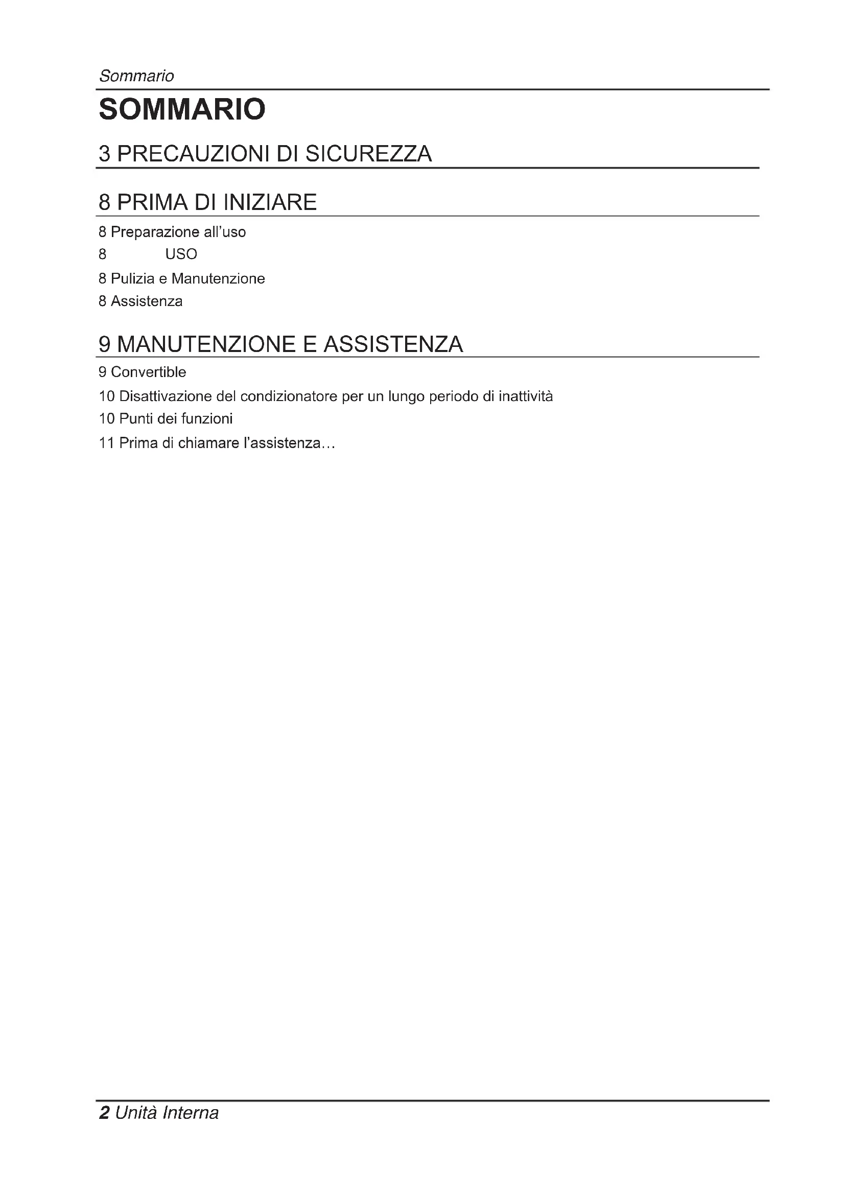 9 Convertible 10 Disattivazione del condizionatore per un lungo periodo di inattività 10 Punti dei funzioni 11 Prima di chiamare l’assistenza… SOMMARIOPrecauzioni di sicurezza Manuale di Istruzioni 3 ITALIANO Precauzioni di sicurezza Installazione