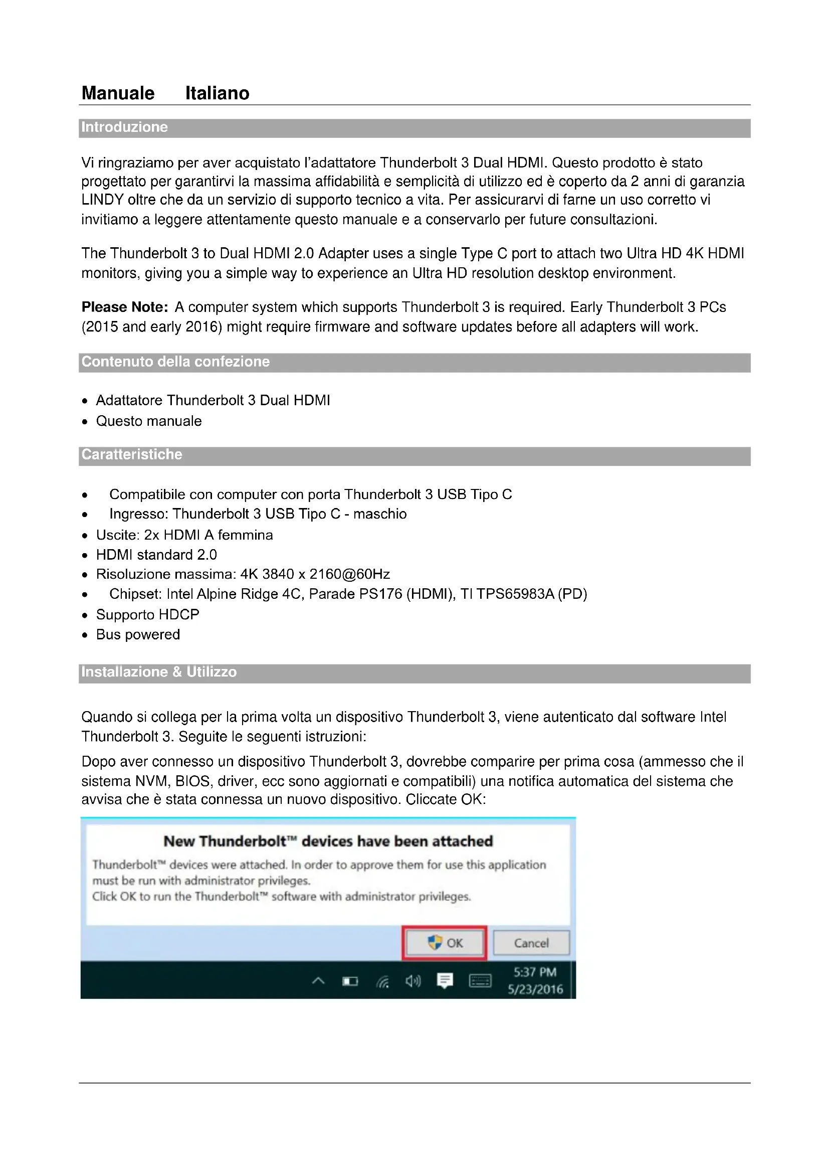 configures dans les paramètres d’affichages comme habituellement.Manuale Italiano Introduzione Vi ringraziamo per aver acquistato l’adattatore Thunderbolt 3 Dual HDMI. Questo prodotto è stato progettato per garantirvi la massima affidabilità e semplicità di utilizzo ed è coperto da 2 anni di garanzia LINDY oltre che da un servizio di supporto tecnico a vita. Per assicurarvi di farne un uso corretto vi invitiamo a leggere attentamente questo manuale e a conservarlo per future consultazioni. The Thunderbolt 3 to Dual HDMI 2.0 Adapter uses a single Type C port to attach two Ultra HD 4K HDMI monitors, giving you a simple way to experience an Ultra HD resolution desktop environment. Please Note: A computer system which supports Thunderbolt 3 is required. Early Thunderbolt 3 PCs (2015 and early 2016) might require firmware and software updates before all adapters will work. Contenuto della confezione Adattatore Thunderbolt 3 Dual HDMI Questo manuale Caratteristiche Compatibile con computer con porta Thunderbolt 3 USB Tipo C Ingresso: Thunderbolt 3 USB Tipo C - maschio Uscite: 2x HDMI A femmina HDMI standard 2.0 Risoluzione massima: 4K 3840 x 2160@60Hz Chipset: Intel Alpine Ridge 4C, Parade PS176 (HDMI), TI TPS65983A (PD) Supporto HDCP Bus powered Installazione & Utilizzo Quando si collega per la prima volta un dispositivo Thunderbolt 3, viene autenticato dal software Intel Thunderbolt 3. Seguite le seguenti istruzioni: Dopo aver connesso un dispositivo Thunderbolt 3, dovrebbe comparire per prima cosa (ammesso che il sistema NVM, BIOS, driver, ecc sono aggiornati e compatibili) una notifica automatica del sistema che avvisa che è stata connessa un nuovo dispositivo. Cliccate OK:Manuale Italiano Una volta cliccato su OK, dovrebbe comparire un popup Windows User Account Control (UAC) che chiede se “vuoi consentire a questa app di apportare modifiche al tuo PC?”. Cliccate Sì. Si aprirà quindi una finestra nella quale potrete confermare il dispositivo Thunderbolt 3 appena collegato. Cliccate sul menu a tendina dove dice “Non connettere” e selezionate “Connettere sempre”. Poi cliccate OK. Identificazione NVM: Per trovare quale versione di firmware NVM avete nel vostro sistema, assicuratevi prima di avere l’ultima versione di software Thunderbolt che può variare a seconda del vostro sistema. Una volta installato l’aggiornamento potete aprire il software dal menu start, Thunderbolt: