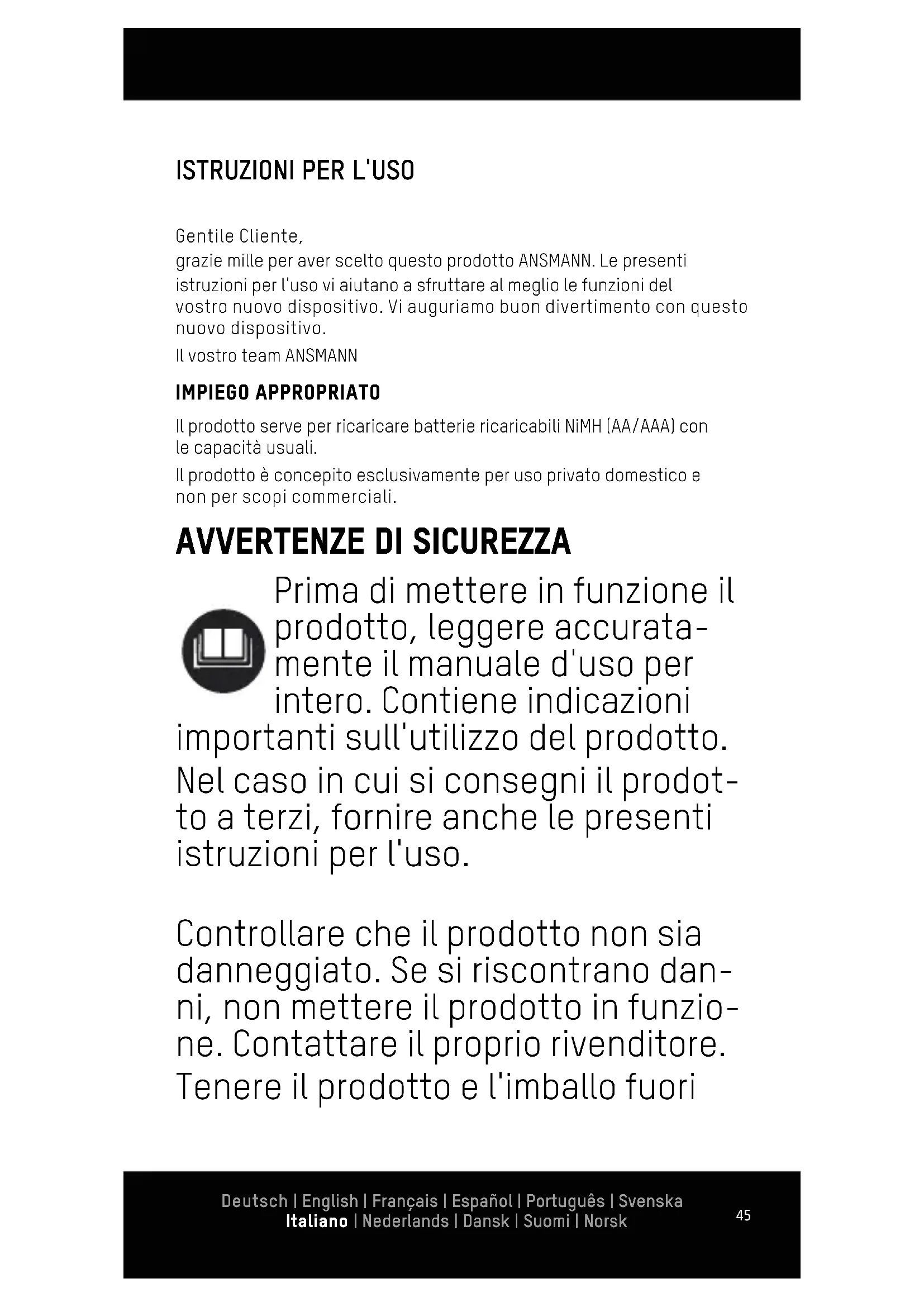 Gentile Cliente, grazie mille per aver scelto questo prodotto ANSMANN. Le presenti istruzioni per l'uso vi aiutano a sfruttare al meglio le funzioni del vostro nuovo dispositivo. Vi auguriamo buon divertimento con questo nuovo dispositivo. Il vostro team ANSMANN IMPIEGO APPROPRIATO Il prodotto serve per ricaricare batterie ricaricabili NiMH (AA/AAA) con le capacità usuali. Il prodotto è concepito esclusivamente per uso privato domestico e non per scopi commerciali.