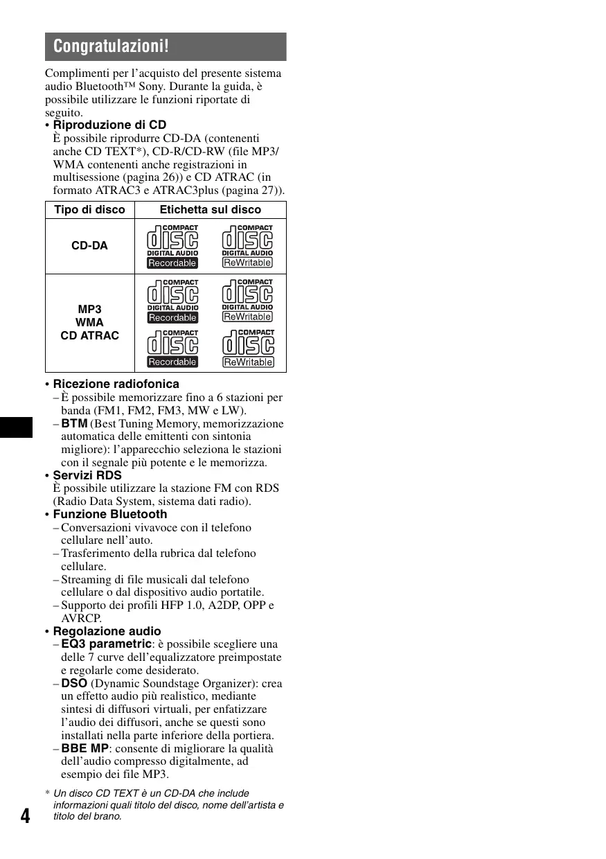 Congratulazioni! Complimenti per l’acquisto del presente sistema audio Bluetooth™ Sony. Durante la guida, è possibile utilizzare le funzioni riportate di seguito. • Riproduzione di CD È possibile riprodurre CD-DA (contenenti anche CD TEXT*), CD-R/CD-RW (file MP3/ WMA contenenti anche registrazioni in multisessione (pagina 26)) e CD ATRAC (in formato ATRAC3 e ATRAC3plus (pagina 27)). Tipo di disco