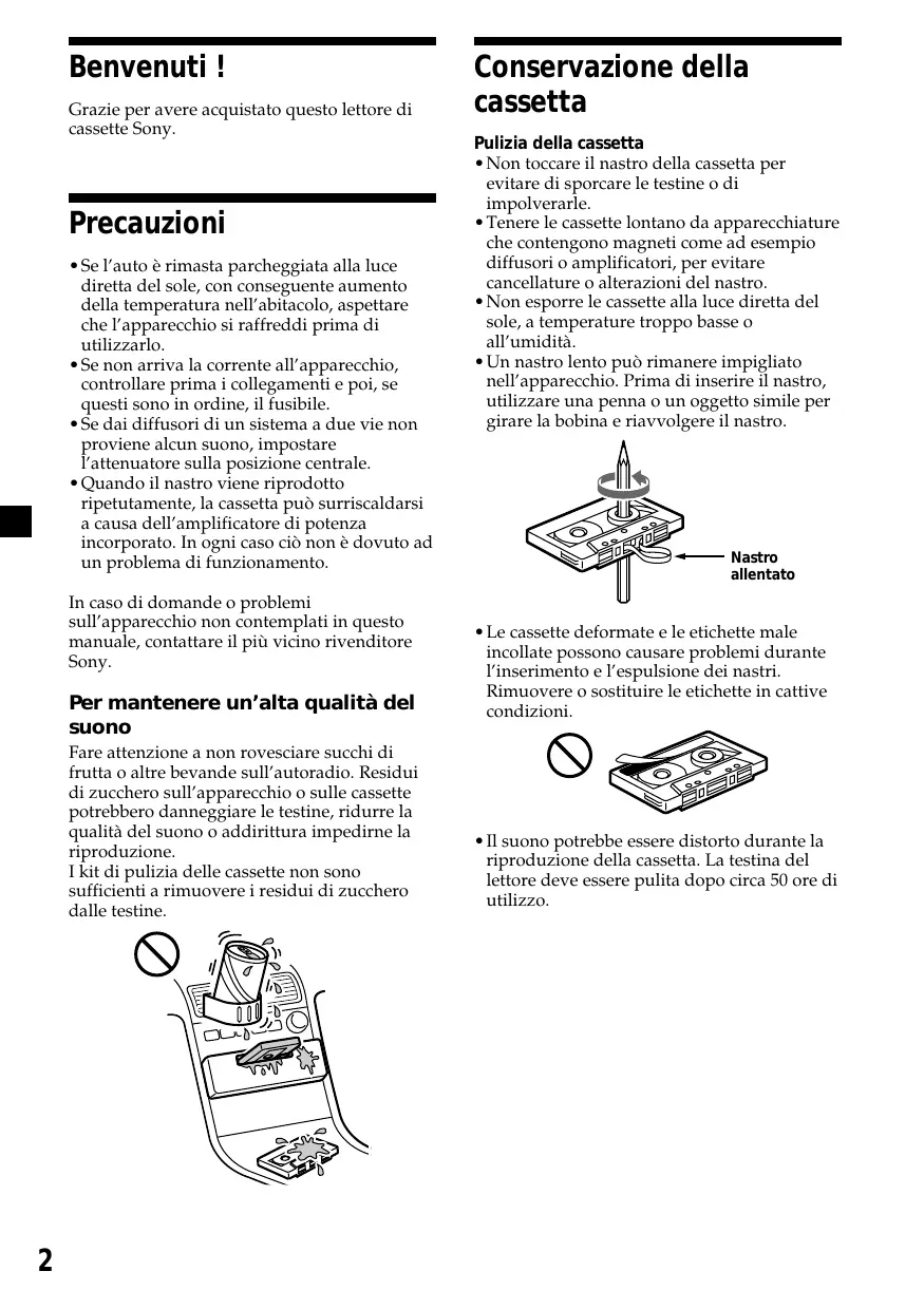 - Quando il nastro viene riprodotto ripetutamente, la cassetta può surriscaldarsi a causa dell’amplificatore di potenza incorporato. In ogni caso ciò non è dovuto ad un problema di funzionamento. In caso di domande o problemi sull’apparecchio non contemplati in questo manuale, contattare il più vicino rivenditore Sony. Per mantenere un’alta qualità del suono Fare attenzione a non rovesciare succhi di frutta o altre bevande sull’autoradio. Residui di zucchero sull’apparecchio o sulle cassette potrebbero danneggiare le testine, ridurre la qualità del suono o addirittura impedirne la riproduzione. I kit di pulizia delle cassette non sono sufficienti a rimuovere i residui di zucchero dalle testine.