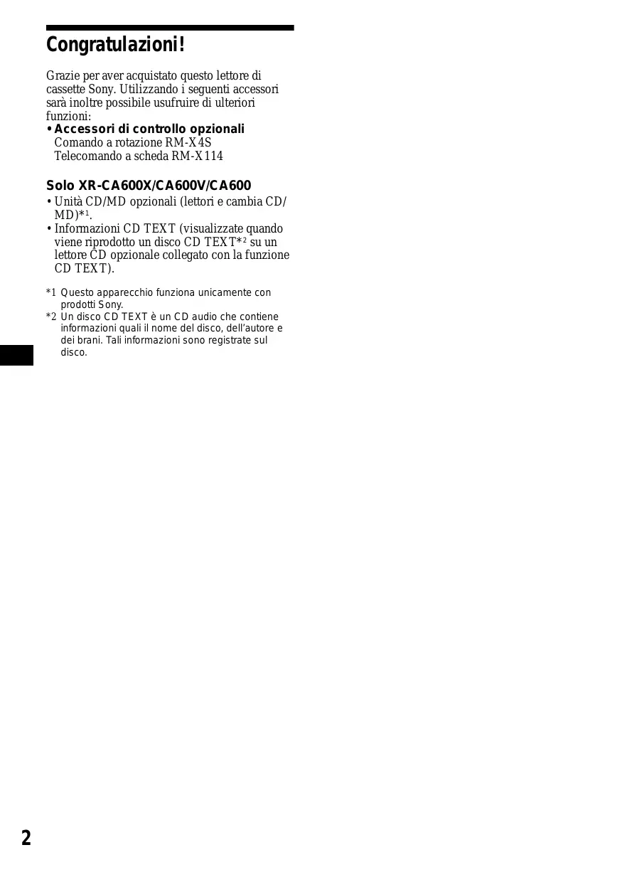 Grazie per aver acquistato quellolettore di cassette Sony. Utilizzato i seguenti accessori sera inoltre possibile usfuriere di ulteriori funzioni: