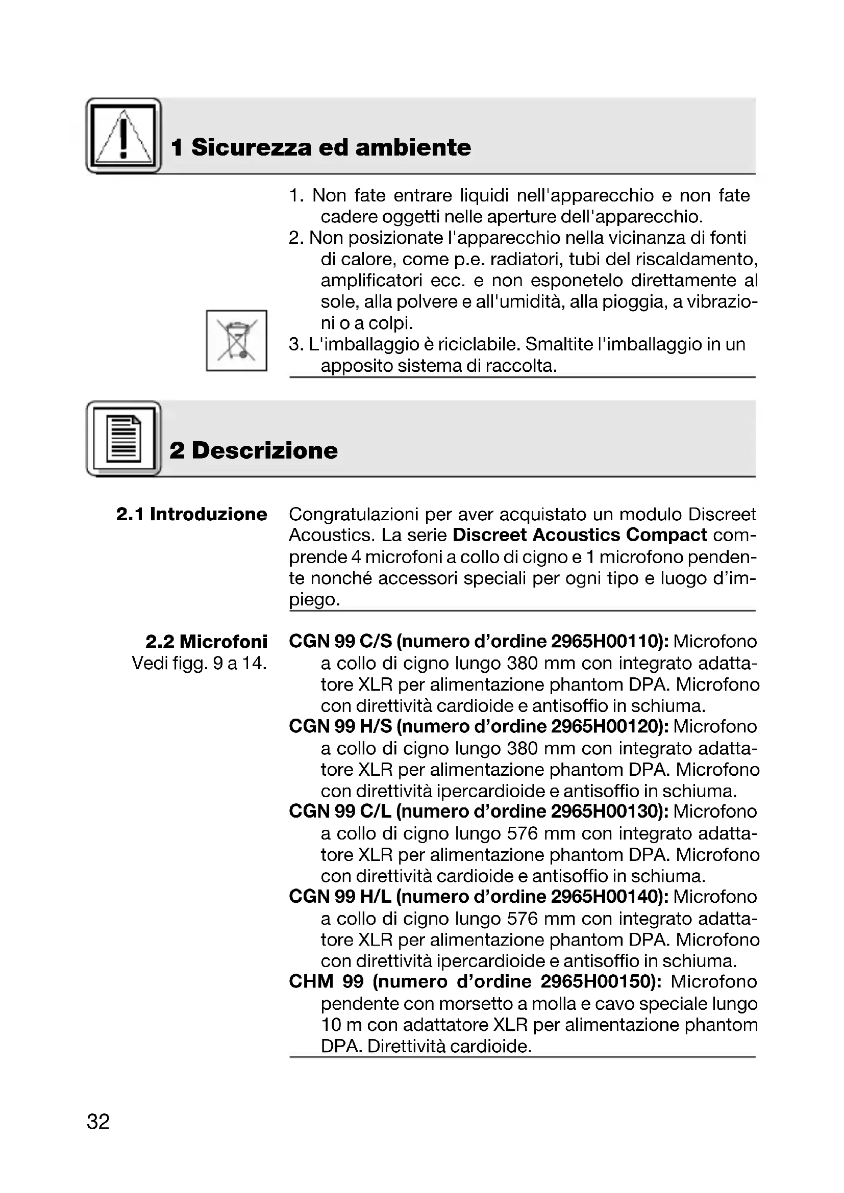 apposito sistema di raccolta. Congratulazioni per aver acquistato un modulo Discreet Acoustics. La serie Discreet Acoustics Compact com- prende 4 microfoni a collo di cigno e 1 microfono penden- te nonché accessori speciali per ogni tipo e luogo d’im- piego. CGN 99 C/S (numero d’ordine 2965H00110): Microfono a collo di cigno lungo 380 mm con integrato adatta- tore XLR per alimentazione phantom DPA. Microfono con direttività cardioide e antisoffio in schiuma. CGN 99 H/S (numero d’ordine 2965H00120): Microfono a collo di cigno lungo 380 mm con integrato adatta- tore XLR per alimentazione phantom DPA. Microfono con direttività ipercardioide e antisoffio in schiuma. CGN 99 C/L (numero d’ordine 2965H00130): Microfono a collo di cigno lungo 576 mm con integrato adatta- tore XLR per alimentazione phantom DPA. Microfono con direttività cardioide e antisoffio in schiuma. CGN 99 H/L (numero d’ordine 2965H00140): Microfono a collo di cigno lungo 576 mm con integrato adatta- tore XLR per alimentazione phantom DPA. Microfono con direttività ipercardioide e antisoffio in schiuma. CHM 99 (numero d’ordine 2965H00150): Microfono pendente con morsetto a molla e cavo speciale lungo 10 m con adattatore XLR per alimentazione phantom DPA. Direttività cardioide. 2 Descrizione 1 Sicurezza ed ambiente 4457_09_AKG_BDA_GN-Compact_ps 10.09.2009 11:53 Uhr Seite 3233 2 Descrizione
