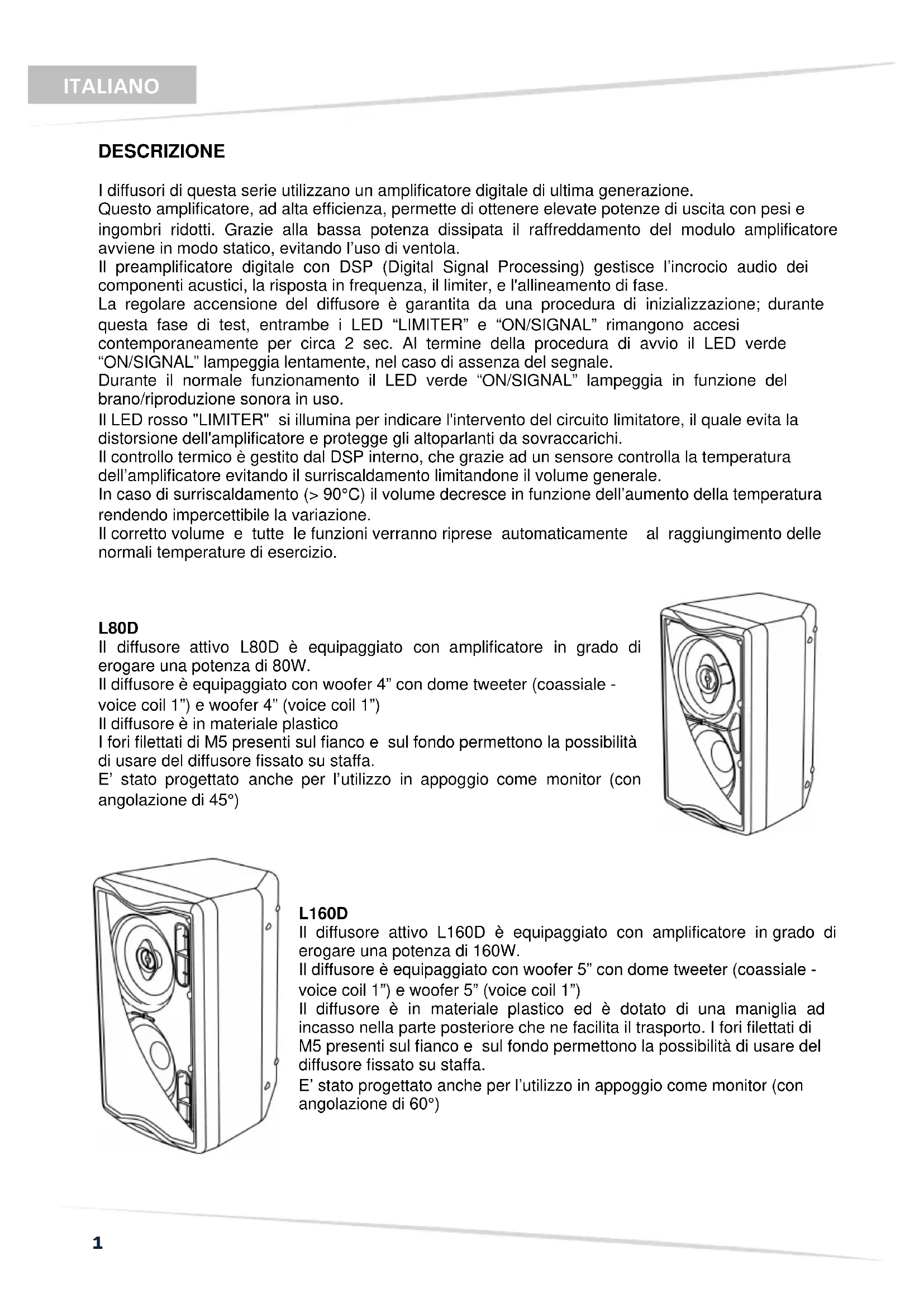 L160D Il diffusore attivo L160D è equipaggiato con amplificatore in grado di erogare una potenza di 160W. Il diffusore è equipaggiato con woofer 5” con dome tweeter (coassiale - voice coil 1”) e woofer 5” (voice coil 1”) Il diffusore è in materiale plastico ed è dotato di una maniglia ad incasso nella parte posteriore che ne facilita il trasporto. I fori filettati di M5 presenti sul fianco e sul fondo permettono la possibilità di usare del diffusore fissato su staffa. E’ stato progettato anche per l’utilizzo in appoggio come monitor (con angolazione di 60°)2 ITALIANO