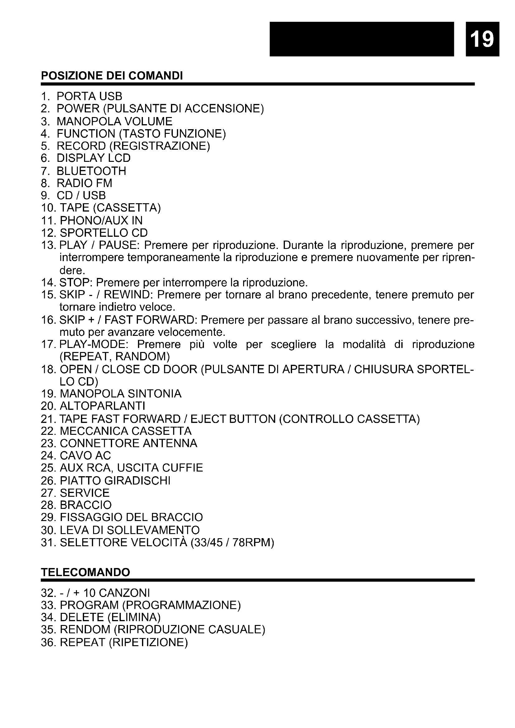 17. PLAY-MODE: Premere più volte per scegliere la modalità di riproduzione