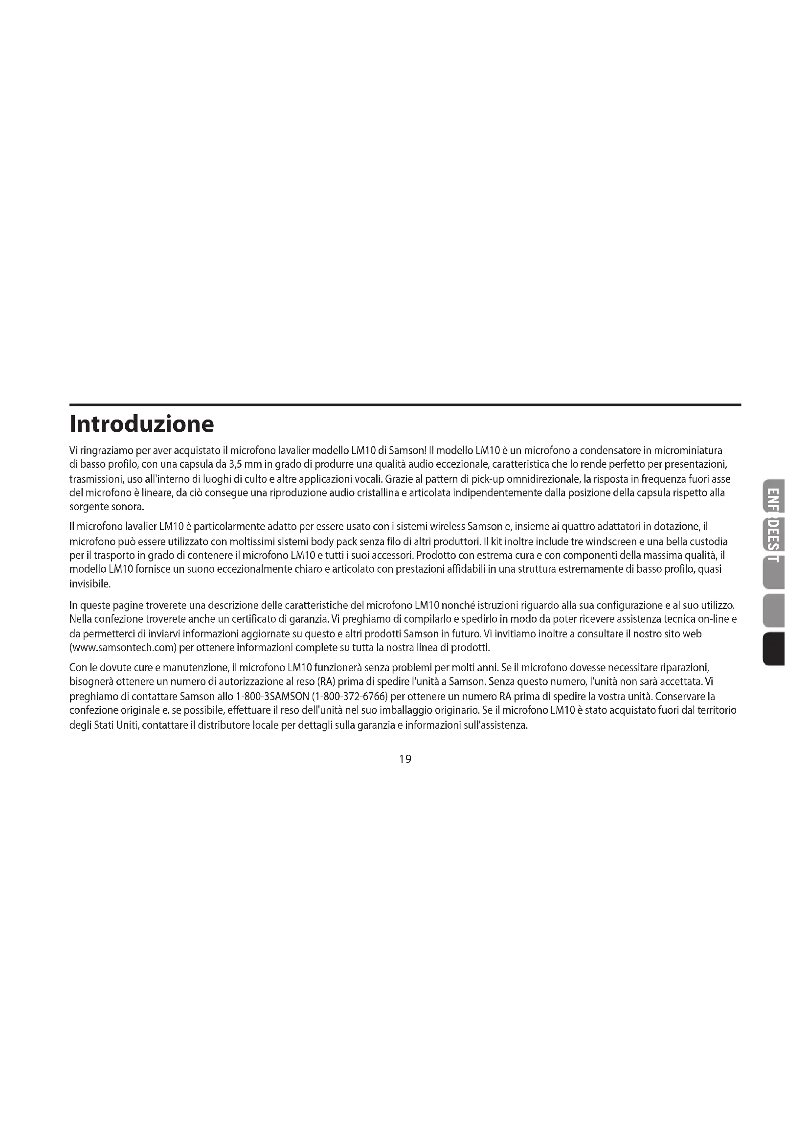- Cuando el micrófono vaya a utilizarse en el exterior o para reducir el ruido de la respiración, instale una de las pantallas antiviento incluidas.18 Patrón Polar Respuesta de Frecuencia Elemento: . . . . . . . . . . . . . .Condensador electret posterior Patrón polar: . . . . . . . . . . . .Omnidireccional Respuesta de frecuencia:. . . . .20 Hz - 20 KHz Sensibilidad: . . . . . . . . . . . .-45 ±3 dB 1 V/Pa a 1 khz Impedancia de salida:. . . . . . .2 KΩ ±30% SPL máx.:. . . . . . . . . . . . . . .140 dB Tensión de funcionamiento:. . .1,5 - 12 V CC Cable: . . . . . . . . . . . . . . . . .Φ 1,4 mm* 1,2 m Peso: . . . . . . . . . . . . . . . . .13 g Dimensiones: . . . . . . . . . . . .Φ 3,5 mm Conector de salida: . . . . . . . .2,5 mm Adaptadores incluidos . . . . . .Shure, AT, AKG, Sennhieser Accesorio: . . . . . . . . . . . . . . Pantalla antiviento, pinza para solapa/corbata Las especificaciones están sujetas a cambios sin previo aviso. Especificaciones19 EN FR DE ES IT Introduzione Vi ringraziamo per aver acquistato il microfono lavalier modello LM10 di Samson! Il modello LM10 è un microfono a condensatore in microminiatura di basso profilo, con una capsula da 3,5 mm in grado di produrre una qualità audio eccezionale, caratteristica che lo rende perfetto per presentazioni, trasmissioni, uso all'interno di luoghi di culto e altre applicazioni vocali. Grazie al pattern di pick-up omnidirezionale, la risposta in frequenza fuori asse del microfono è lineare, da ciò consegue una riproduzione audio cristallina e articolata indipendentemente dalla posizione della capsula rispetto alla sorgente sonora. Il microfono lavalier LM10 è particolarmente adatto per essere usato con i sistemi wireless Samson e, insieme ai quattro adattatori in dotazione, il microfono può essere utilizzato con moltissimi sistemi body pack senza filo di altri produttori. Il kit inoltre include tre windscreen e una bella custodia per il trasporto in grado di contenere il microfono LM10 e tutti i suoi accessori. Prodotto con estrema cura e con componenti della massima qualità, il modello LM10 fornisce un suono eccezionalmente chiaro e articolato con prestazioni affidabili in una struttura estremamente di basso profilo, quasi invisibile. In queste pagine troverete una descrizione delle caratteristiche del microfono LM10 nonché istruzioni riguardo alla sua configurazione e al suo utilizzo. Nella confezione troverete anche un certificato di garanzia. Vi preghiamo di compilarlo e spedirlo in modo da poter ricevere assistenza tecnica on-line e da permetterci di inviarvi informazioni aggiornate su questo e altri prodotti Samson in futuro. Vi invitiamo inoltre a consultare il nostro sito web (www.samsontech.com) per ottenere informazioni complete su tutta la nostra linea di prodotti. Con le dovute cure e manutenzione, il microfono LM10 funzionerà senza problemi per molti anni. Se il microfono dovesse necessitare riparazioni, bisognerà ottenere un numero di autorizzazione al reso (RA) prima di spedire l'unità a Samson. Senza questo numero, l’unità non sarà accettata. Vi preghiamo di contattare Samson allo 1-800-3SAMSON (1-800-372-6766) per ottenere un numero RA prima di spedire la vostra unità. Conservare la confezione originale e, se possibile, eettuare il reso dell'unità nel suo imballaggio originario. Se il microfono LM10 è stato acquistato fuori dal territorio degli Stati Uniti, contattare il distributore locale per dettagli sulla garanzia e informazioni sull'assistenza.20 Caratteristiche del microfono LM10 Il microfono lavalier omnidirezionale LM10 offre un'ottima riproduzione della voce in una struttura di basso profilo, quasi invisibile. Di seguito sono elencate le caratteristiche principali dell'LM10: