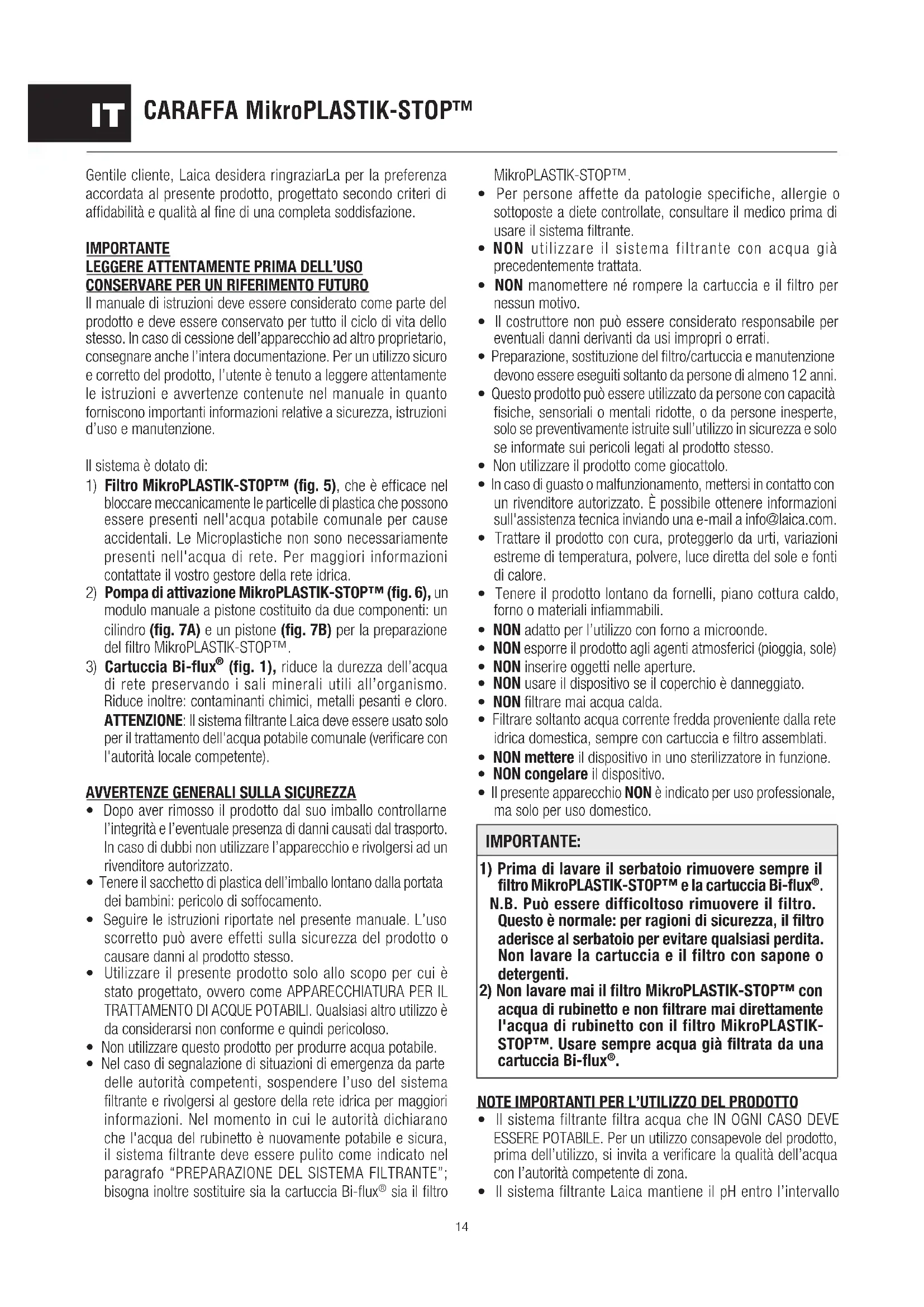 Smaltire tutti i componenti in conformità alla rispettiva classe di appartenenza. GARANZIA Il presente apparecchio è garantito 2 anni dal momento della consegna del bene, ovvero da altro maggiore termine previsto dalla legislazione nazionale di residenza del consumatore. Tale previsione è conforme alla legislazione italiana ed europea. I prodotti LAICA sono progettati per l’uso domestico e non ne è consentito l’utilizzo in pubblici esercizi. La garanzia copre solo i difetti di produzione e non è valida qualora il danno sia causato da evento accidentale, errato utilizzo, negligenza o uso improprio del prodotto. Utilizzare solamente gli accessori forniti; l’utilizzo di accessori diversi può comportare la decadenza della garanzia. Non aprire l’apparecchio per nessun motivo; in caso di apertura o manomissione, la garanzia decade definitivamente. La garanzia non si applica alle parti soggette ad usura e alle batterie quando fornite in dotazione. Trascorsi i 2 anni dalla consegna, ovvero da altro maggiore termine previsto dalla legislazione nazionale di residenza del consumatore, la garanzia decade; in questo caso gli interventi di assistenza tecnica verranno eseguiti a pagamento. Informazioni su interventi di assistenza tecnica, siano essi in garanzia o a pagamento, potranno essere richieste contattando info@laica.com. Non è dovuta nessuna forma di contributo per le riparazioni e sostituzioni di prodotti che rientrino nei termini della garanzia. In caso di guasti rivolgersi al rivenditore; NON spedire direttamente a LAICA. Tutti gli interventi in garanzia (compresi quelli di sostituzione del prodotto o di una sua parte) non prolungheranno la durata del periodo di garanzia originale del prodotto sostituito. La casa costruttrice declina ogni responsabilità per eventuali danni che possono, direttamente o indirettamente, derivare a persone, cose ed animali domestici in conseguenza della mancata osservanza di tutte le prescrizioni indicate nell’apposito libretto istruzioni e concernenti, specialmente, le avvertenze in tema di installazione, uso e manutenzione dell’apparecchio. É facoltà della ditta LAICA, essendo costantemente impegnata nel miglioramento dei propri prodotti, modificare senza alcun preavviso in tutto o in parte i propri prodotti in relazione a necessità di produzione, senza che ciò comporti nessuna responsabilità da parte della ditta LAICA o dei suoi rivenditori. Per ulteriori informazioni: www.laica.it. CARAFFA MikroPLASTIK-STOP™19