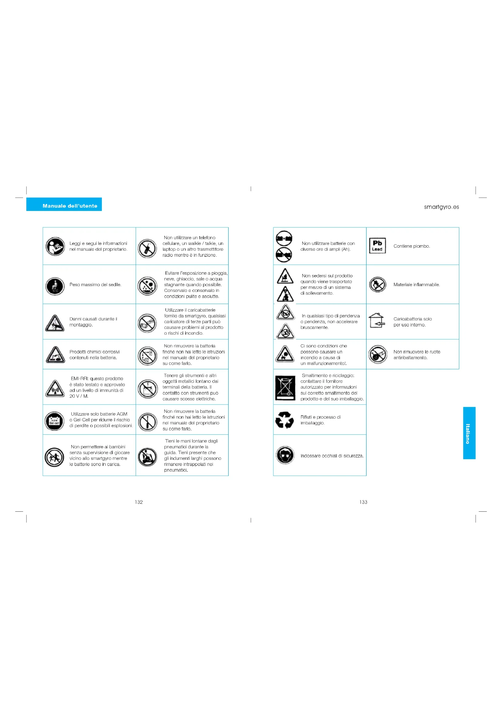 smartgyro.es Leggi e segui le informazioni nel manuale del proprietario. Non utilizzare un telefono cellulare, un walkie / talkie, un laptop o un altro trasmettitore radio mentre è in funzione. Non utilizzare batterie con diverse ore di ampli (Ah). Contiene piombo. Peso massimo del sedile. Evitare l’esposizione a pioggia, neve, ghiaccio, sale o acqua stagnante quando possibile. Conservalo e conservalo in condizioni pulite e asciutte. Non sedersi sul prodotto quando viene trasportato per mezzo di un sistema di sollevamento. Materiale infiammabile. Danni causati durante il montaggio. Utilizzare il caricabatterie fornito da smartgyro, qualsiasi caricatore di terze parti può causare problemi al prodotto o rischi di incendio. In qualsiasi tipo di pendenza o pendenza, non accelerare bruscamente. Caricabatteria solo per uso interno. Prodotti chimici corrosivi contenuti nella batteria. Non rimuovere la batteria finché non hai letto le istruzioni nel manuale del proprietario su come farlo. Ci sono condizioni che possono causare un incendio a causa di un malfunzionamento!. Non rimuovere le ruote antiribaltamento. EMI-RFI: questo prodotto è stato testato e approvato ad un livello di immunità di 20 V / M. Tenere gli strumenti e altri oggetti metallici lontano dai terminali della batteria. Il contatto con strumenti può causare scosse elettriche. Smaltimento e riciclaggio: contattare il fornitore autorizzato per informazioni sul corretto smaltimento del prodotto e del suo imballaggio. Utilizzare solo batterie AGM o Gel-Cell per ridurre il rischio di perdite o possibili esplosioni. Non rimuovere la batteria finché non hai letto le istruzioni nel manuale del proprietario su come farlo. Rifiuti e processo di imballaggio. Non permettere ai bambini senza supervisione di giocare vicino allo smartgyro mentre le batterie sono in carica. Tieni le mani lontane dagli pneumatici durante la guida. Tieni presente che gli indumenti larghi possono rimanere intrappolati nei pneumatici. Indossare occhiali di sicurezza.135 Italiano Manuale dell’utente