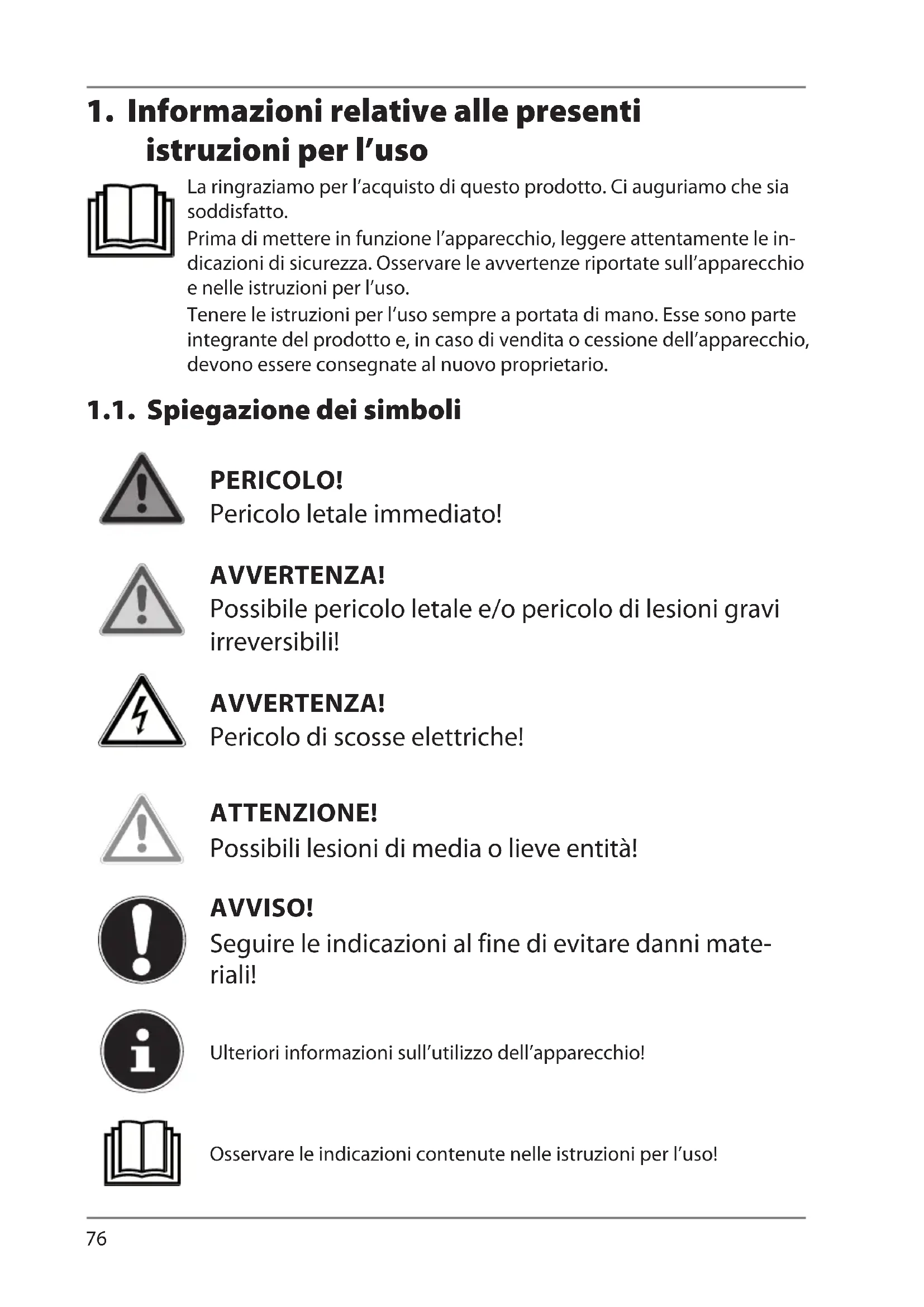 istruzioni per l’uso La ringraziamo per l’acquisto di questo prodotto. Ci auguriamo che sia soddisfatto. Prima di mettere in funzione l’apparecchio, leggere attentamente le in- dicazioni di sicurezza. Osservare le avvertenze riportate sull’apparecchio e nelle istruzioni per l’uso. Tenere le istruzioni per l’uso sempre a portata di mano. Esse sono parte integrante del prodotto e, in caso di vendita o cessione dell’apparecchio, devono essere consegnate al nuovo proprietario. 1.1. Spiegazione dei simboli PERICOLO! Pericolo letale immediato! AVVERTENZA! Possibile pericolo letale e/o pericolo di lesioni gravi irreversibili! AVVERTENZA! Pericolo di scosse elettriche! ATTENZIONE! Possibili lesioni di media o lieve entità! AVVISO! Seguire le indicazioni al fine di evitare danni mate- riali! Ulteriori informazioni sull’utilizzo dell’apparecchio! Osservare le indicazioni contenute nelle istruzioni per l’uso!DE