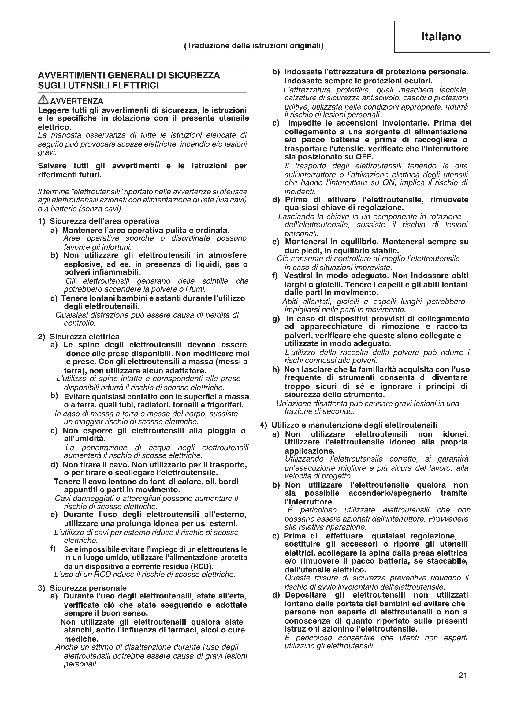 a) Mantenere l’area operativa pulita e ordinata. Aree operative sporche o disordinate possono favorire gli infortuni. b) Non utilizzare gli elettroutensili in atmosfere esplosive, ad es. in presenza di liquidi, gas o polveri inammabili. Gli elettroutensili generano delle scintille che potrebbero accendere la polvere o i fumi. c) Tenere lontani bambini e astanti durante l’utilizzo degli elettroutensili. Qualsiasi distrazione può essere causa di perdita di controllo.