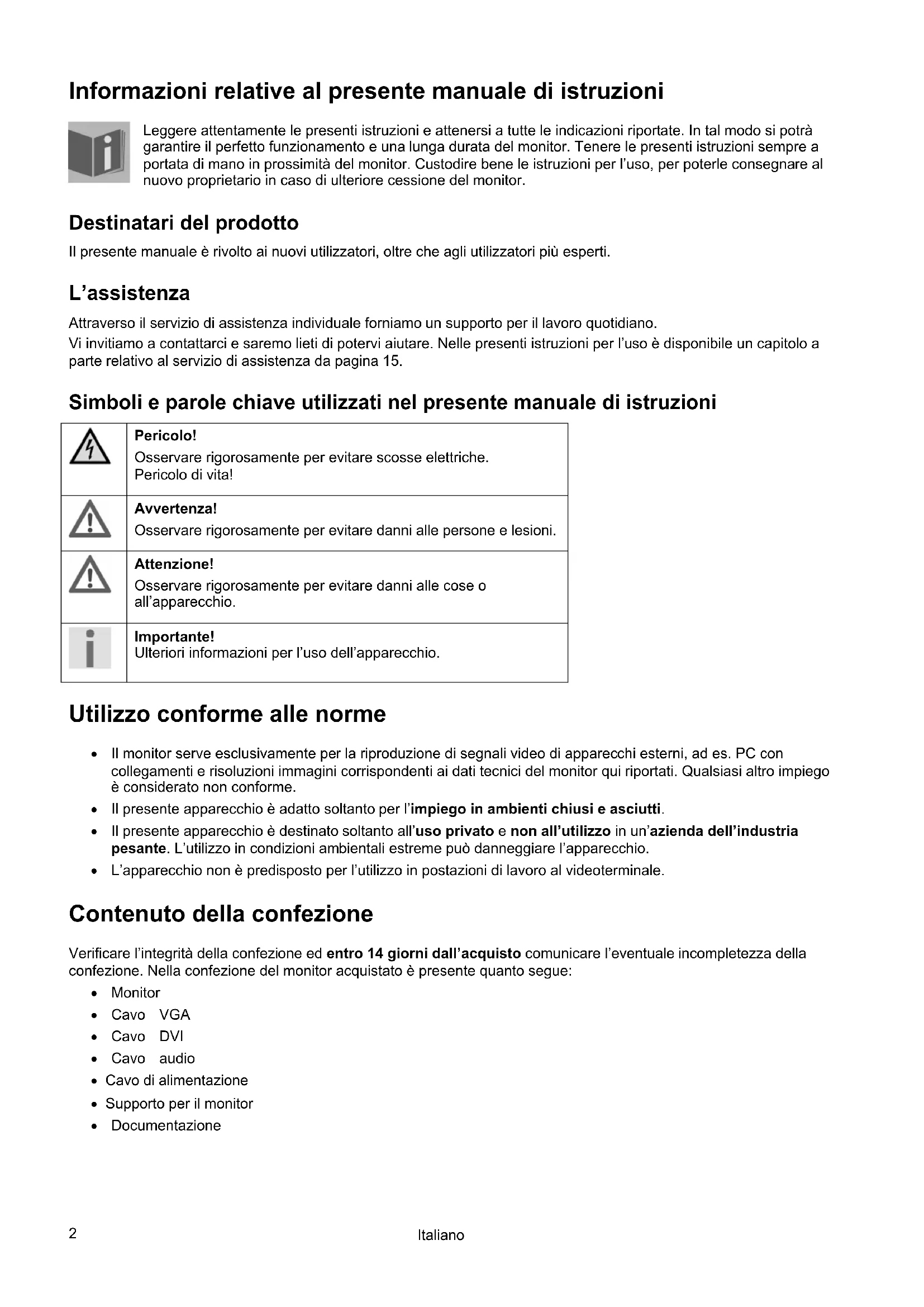 Informazioni relative al presente manuale di istruzioni Leggere attentamente le presenti istruzioni e attenersi a tutte le indicazioni riportate. In tal modo si potrà garantire il perfetto funzionamento e una lunga durata del monitor. Tenere le presenti istruzioni sempre a portata di mano in prossimità del monitor. Custodire bene le istruzioni per l’uso, per poterle consegnare al nuovo proprietario in caso di ulteriore cessione del monitor. Destinatari del prodotto Il presente manuale è rivolto ai nuovi utilizzatori, oltre che agli utilizzatori più esperti. L’assistenza Attraverso il servizio di assistenza individuale forniamo un supporto per il lavoro quotidiano. Vi invitiamo a contattarci e saremo lieti di potervi aiutare. Nelle presenti istruzioni per l’uso è disponibile un capitolo a parte relativo al servizio di assistenza da pagina 15. Simboli e parole chiave utilizzati nel presente manuale di istruzioni Pericolo! Osservare rigorosamente per evitare scosse elettriche. Pericolo di vita! Avvertenza! Osservare rigorosamente per evitare danni alle persone e lesioni. Attenzione! Osservare rigorosamente per evitare danni alle cose o all’apparecchio. Importante! Ulteriori informazioni per l’uso dell’apparecchio. Utilizzo conforme alle norme Il monitor serve esclusivamente per la riproduzione di segnali video di apparecchi esterni, ad es. PC con collegamenti e risoluzioni immagini corrispondenti ai dati tecnici del monitor qui riportati. Qualsiasi altro impiego è considerato non conforme. Il presente apparecchio è adatto soltanto per l’impiego in ambienti chiusi e asciutti. Il presente apparecchio è destinato soltanto all’uso privato e non all’utilizzo in un’azienda dell’industria pesante. L’utilizzo in condizioni ambientali estreme può danneggiare l’apparecchio. L’apparecchio non è predisposto per l’utilizzo in postazioni di lavoro al videoterminale. Contenuto della confezione Verificare l’integrità della confezione ed entro 14 giorni dall’acquisto comunicare l’eventuale incompletezza della confezione. Nella confezione del monitor acquistato è presente quanto segue: Monitor Cavo VGA Cavo DVI Cavo audio Cavo di alimentazione Supporto per il monitor DocumentazioneIndicazioni di sicurezza
