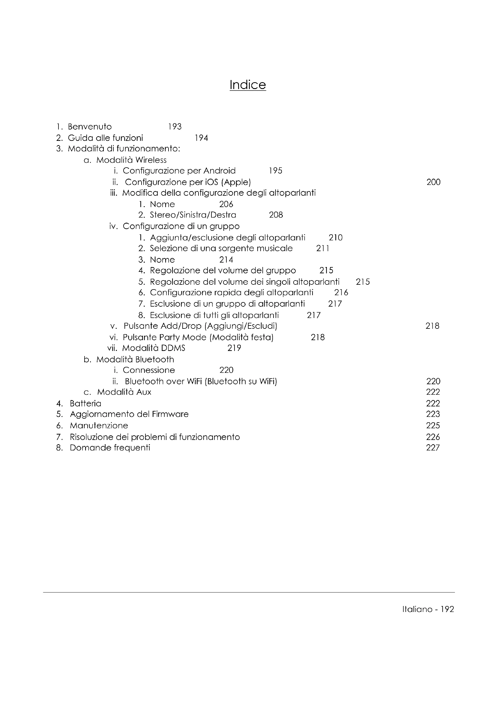 8. Domande frequenti 227__________________________________________________________________________________________________ Italiano - 193 Benvenuto Congratulazioni per il tuo acquisto! ART by Tivoli Audio unisce un design classico alla tecnologia più recente per creare una soluzione semplice per l'audio wireless in casa. Integrata in casse di legno da arredi e rifinita con una griglia in tessuto Gabriel® di alta qualità, questa collezione migliora ulteriormente la perfezione artigianale e la tecnologia della linea di prodotti Tivoli Audio. Questi altoparlanti con funzionalità Wireless e Bluetooth® offrono un'ampia varietà di configurazioni per soddisfare ogni esigenza di riproduzione. Un solo altoparlante con musica Spotify in cucina, una coppia di altoparlanti stereo in sala da pranzo, o una serie di altoparlanti con la tua playlist per una festa in tutta la casa: gli altoparlanti ART offrono soluzioni semplici e flessibili, ideali per ogni ambiente e per migliorare la vita con la musica. Inizia con un'unità e scoprirai com'è facile ampliare la rete secondo il tuo stile in ogni ambiente. Sappiamo che non vedi l'ora di iniziare ad ascoltare la musica con il tuo nuovo acquisto, ma per sfruttare appieno tutte le sue funzionalità, ti preghiamo di dedicare un momento a leggere questo manuale d'uso e le istruzioni per la sicurezza. Per eventuali domande, non esitare a metterti in contatto con il tuo rivenditore di fiducia o con Tivoli Audio. Conserva l'imballaggio originale, nel caso in cui sia necessario spedire il tuo apparecchio. Nell'imballaggio del tuo Cube troverai: (1) Spine di alimentazione esterna e supplementari Mettiti in contatto con il rivenditore di fiducia o con Tivoli Audio se manca uno di questi articoli.__________________________________________________________________________________________________ Italiano - 194 Guida alle funzioni LOGO Tivoli Audio: Questo è un comando capacitivo a sfioramento sotto il legno. Nella modalità wireless, esegue la funzione Pause/Play per l'ascolto della musica. Nella modalità Bluetooth silenzia l'altoparlante. POWER (ATTIVAZIONE): Premi per attivare l'unità. Tieni premuto per disattivarla. SETUP (CONFIGURAZIONE): Premi per abilitare l'altoparlante a collegarsi alla rete domestica PARTY MODE (MODALITÀ FESTA): Premi per inviare la musica da questo altoparlante a tutti gli altri altoparlanti collegati. Per ulteriori informazioni consulta la sezione “Party Mode” (Modalità festa) di questo manuale. ADD/DROP (AGGIUNGI/ESCLUDI): Se l'altoparlante è collegato a un gruppo, premendo questo pulsante esso viene escluso dal gruppo. Se l'altoparlante non è collegato a un gruppo, premendo questo pulsante esso viene collegato al gruppo disponibile successivo. Per ulteriori informazioni consulta la sezione “Add/Drop” (Aggiungi/Escludi) di questo manuale. SOURCE (SORGENTE): Premi per commutare fra le sorgenti audio. La sorgente audio è indicata dal colore del LED. Nella modalità Bluetooth, tieni premuto questo pulsante per un secondo se sta già lampeggiando o, se la luce è continua, fino a quando inizia a lampeggiare, per abilitare la modalità di connessione. LED verde – Modalità wireless LED blu – Modalità Bluetooth LED viola – Modalità Aux VOLUME -: Premi per ridurre il volume. VOLUME +: Premi per aumentare il volume. DC Power: Collega l'adattatore di potenza Tivoli per caricare la batteria o per alimentare l'altoparlante. Utilizza esclusivamente la sorgente di alimentazione fornita con questo prodotto. Se la sorgente di alimentazione è danneggiata o posizionata in modo non corretto, sostituiscila esclusivamente con un prodotto identico. Gli adattatori DC devono avere una potenza di 15 VDC 1500 mA. AUX: Collega direttamente la sorgente musicale per l'ascolto indipendente. Service (Assistenza): Porta per assistenza. Deve essere utilizzata esclusivamente presso un centro assistenza autorizzato Tivoli.__________________________________________________________________________________________________ Italiano - 195 Modalità Wireless Configurazione per Android Prima di configurare il nuovo speaker wireless, scarica l'App Tivoli Audio Wireless per inviare i comandi agli altoparlanti. L'App è disponibile su Google Play store e Apple App store.
