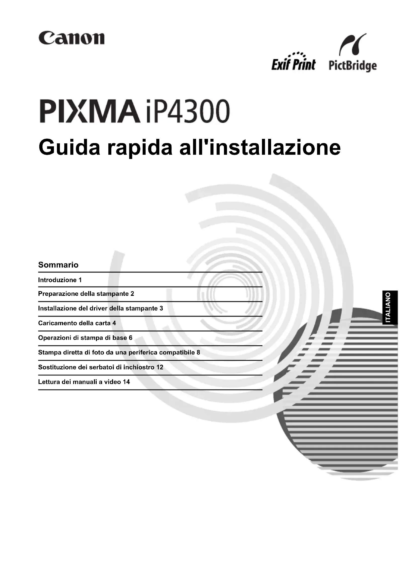 per le attrezzature da ufficio è un programma globale che promuove il risparmio energetico nell'utilizzo dei computer e di altre apparecchiature da ufficio. Il programma sostiene lo sviluppo e la diffusione di prodotti con funzioni che riducono efficacemente il consumo di energia. È un sistema aperto a cui le aziende partecipano volontariamente. I prodotti interessati sono le apparecchiature da ufficio quali computer, monitor, stampanti, fax e fotocopiatrici. Gli standard e i logo sono uguali per tutte le nazioni partecipanti. Requisiti di alimentazione Non usare tensioni elettriche diverse da quelle del paese di acquisto. L'utilizzo di tensioni o frequenze di alimentazione errate può causare incendi o scosse elettriche. Tensione e frequenza dell'alimentazione corrette sono: CA 100-240 V, 50/60 Hz Informazioni sui materiali di consumo I materiali di consumo (serbatoi di inchiostro / cartucce FINE (Fine Cartridges)) sono disponibili per 5 anni dall'interruzione della produzione. Precauzioni per la sicurezza Avviso z Non tentare mai di disinserire o inserire il cavo di alimentazione nella presa di corrente con le mani bagnate. z Non danneggiare, modificare, tirare, piegare eccessivamente o attorcigliare il cavo di alimentazione. Non poggiare oggetti pesanti sopra di esso. z Non utilizzare tensioni elettriche diverse da quelle del paese di acquisto. L'uso di tensioni o frequenze di alimentazione non corrette può causare incendi o scosse elettriche.z Inserire a fondo la spina nella presa elettrica. Avvertenza z Per ragioni di sicurezza, conservare i serbatoi di inchiostro fuori dalla portata dei bambini. z Non scuotere né lasciare cadere i serbatoi. L'inchiostro potrebbe fuoriuscire e macchiare gli abiti e le mani. Leggere anche Precauzioni per la sicurezza nel Manuale dell'utente a video. Rispettare le avvertenze per evitare lesioni personali o danni alla stampante. Numero di modello: K10284 (iP4300)1Introduzione ITALIANO Introduzione Grazie per avere acquistato una stampante Canon Inkjet. La presente Guida rapida all'installazione utilizza i simboli riportati di seguito per segnalare le informazioni importanti. Seguire sempre le istruzioni indicate da questi simboli. Avviso La mancata osservanza di queste istruzioni può causare la morte o gravi lesioni personali dovute a un uso non corretto dell'apparecchiatura. Il rispetto delle istruzioni garantisce un funzionamento sicuro. Avvertenza La mancata osservanza di queste istruzioni può causare un utilizzo errato dell'attrezzatura e risultare in lesioni personali o danni al dispositivo. Il rispetto delle istruzioni garantisce un funzionamento sicuro. Importante Istruzioni da osservare per un funzionamento sicuro. Informazioni sui marchi z "Windows" e "Internet Explorer" sono marchi di Microsoft Corporation, registrati negli Stati Uniti e in altri paesi. z "Macintosh" e "Mac" sono marchi di Apple Computer, Inc., registrati negli Stati Uniti e in altri paesi. z "Adobe" e "Adobe RGB (1998)" sono marchi registrati o marchi di Adobe Systems Incorporated negli Stati Uniti e/o in altri paesi. Copyright ©2006 CANON INC. Tutti i diritti riservati. Le informazioni contenute nella presente pubblicazione non possono essere trasmesse o copiate in alcun modo senza esplicito consenso scritto.2 Preparazione della stampante ITALIANO Preparazione della stampante Assicurarsi di leggere prima la pagina relativa alla procedura d'installazione per installare e preparare la stampante per l'uso. 1 Accendere la stampante. 2 Installare la testina di stampa. 3 Installare i serbatoi d'inchiostro. 4 Caricare la carta. Nella procedura riportata di seguito, si richiede di effettuare l'allineamento della testina di stampa e di inserire un foglio di carta comune di formato A4 o Letter nell'alimentatore automatico. Avvertenza Accertarsi di aver tolto il materiale protettivo prima di accendere la stampante. Nota La posizione del nastro potrebbe essere diversa da quella mostrata. Avvertenza Non toccare altri componenti interni diversi dalla leva di bloccaggio della testina di stampa. Importante Se il coperchio superiore viene lasciato aperto per più di 10 minuti, il supporto della testina di stampa si sposta verso destra. In questo caso, chiudere e riaprire il coperchio superiore. Nota z All'interno dell'involucro della testina di stampa o all'interno del cappuccio protettivo potrebbe esserci un po' di inchiostro trasparente o celeste, che comunque non pregiudica la qualità di stampa. Fare attenzione a non sporcarsi quando si maneggiano le testine di stampa.z Non riapplicare il cappuccio protettivo dopo la sua rimozione. Importante z Accertarsi che tutti i serbatoi d'inchiostro siano installati nell'ordine indicato sull'etichetta. Per utilizzare la stampante, è necessario che siano installati tutti i serbatoi d'inchiostro. z Quando tutti i serbatoi d'inchiostro sono stati installati, la spia [POWER] (ACCENSIONE) lampeggia in verde. Prima di continuare, attendere circa 2 minuti finché la spia [POWER] (ACCENSIONE) non lampeggia più e diventa una luce verde fissa e la stampante non emette i suoni delle operazioni iniziali. Nota z Accertarsi di aver tolto la pellicola trasparente dal serbatoio procedendo nell'esatto ordine indicato al punto 3 della procedura d'installazione. z Non stringere i lati del serbatoio perché ciò potrebbe causare la fuoriuscita dell'inchiostro e macchiare abiti e mani.z Una volta tolto, non riapplicare il cappuccio protettivo. z Se un serbatoio d'inchiostro non è installato correttamente, l'indicatore [ALARM] (ALLARME) lampeggia in arancione. Aprire il coperchio superiore e verificare che tutti i serbatoi d'inchiostro siano installati nell'ordine indicato sull'etichetta. Importante z Quando si carica la carta nell'alimentatore automatico, verificare che la spia dell'alimentatore automatico sia accesa.z Caricare sempre la carta con orientamento verticale. Se la carta viene caricata con orientamento orizzontale, possono verificarsi inceppament