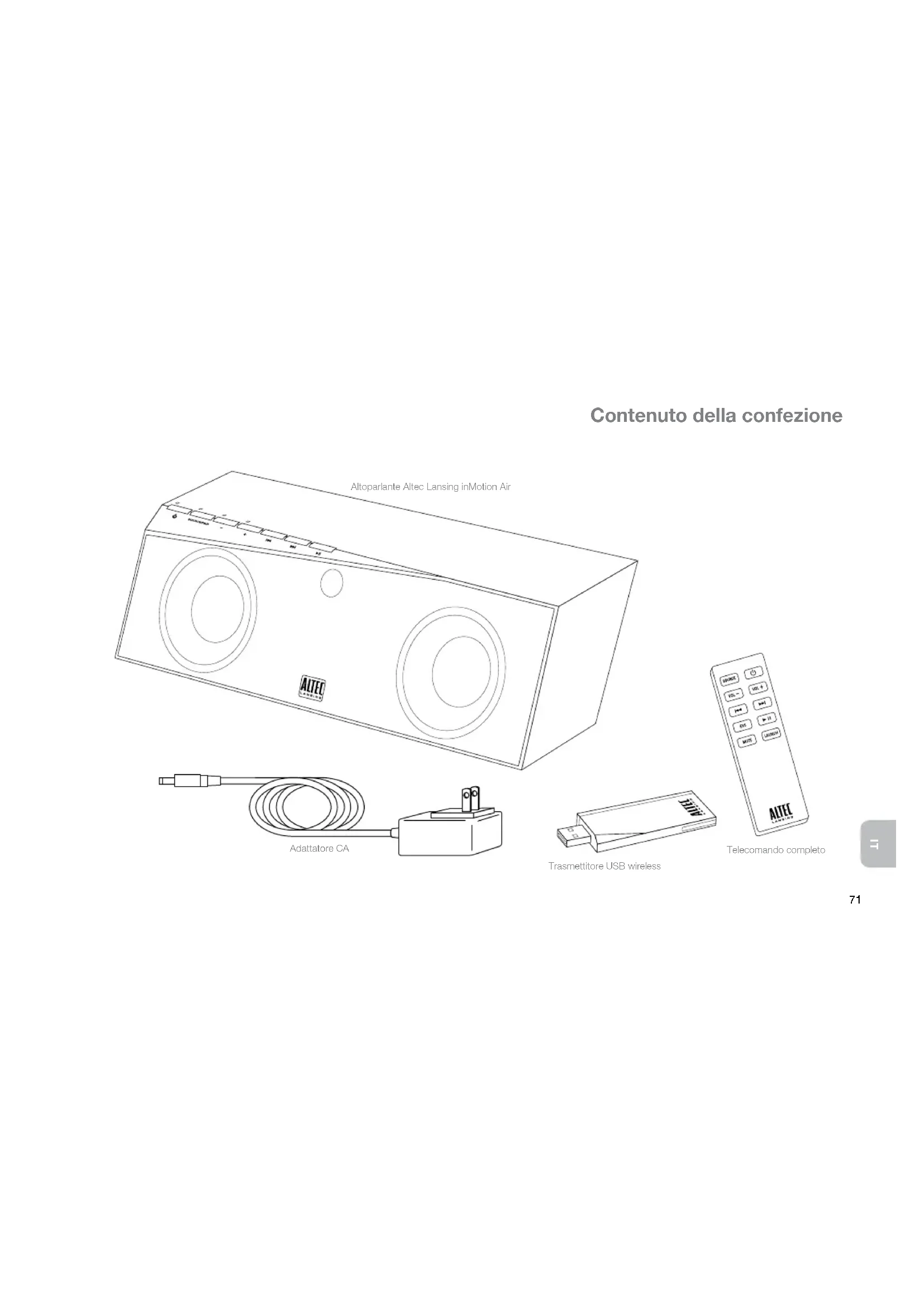Contenuto della confezione Adattatore CA Telecomando completo Altoparlante Altec Lansing inMotionAir Trasmettitore USB wireless72 Funzioni dell’altoparlante e indicatori Pulsante Brano precedente Pulsante Aumento volume LED di stato Bluetooth Pulsante Play/Pausa LED sorgente Bluetooth LED ingresso ausiliario LED di accensione Pulsante selezione sorgente e associazione Pulsante Riduzione volume Pulsante Brano successivo Pulsante On/Off Presa d’ingresso per adattatore CA Presa ausiliaria per lettori audio che non dispongono di connessione Bluetooth Interruttore “trasporto e conservazione”73