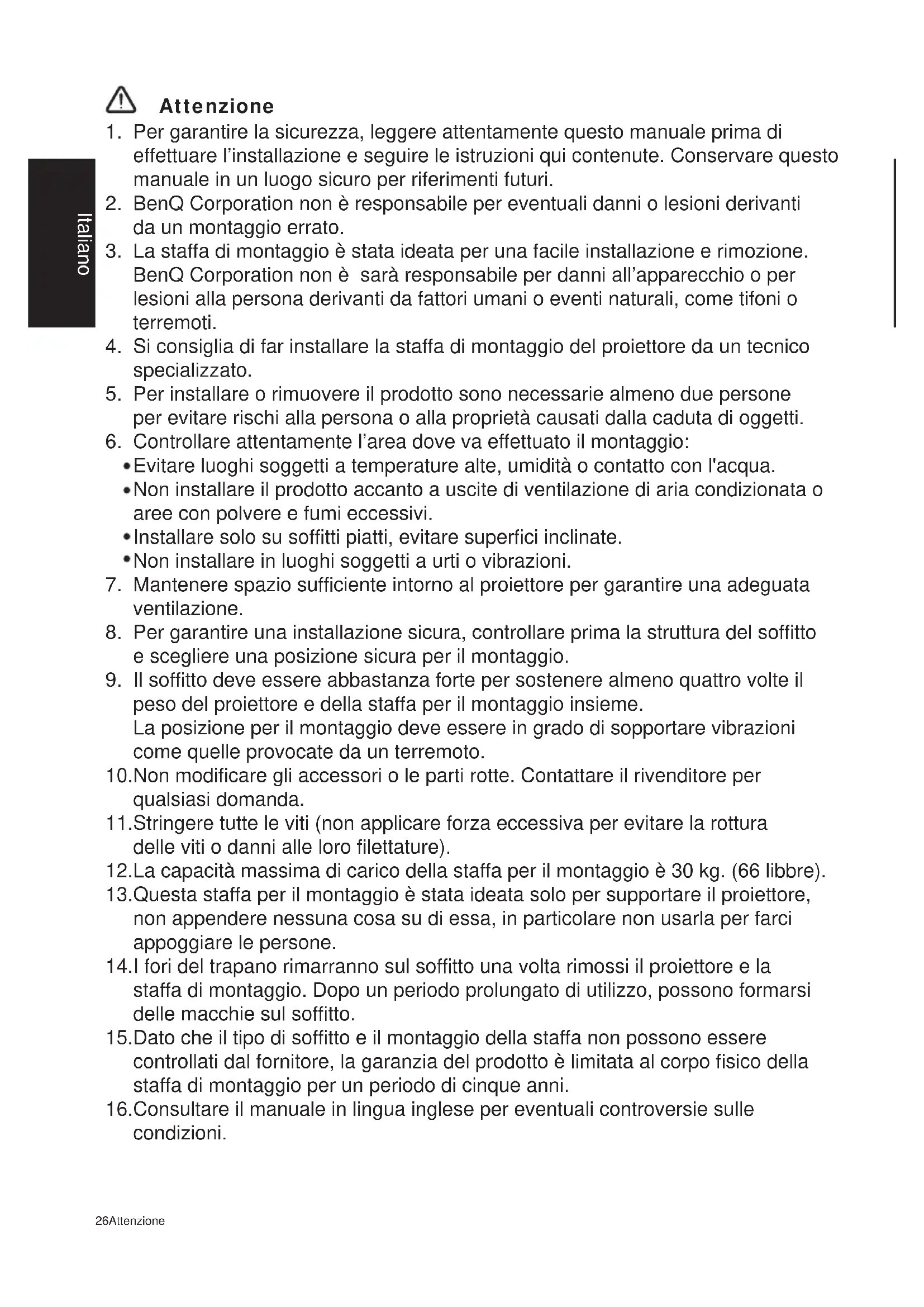 peso del proiettore e della staffa per il montaggio insieme. La posizione per il montaggio deve essere in grado di sopportare vibrazioni come quelle provocate da un terremoto. 10.Non modificare gli accessori o le parti rotte. Contattare il rivenditore per qualsiasi domanda. 11.Stringere tutte le viti (non applicare forza eccessiva per evitare la rottura delle viti o danni alle loro filettature). 12.La capacità massima di carico della staffa per il montaggio è 30 kg. (66 libbre). 13.Questa staffa per il montaggio è stata ideata solo per supportare il proiettore, non appendere nessuna cosa su di essa, in particolare non usarla per farci appoggiare le persone. 14.I fori del trapano rimarranno sul soffitto una volta rimossi il proiettore e la staffa di montaggio. Dopo un periodo prolungato di utilizzo, possono formarsi delle macchie sul soffitto. 15.Dato che il tipo di soffitto e il montaggio della staffa non possono essere controllati dal fornitore, la garanzia del prodotto è limitata al corpo fisico della staffa di montaggio per un periodo di cinque anni. 16.Consultare il manuale in lingua inglese per eventuali controversie sulle condizioni. Attenzione 26Attenzione Italiano1