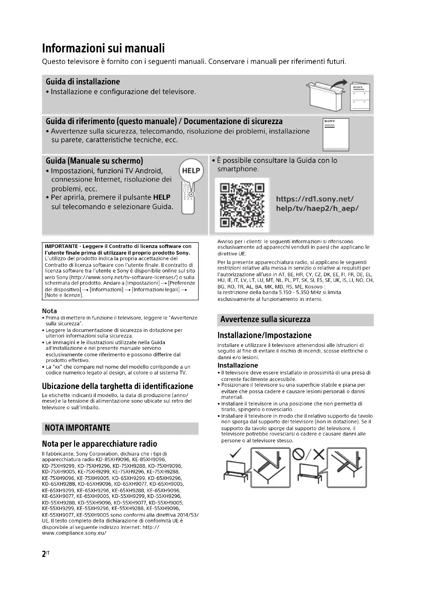 - Prima di mettere in funzione il televisore, leggere le “Avvertenze sulla sicurezza”.• Leggere la documentazione di sicurezza in dotazione per ulteriori informazioni sulla sicurezza.• Le immagini e le illustrazioni utilizzate nella Guida all’installazione e nel presente manuale servono esclusivamente come riferimento e possono differire dal prodotto effettivo.• La “xx” che compare nel nome del modello corrisponde a un codice numerico legato al design, al colore o al sistema TV. Ubicazione della targhetta di identificazione Le etichette indicanti il modello, la data di produzione (anno/mese) e la tensione di alimentazione sono ubicate sul retro del televisore o sull’imballo. NOTA IMPORTANTE Nota per le apparecchiature radio Il fabbricante, Sony Corporation, dichiara che i tipi di apparecchiatura radio KD-85XH9096, KE-85XH9096, KD-75XH9299, KD-75XH9296, KD-75XH9288, KD-75XH9096, KD-75XH9005, KE-75XH9299, KE-75XH9296, KE-75XH9288, KE-75XH9096, KE-75XH9005, KD-65XH9299, KD-65XH9296, KD-65XH9288, KD-65XH9096, KD-65XH9077, KD-65XH9005, KE-65XH9299, KE-65XH9296, KE-65XH9288, KE-65XH9096, KE-65XH9077, KE-65XH9005, KD-55XH9299, KD-55XH9296, KD-55XH9288, KD-55XH9096, KD-55XH9077, KD-55XH9005, KE-55XH9299, KE-55XH9296, KE-55XH9288, KE-55XH9096, KE-55XH9077, KE-55XH9005 sono conformi alla direttiva 2014/53/UE. Il testo completo della dichiarazione di conformità UE è disponibile al seguente indirizzo Internet: http://www.compliance.sony.eu/Avviso per i clienti: le seguenti informazioni si riferiscono esclusivamente ad apparecchi venduti in paesi che applicano le direttive UE.Per la presente apparecchiatura radio, si applicano le seguenti restrizioni relative alla messa in servizio o relative ai requisiti per l’autorizzazione all’uso in AT, BE, HR, CY, CZ, DK, EE, FI, FR, DE, EL, HU, IE, IT, LV, LT, LU, MT, NL, PL, PT, SK, SI, ES, SE, UK, IS, LI, NO, CH, BG, RO, TR, AL, BA, MK, MD, RS, ME, Kosovo :la restrizione della banda 5.150 - 5.350 MHz si limita esclusivamente al funzionamento in interni. Avvertenze sulla sicurezza Installazione/Impostazione Installare e utilizzare il televisore attenendosi alle istruzioni di seguito al fine di evitare il rischio di incendi, scosse elettriche o danni e/o lesioni. Installazione