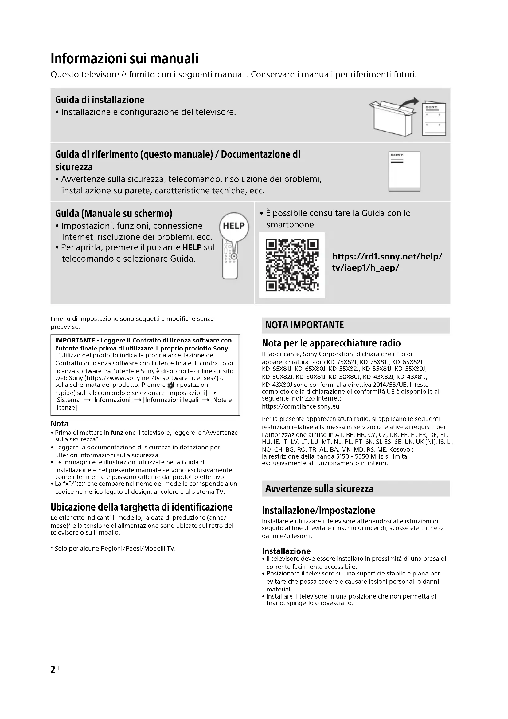 - È possibile consultare la Guida con lo smartphone. https://rd1.sony.net/help/ tv/iaep1/h_aep/ IMPORTANTE - Leggere il Contratto di licenza software con l’utente finale prima di utilizzare il proprio prodotto Sony. L’utilizzo del prodotto indica la propria accettazione del Contratto di licenza software con l’utente finale. Il contratto di licenza software tra l’utente e Sony è disponibile online sul sito web Sony (https://www.sony.net/tv-software-licenses/) o sulla schermata del prodotto. Premere (Impostazioni rapide) sul telecomando e selezionare [Impostazioni] [Sistema] [Informazioni] [Informazioni legali] [Note e licenze]. NOTA IMPORTANTE Avvertenze sulla sicurezza3