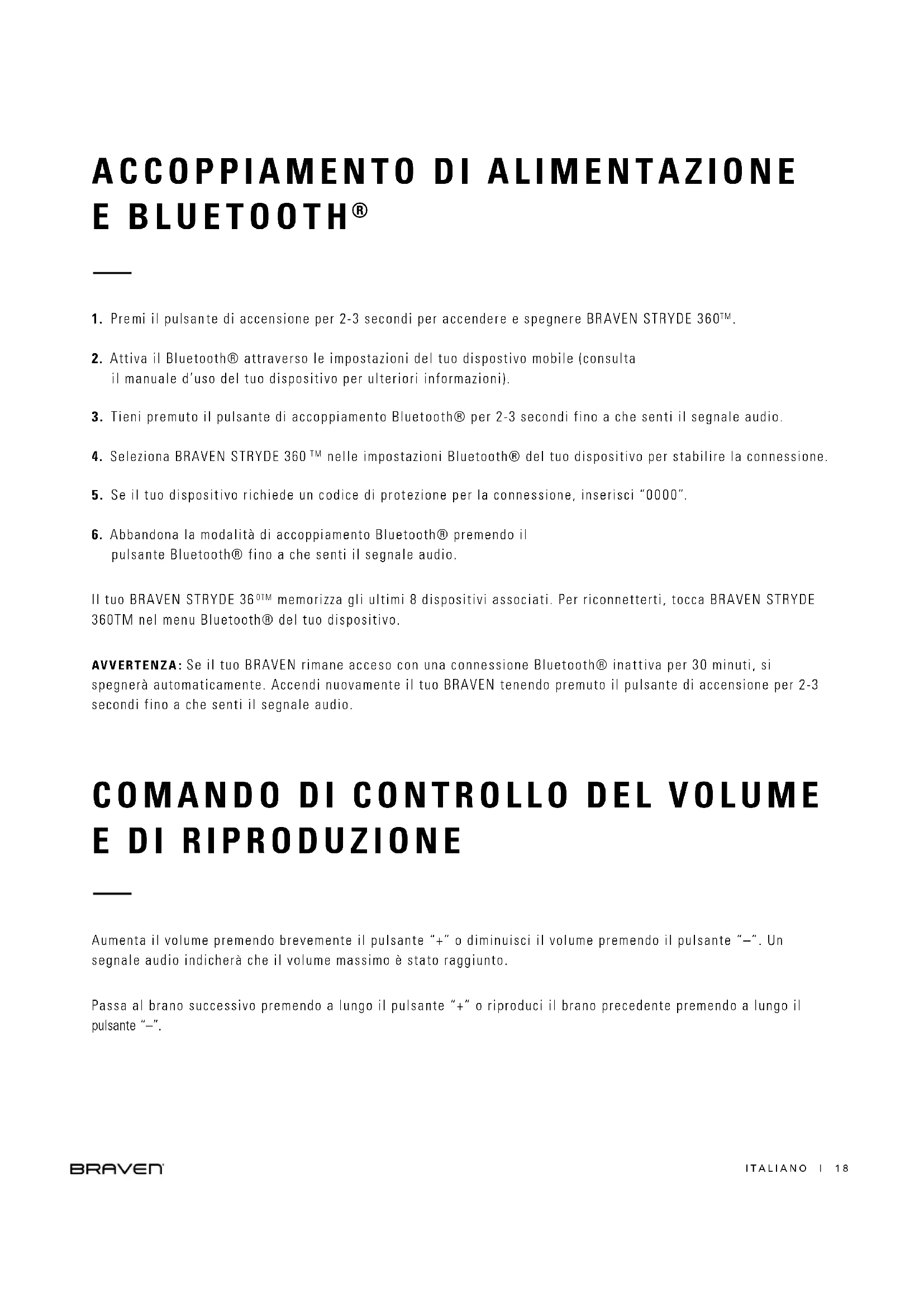 pulsante Bluetooth® fino a che senti il segnale audio. Il tuo BRAVEN STRYDE 36 0TM memorizza gli ultimi 8 dispositivi associati. Per riconnetterti, tocca BRAVEN STRYDE 360TM nel menu Bluetooth® del tuo dispositivo. AVVERTENZA: Se il tuo BRAVEN rimane acceso con una connessione Bluetooth® inattiva per 30 minuti, si spegnerà automaticamente. Accendi nuovamente il tuo BRAVEN tenendo premuto il pulsante di accensione per 2-3 secondi fino a che senti il segnale audio. Aumenta il volume premendo brevemente il pulsante “+” o diminuisci il volume premendo il pulsante “–”. Un segnale audio indicherà che il volume massimo è stato raggiunto. Passa al brano successivo premendo a lungo il pulsante “+” o riproduci il brano precedente premendo a lungo il pulsante “–”.