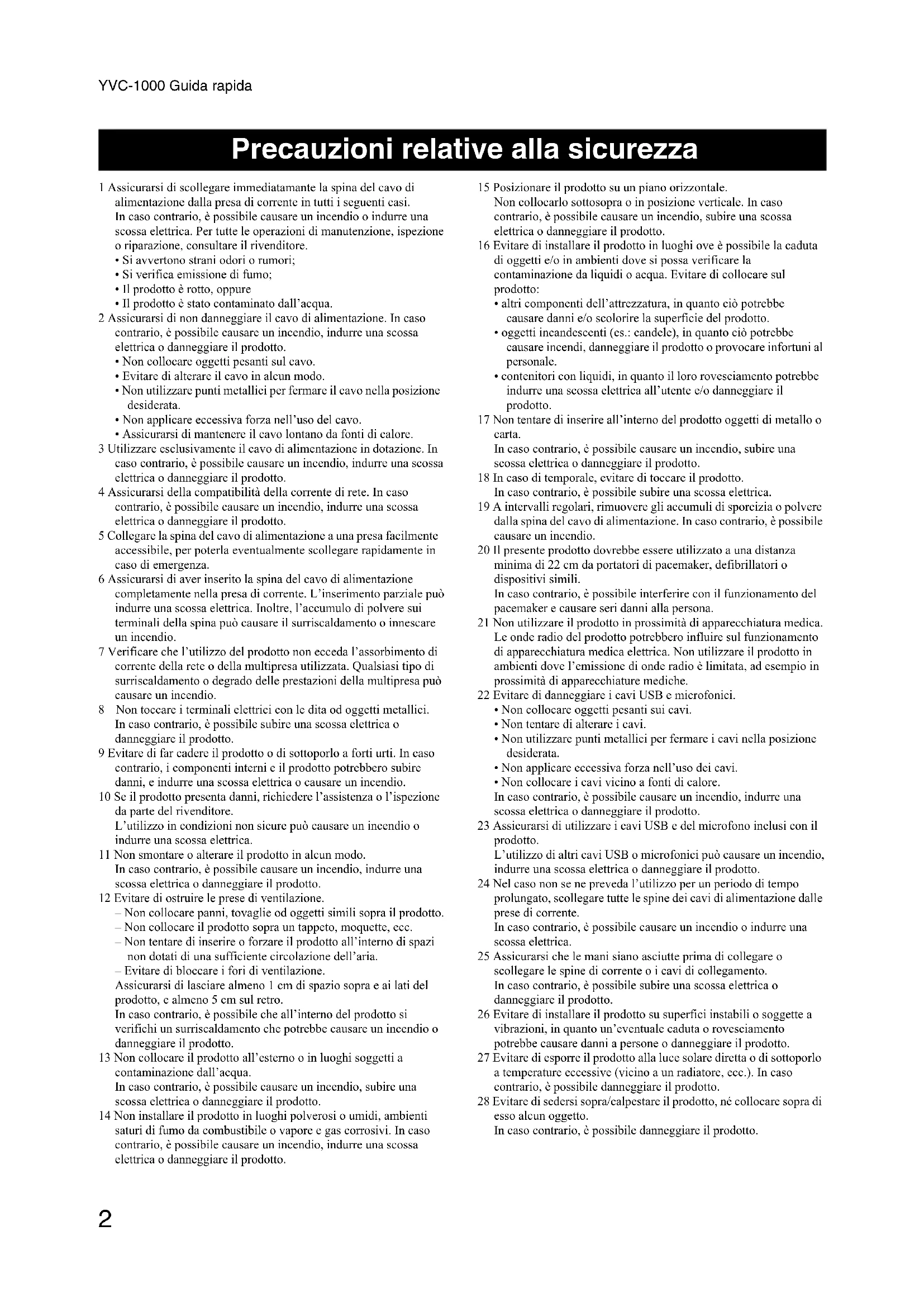 - Non collocare i cavi vicino a fonti di calore. In caso contrario, è possibile causare un incendio, indurre una scossa elettrica o danneggiare il prodotto. 23 Assicurarsi di utilizzare i cavi USB e del microfono inclusi con il prodotto. L’utilizzo di altri cavi USB o microfonici può causare un incendio, indurre una scossa elettrica o danneggiare il prodotto. 24 Nel caso non se ne preveda l’utilizzo per un periodo di tempo prolungato, scollegare tutte le spine dei cavi di alimentazione dalle prese di corrente. In caso contrario, è possibile causare un incendio o indurre una scossa elettrica. 25 Assicurarsi che le mani siano asciutte prima di collegare o scollegare le spine di corrente o i cavi di collegamento. In caso contrario, è possibile subire una scossa elettrica o danneggiare il prodotto. 26 Evitare di installare il prodotto su superfici instabili o soggette a vibrazioni, in quanto un’eventuale caduta o rovesciamento potrebbe causare danni a persone o danneggiare il prodotto. 27 Evitare di esporre il prodotto alla luce solare diretta o di sottoporlo a temperature eccessive (vicino a un radiatore, ecc.). In caso contrario, è possibile danneggiare il prodotto. 28 Evitare di sedersi sopra/calpestare il prodotto, né collocare sopra di esso alcun oggetto. In caso contrario, è possibile danneggiare il prodotto. Precauzioni relative alla sicurezzaYVC-1000 Guida rapida