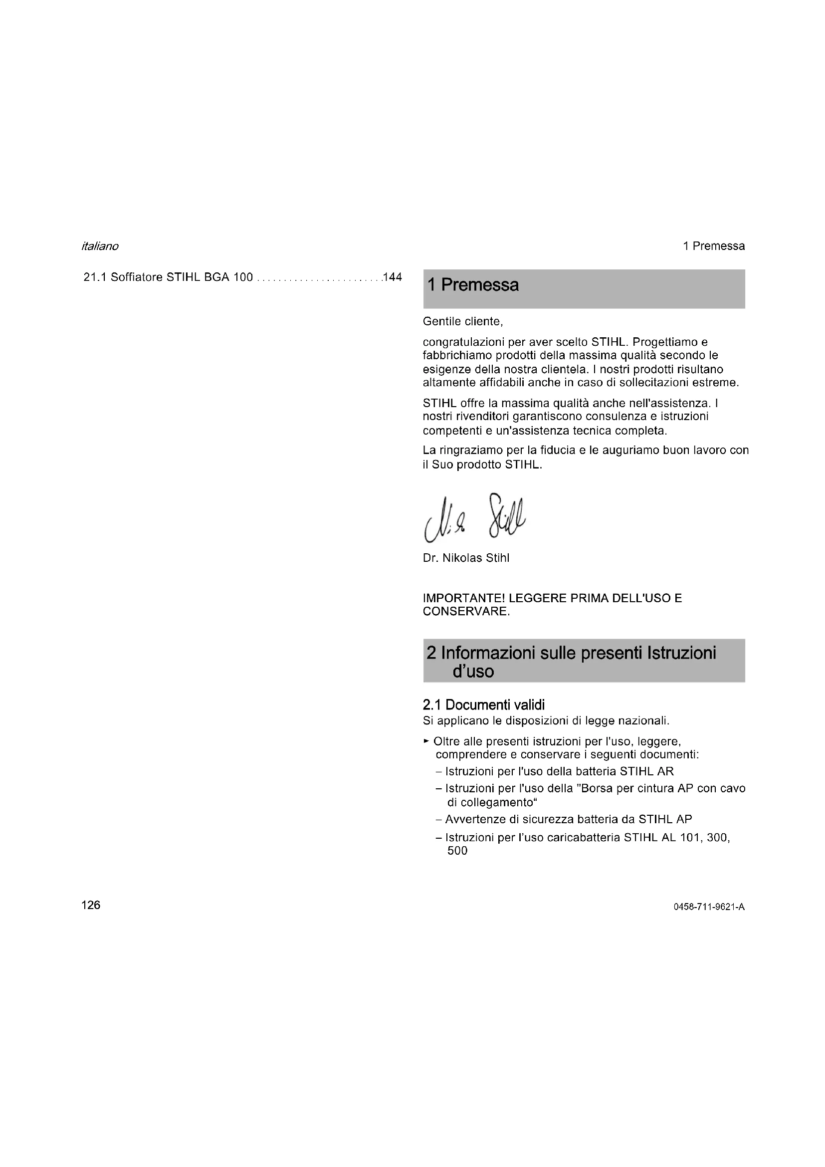 1 Premessa 2 Informazioni sulle presenti Istruzioni d’uso0458-711-9621-A