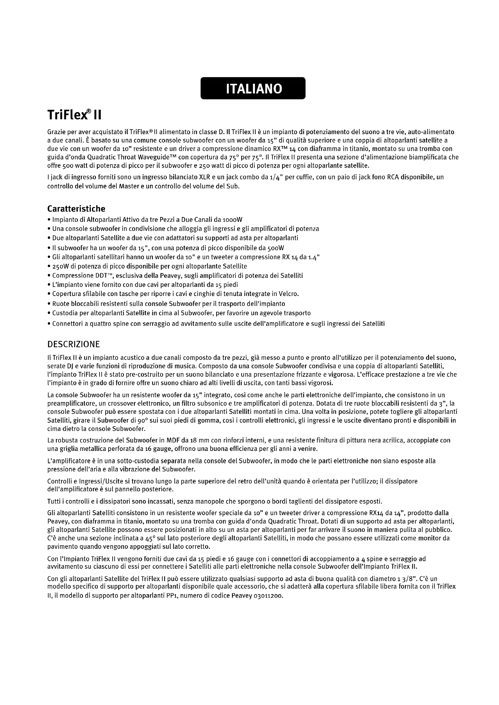 - Connettori a quattro spine con serraggio ad avvitamento sulle uscite dell’amplificatore e sugli ingressi dei Satelliti DESCRIZIONE Il TriFlex II è un impianto acustico a due canali composto da tre pezzi, già messo a punto e pronto all’utilizzo per il potenziamento del suono, serate DJ e varie funzioni di riproduzione di musica. Composto da una console Subwoofer condivisa e una coppia di altoparlanti Satelliti, l’impianto TriFlex II è stato pre-costruito per un suono bilanciato e una presentazione frizzante e vigorosa. L’efficace prestazione a tre vie che l’impianto è in grado di fornire offre un suono chiaro ad alti livelli di uscita, con tanti bassi vigorosi. La console Subwoofer ha un resistente woofer da 15” integrato, così come anche le parti elettroniche dell’impianto, che consistono in un preamplificatore, un crossover elettronico, un filtro subsonico e tre amplificatori di potenza. Dotata di tre ruote bloccabili resistenti da 3”, la console Subwoofer può essere spostata con i due altoparlanti Satelliti montati in cima. Una volta in posizione, potete togliere gli altoparlanti Satelliti, girare il Subwoofer di 90° sui suoi piedi di gomma, così i controlli elettronici, gli ingressi e le uscite diventano pronti e disponibili in cima dietro la console Subwoofer. La robusta costruzione del Subwoofer in MDF da 18 mm con rinforzi interni, e una resistente finitura di pittura nera acrilica, accoppiate con una griglia metallica perforata da 16 gauge, offrono una buona efficienza per gli anni a venire. L’amplificatore è in una sotto-custodia separata nella console del Subwoofer, in modo che le parti elettroniche non siano esposte alla pressione dell’aria e alla vibrazione del Subwoofer. Controlli e Ingressi/Uscite si trovano lungo la parte superiore del retro dell’unità quando è orientata per l’utilizzo; il dissipatore dell’amplificatore è sul pannello posteriore. Tutti i controlli e i dissipatori sono incassati, senza manopole che sporgono o bordi taglienti del dissipatore esposti. Gli altoparlanti Satelliti consistono in un resistente woofer speciale da 10” e un tweeter driver a compressione RX14 da 14”, prodotto dalla Peavey, con diaframma in titanio, montato su una tromba con guida d’onda Quadratic Throat. Dotati di un supporto ad asta per altoparlanti, gli altoparlanti Satellite possono essere posizionati in alto su un asta per altoparlanti per far arrivare il suono in maniera pulita al pubblico. C’è anche una sezione inclinata a 45° sul lato posteriore degli altoparlanti Satelliti, in modo che possano essere utilizzati come monitor da pavimento quando vengono appoggiati sul lato corretto. Con l’Impianto TriFlex II vengono forniti due cavi da 15 piedi e 16 gauge con i connettori di accoppiamento a 4 spine e serraggio ad avvitamento su ciascuno di essi per connettere i Satelliti alle parti elettroniche nella console Subwoofer dell’Impianto TriFlex II. Con gli altoparlanti Satellite del TriFlex II può essere utilizzato qualsiasi supporto ad asta di buona qualità con diametro 1 3/8”. C’è un modello specifico di supporto per altoparlanti disponibile quale accessorio, che si adatterà alla copertura sfilabile libera fornita con il TriFlex II, il modello di supporto per altoparlanti PP1, numero di codice Peavey 03011200. ITALIANO3 APPLLICAZIONI L’Impianto Peavey TriFlex