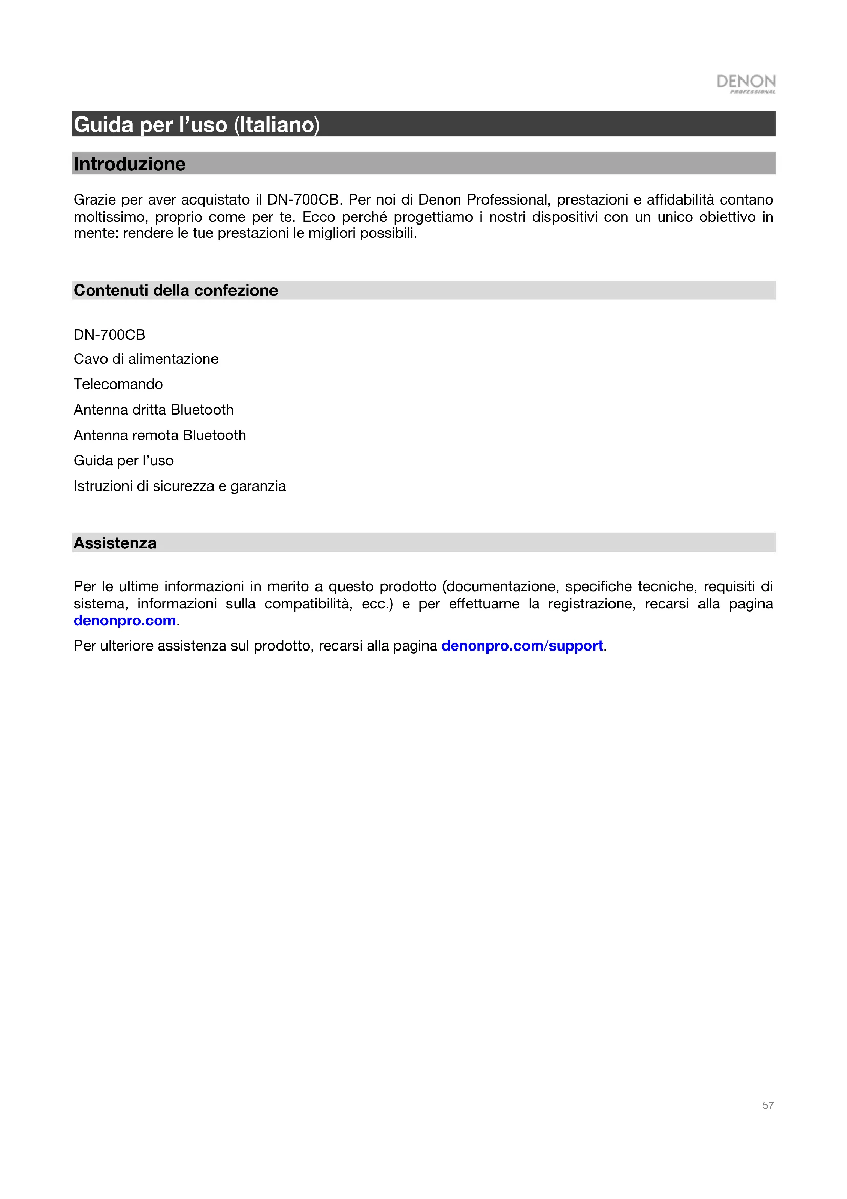 Assistenza Per le ultime informazioni in merito a questo prodotto (documentazione, specifiche tecniche, requisiti di sistema, informazioni sulla compatibilità, ecc.) e per effettuarne la registrazione, recarsi alla pagina denonpro.com. Per ulteriore assistenza sul prodotto, recarsi alla pagina denonpro.com/support.58