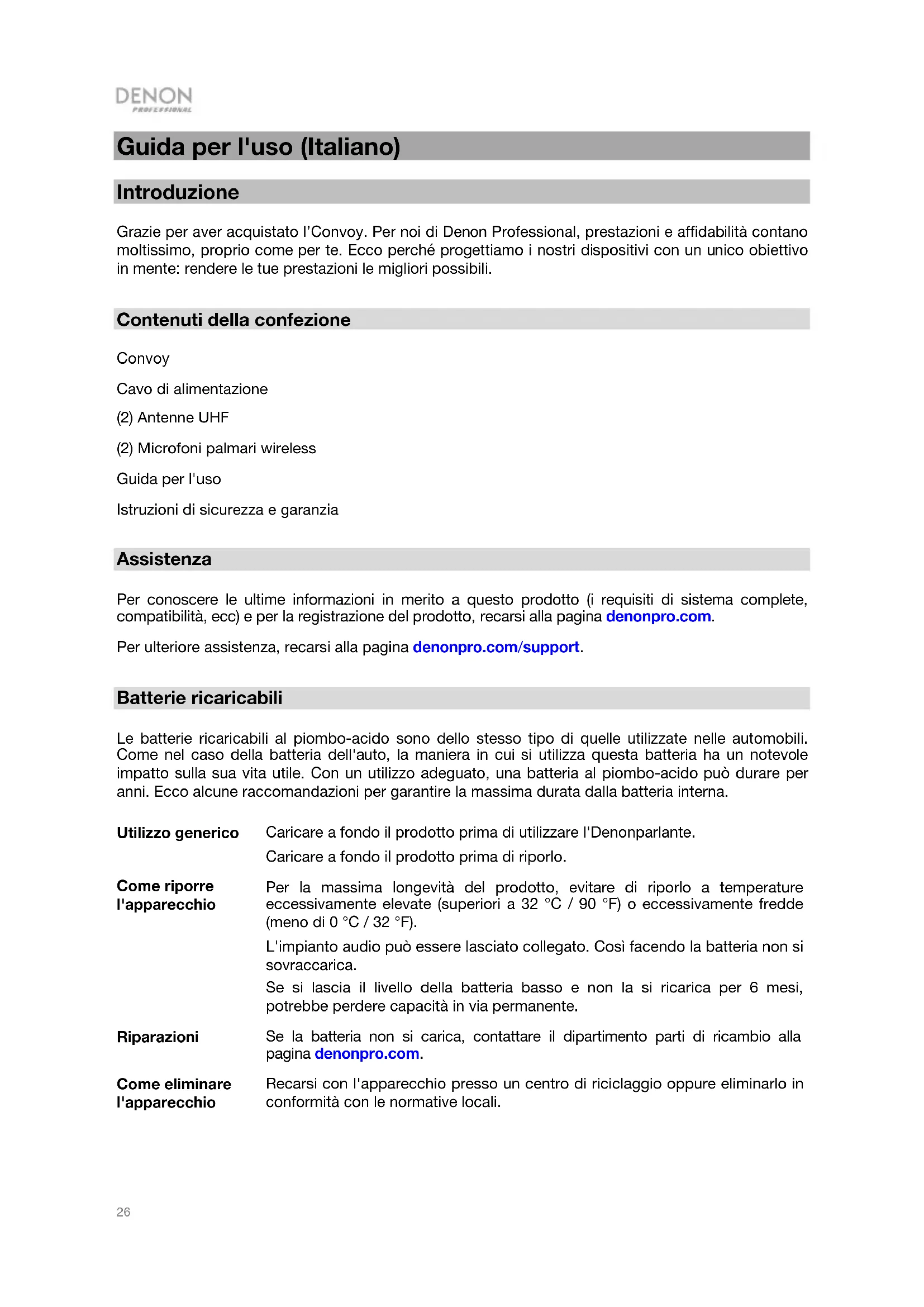 - Réinitialisez la connexion Bluetooth sur l’appareil audio en désactivant et réactivant la connexion Bluetooth. Vous pouvez effectuer ceci à partir du menu Bluetooth dans les Réglages de votre smartphone ou autre appareil audio. Si cela ne fonctionne pas et que vous avez déjà connecté votre appareil à la Convoy auparavant, veuillez rechercher la Convoy dans la liste des appareils disponibles ou précédemment connectés dans le menu Bluetooth de votre appareil audio, puis appuyer sur l'icône engrenage ou « i » située à côté de « Oublier cet appareil ». Mettez la Convoy hors tension et de nouveau sous tension et réessayez de la jumeler une fois qu’elle apparaît dans la liste des appareils disponibles. Remarque : Si la Convoy a été récemment jumelée à un autre appareil audio qui est toujours dans son champ de portée, il se peut que vous deviez répéter ce processus avec cet appareil audio afin de supprimer la connexion.26 Guida per l'uso (Italiano) Introduzione Grazie per aver acquistato l’Convoy. Per noi di Denon Professional, prestazioni e affidabilità contano moltissimo, proprio come per te. Ecco perché progettiamo i nostri dispositivi con un unico obiettivo in mente: rendere le tue prestazioni le migliori possibili. Contenuti della confezione Convoy Cavo di alimentazione (2) Antenne UHF (2) Microfoni palmari wireless Guida per l'uso Istruzioni di sicurezza e garanzia Assistenza Per conoscere le ultime informazioni in merito a questo prodotto (i requisiti di sistema complete, compatibilità, ecc) e per la registrazione del prodotto, recarsi alla pagina denonpro.com. Per ulteriore assistenza, recarsi alla pagina denonpro.com/support. Batterie ricaricabili Le batterie ricaricabili al piombo-acido sono dello stesso tipo di quelle utilizzate nelle automobili. Come nel caso della batteria dell'auto, la maniera in cui si utilizza questa batteria ha un notevole impatto sulla sua vita utile. Con un utilizzo adeguato, una batteria al piombo-acido può durare per anni. Ecco alcune raccomandazioni per garantire la massima durata dalla batteria interna. Utilizzo generico Caricare a fondo il prodotto prima di utilizzare l'Denonparlante. Caricare a fondo il prodotto prima di riporlo. Come riporre l'apparecchio Per la massima longevità del prodotto, evitare di riporlo a temperature eccessivamente elevate (superiori a 32 °C / 90 °F) o eccessivamente fredde (meno di 0 °C / 32 °F). L'impianto audio può essere lasciato collegato. Così facendo la batteria non si sovraccarica. Se si lascia il livello della batteria basso e non la si ricarica per 6 mesi, potrebbe perdere capacità in via permanente. Riparazioni Se la batteria non si carica, contattare il dipartimento parti di ricambio alla pagina denonpro.com. Come eliminare l'apparecchio Recarsi con l'apparecchio presso un centro di riciclaggio oppure eliminarlo in conformità con le normative locali.27 Importanti precauzioni di sicurezza Nota bene: Denon Professional e inMusic declinano qualsiasi responsabilità per l'uso dei loro prodotti o per l'utilizzo errato delle presenti informazioni a qualsiasi scopo. Denon Professional e inMusic non sono responsabili per il cattivo utilizzo dei loro prodotti causato dalla mancata conformità con le procedure di ispezione e manutenzione. Fare riferimento al manuale di sicurezza e garanzia per maggiori informazioni. Avvertenza: Per ridurre il rischio di scossa elettrica, non collegare il Convoy a una presa di corrente quando la griglia è stata rimossa.